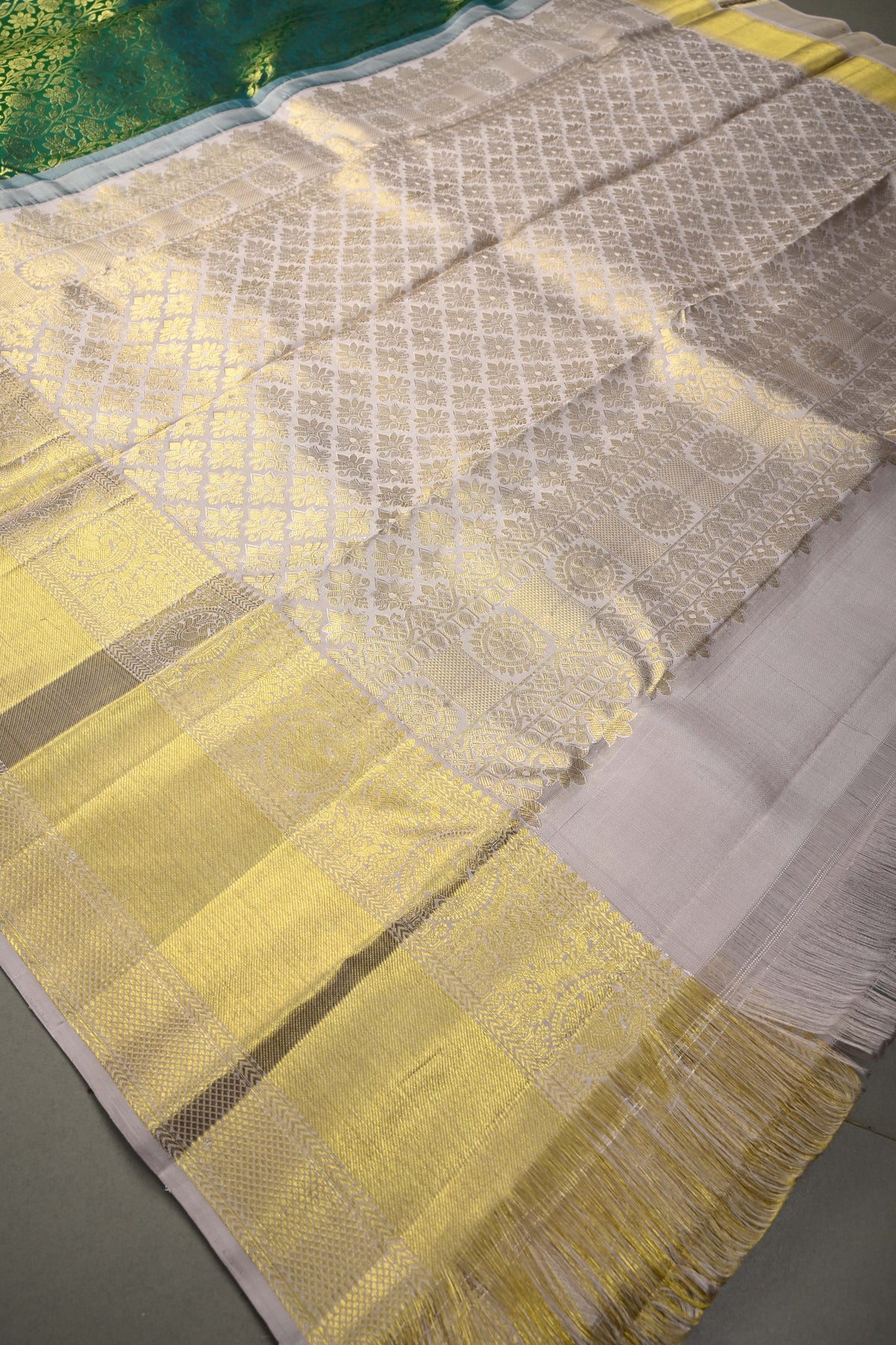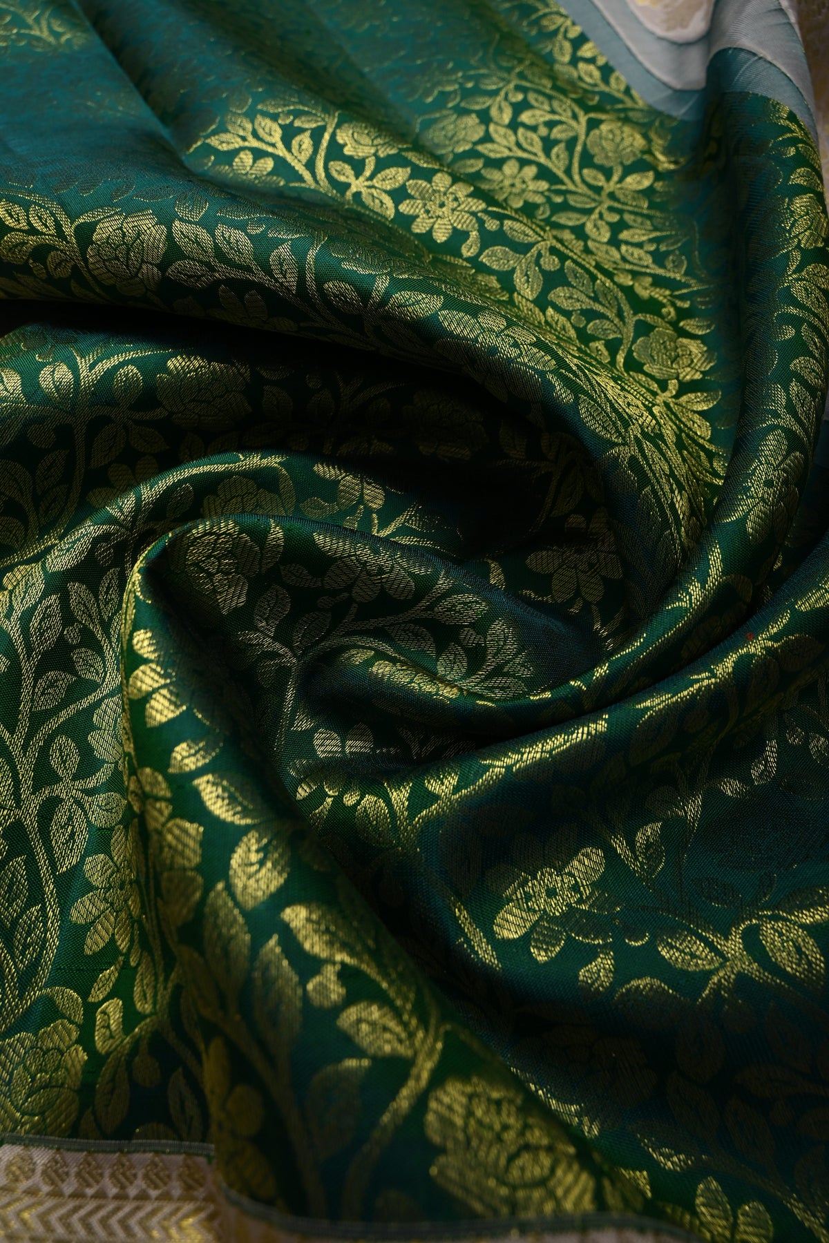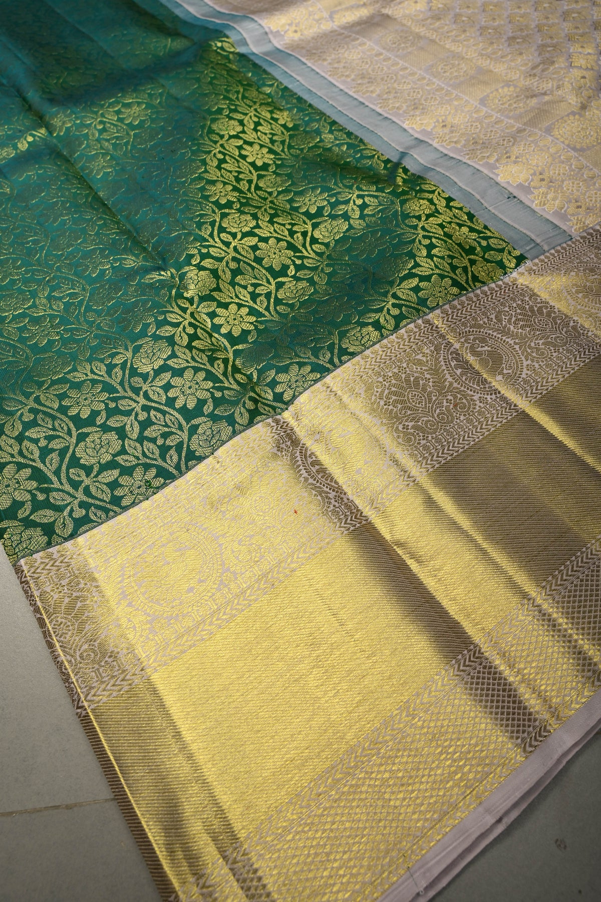 Celebrate timeless heritage with this Green Pure Kanjivaram Silk Saree with Floral Zari Brocade Jaal and Contrast Zari Border. Woven from pure Kanjivaram silk, this saree offers a texture, luminous sheen, and a drape that embodies traditional South Indian craftsmanship.