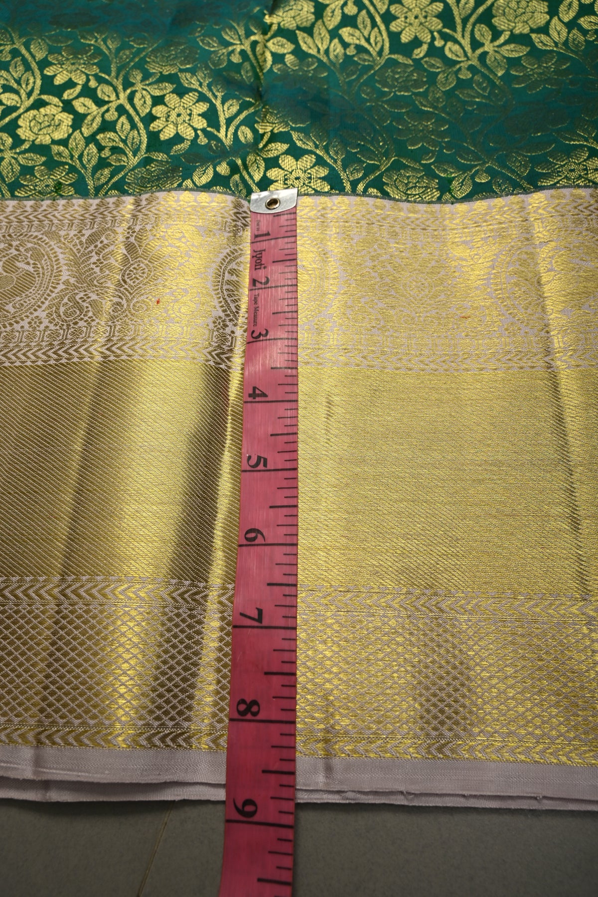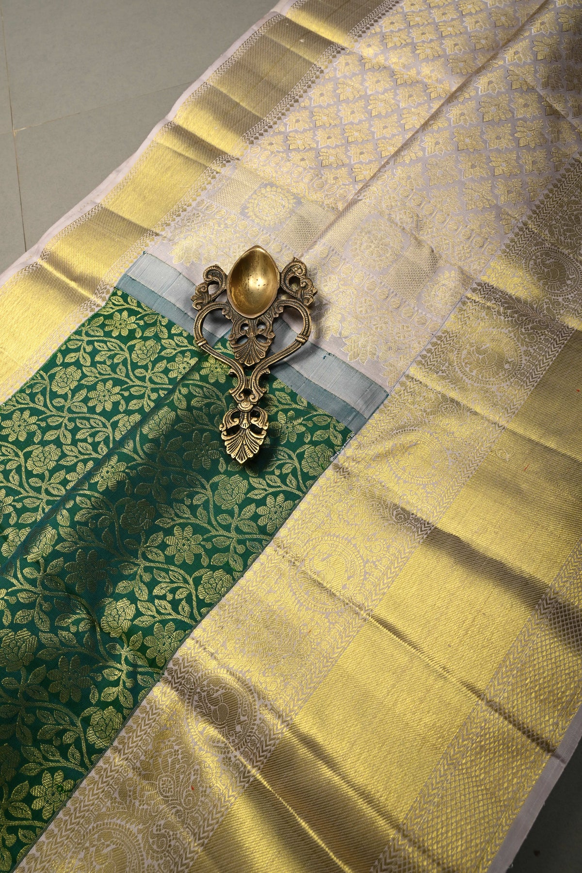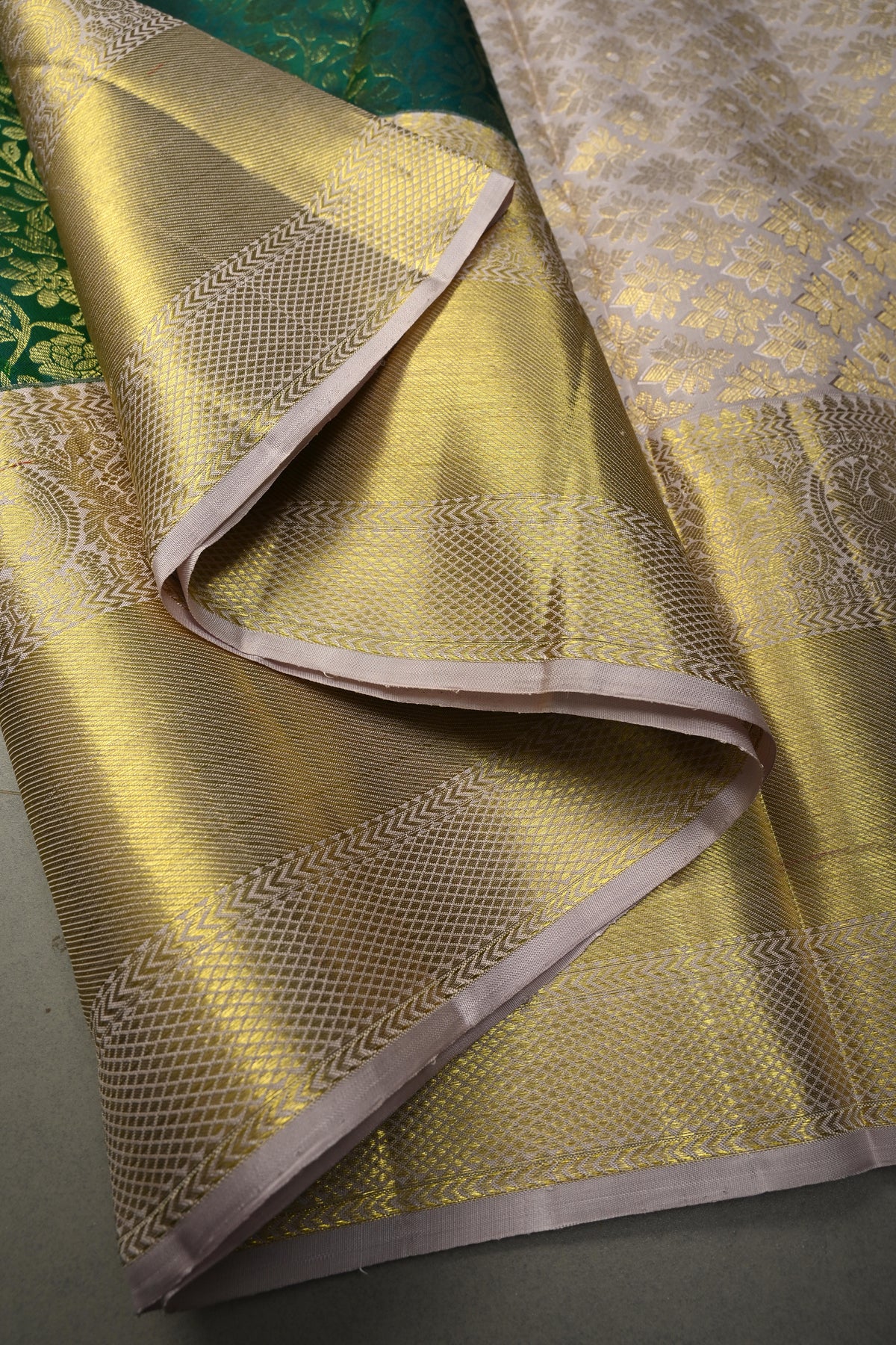Celebrate timeless heritage with this Green Pure Kanjivaram Silk Saree with Floral Zari Brocade Jaal and Contrast Zari Border. Woven from pure Kanjivaram silk, this saree offers a texture, luminous sheen, and a drape that embodies traditional South Indian craftsmanship.