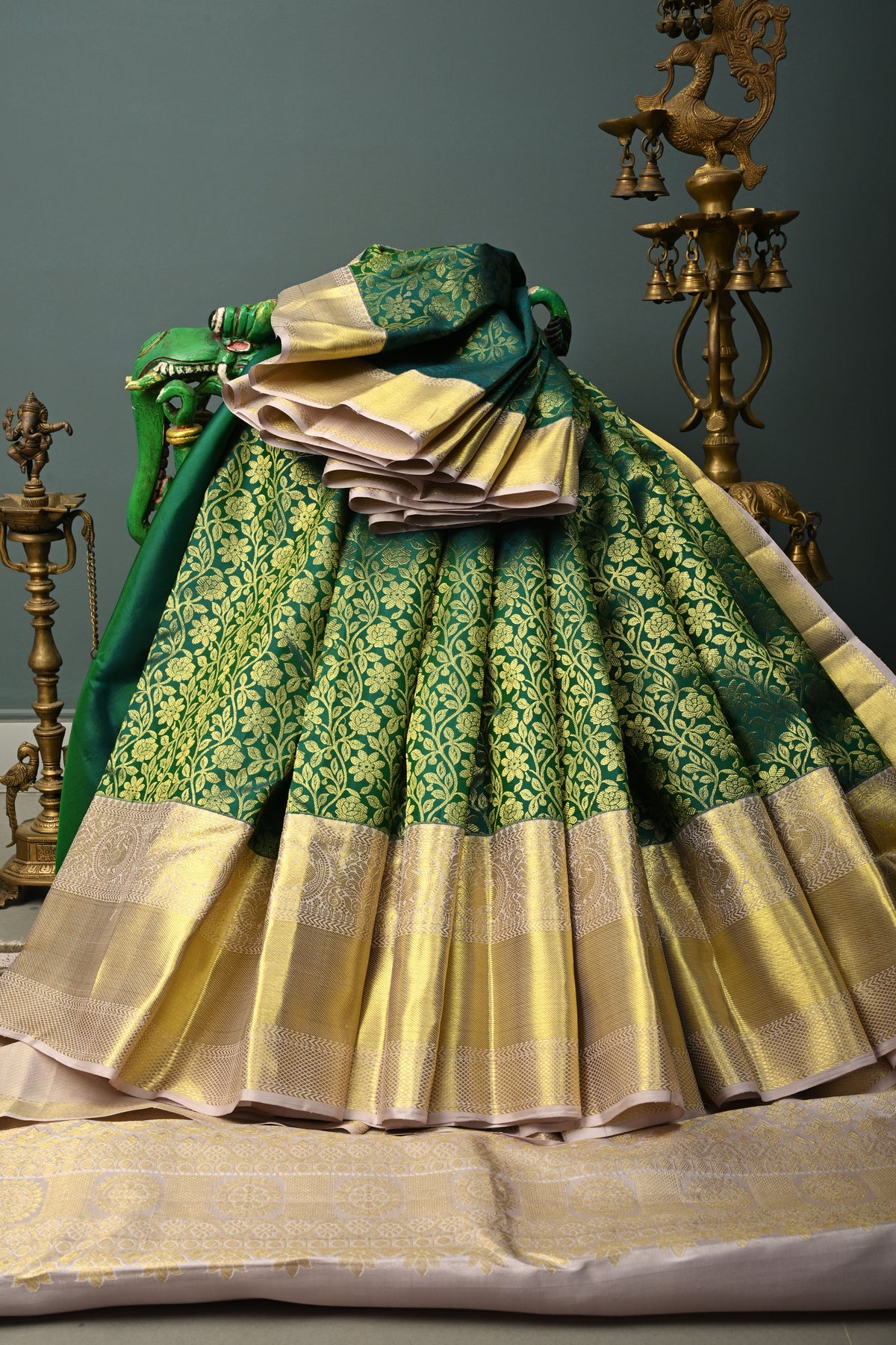 The vibrant green base is beautifully adorned with an intricate floral zari brocade jaal, creating an opulent all-over pattern that radiates elegance. The striking contrast zari border frames the saree gracefully, enhancing its grandeur and festive appeal.