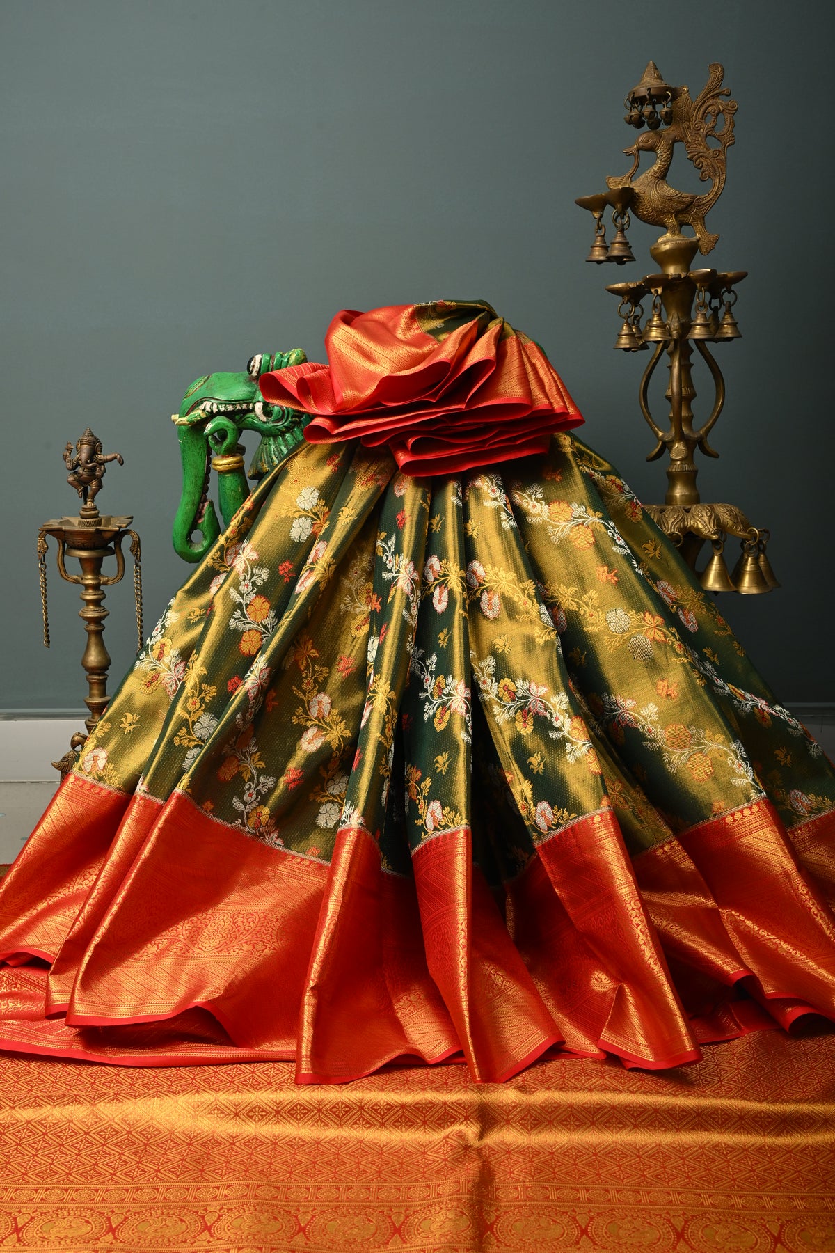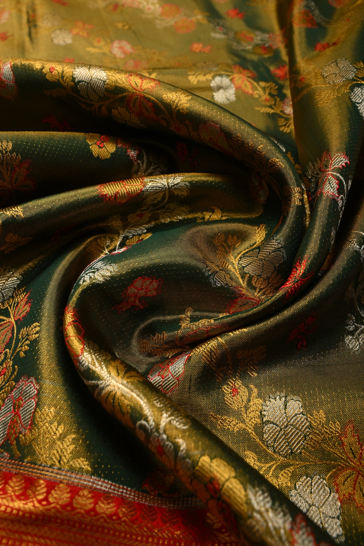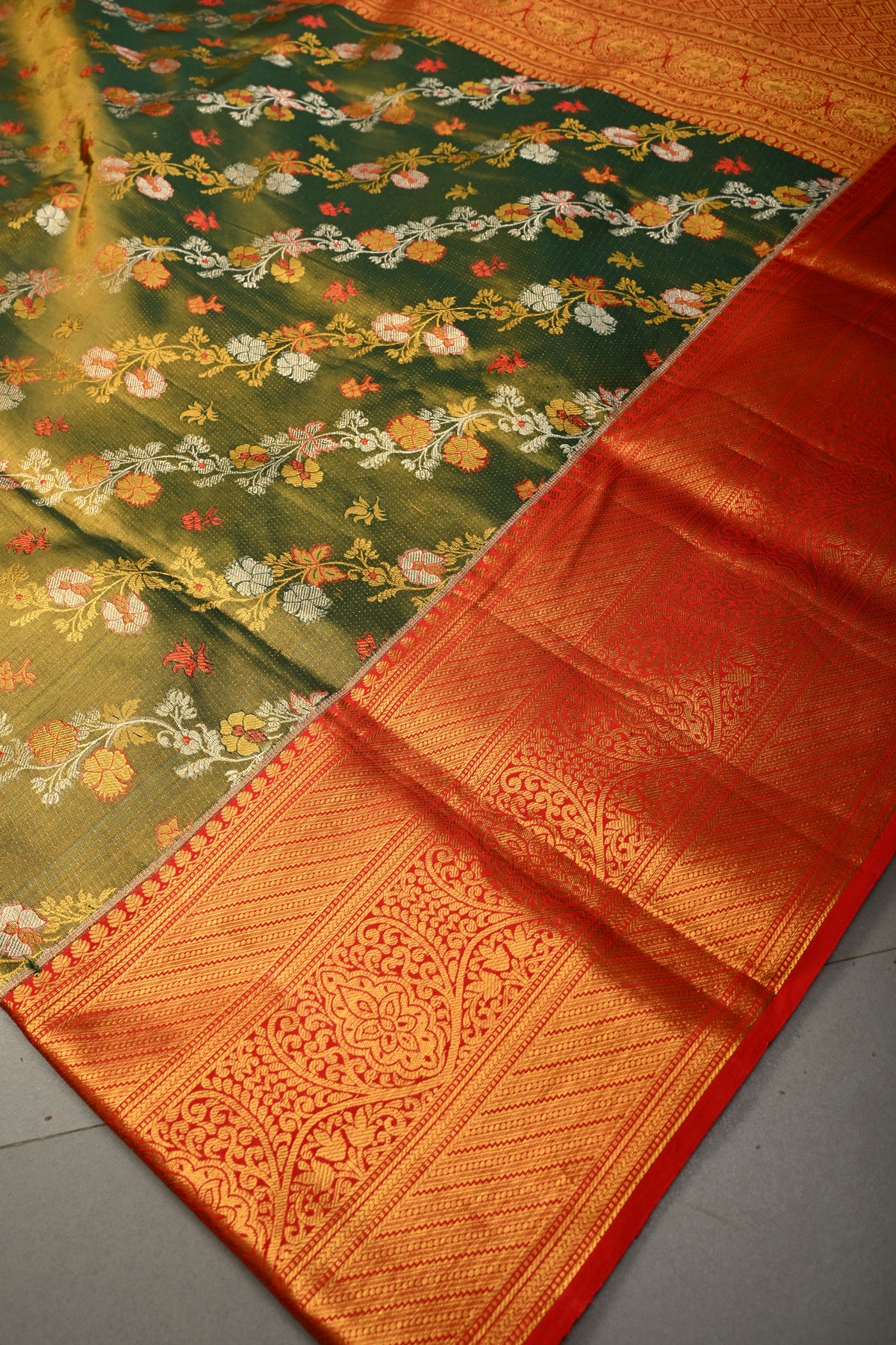 Step into elegance with this Green Pure Kanjivaram Tissue Silk Saree with Leheria Meenakari Floral Jaal and Contrast Zari Border. Crafted from pure Kanjivaram tissue silk, this saree offers a lightweight, drape with a soft sheen and smooth, graceful texture.