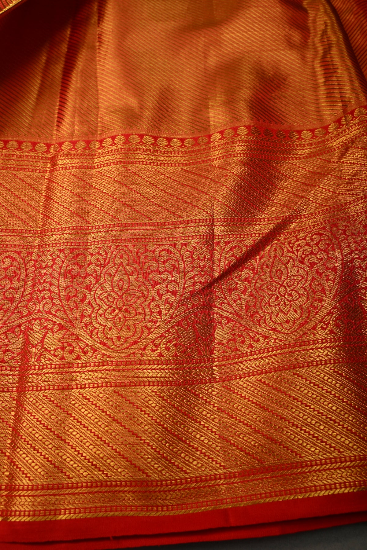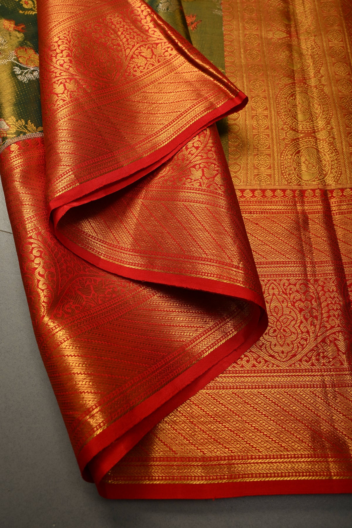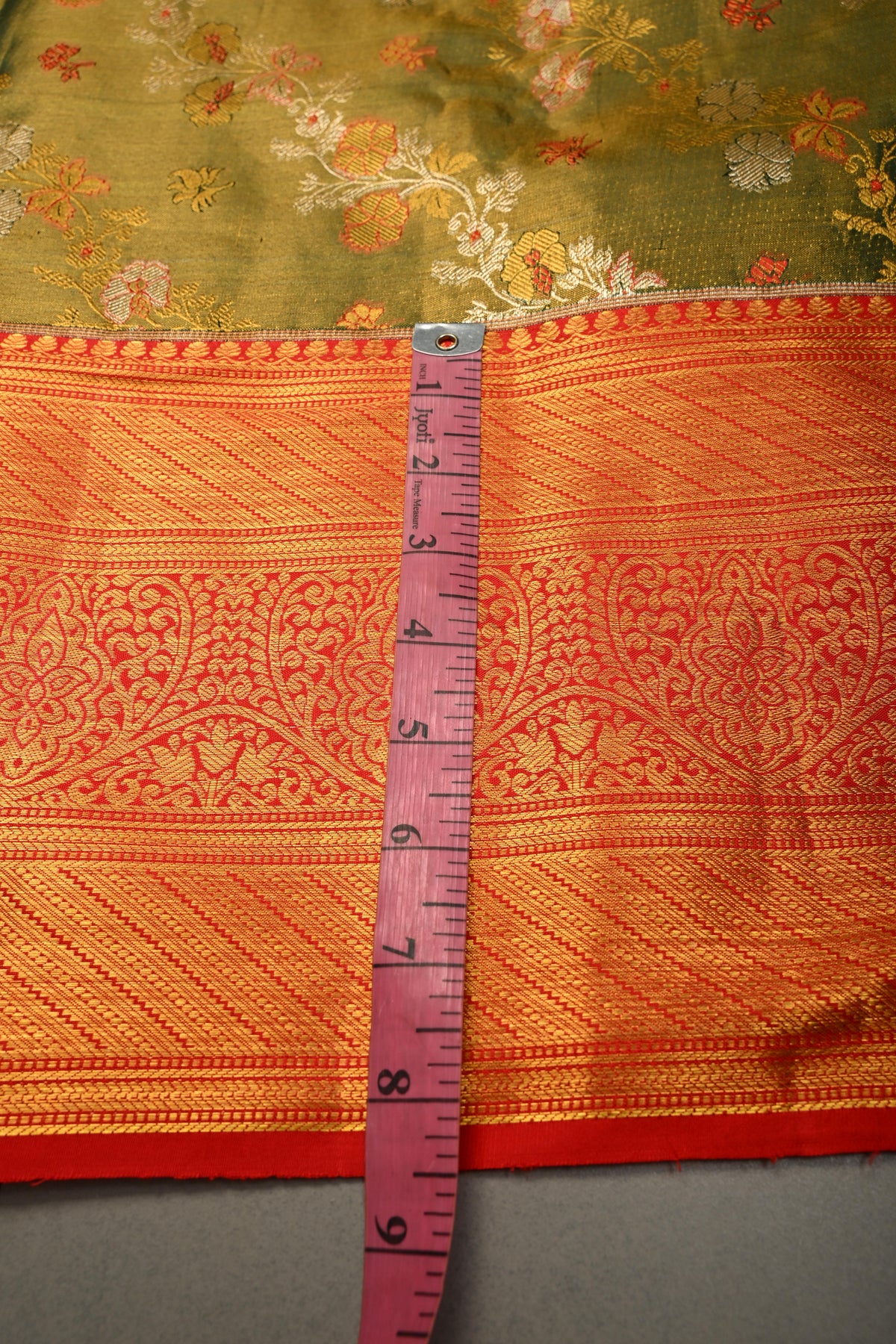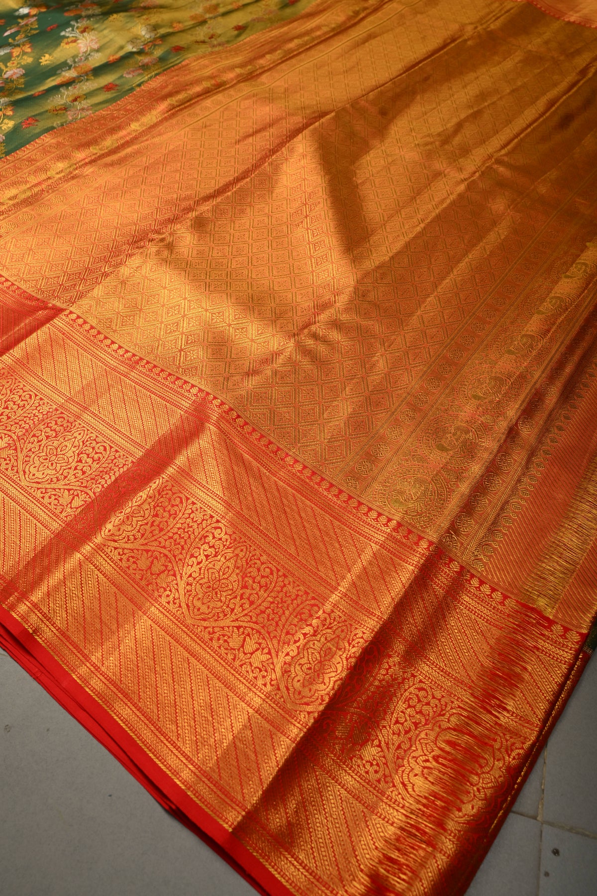 Step into elegance with this Green Pure Kanjivaram Tissue Silk Saree with Leheria Meenakari Floral Jaal and Contrast Zari Border. Crafted from pure Kanjivaram tissue silk, this saree offers a lightweight, drape with a soft sheen and smooth, graceful texture.