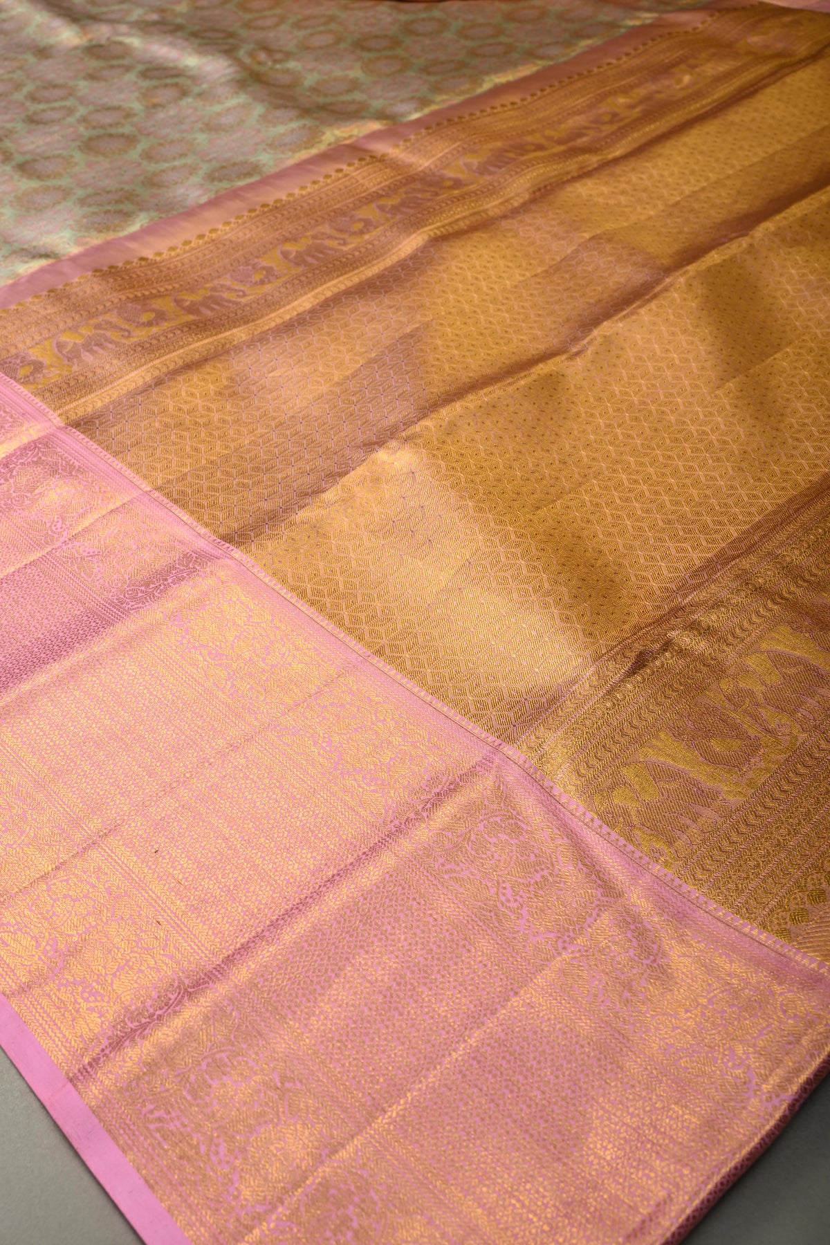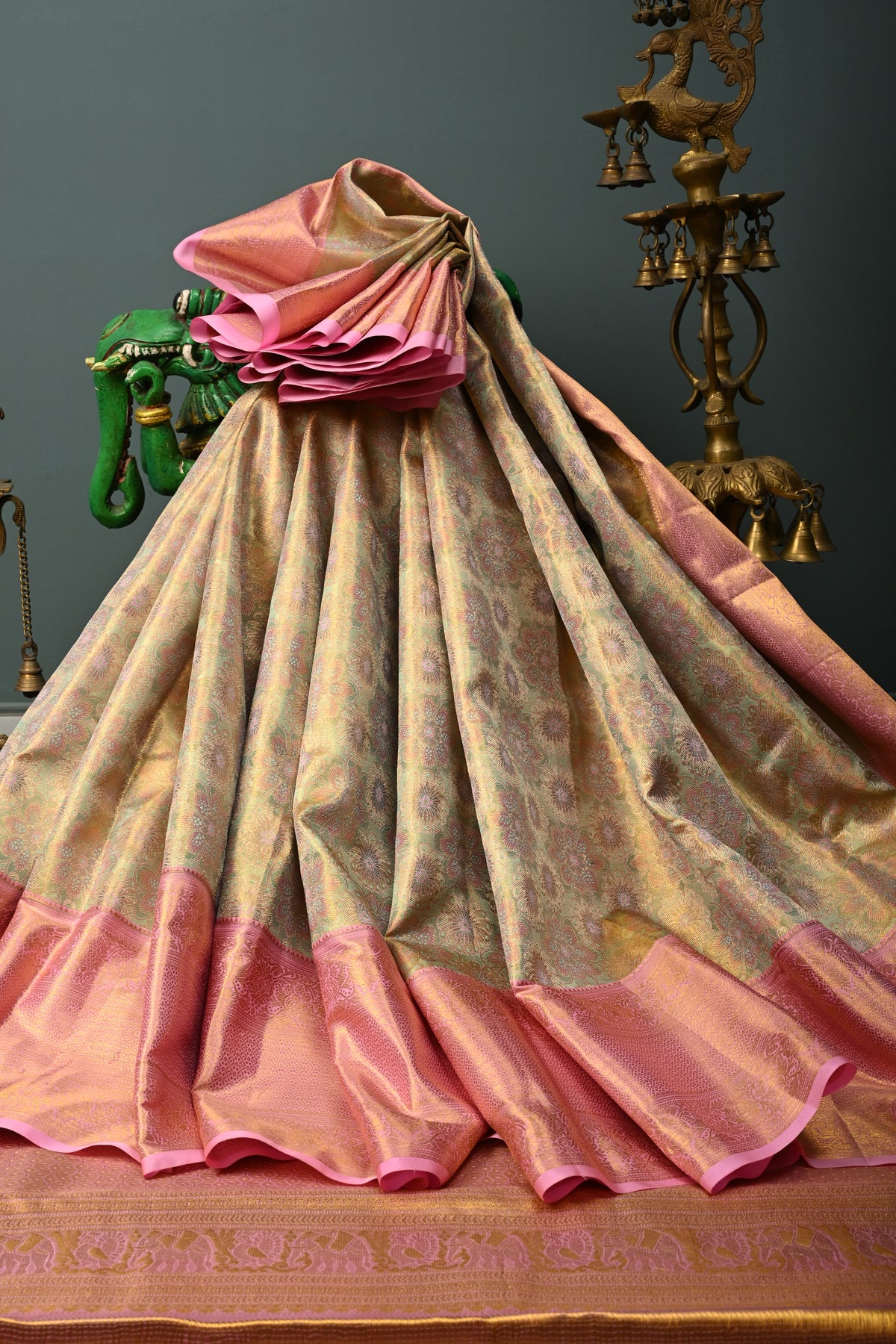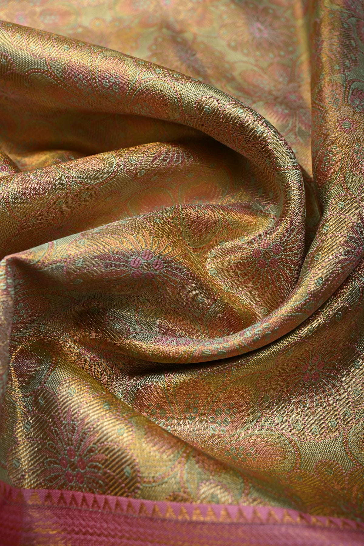 Discover timeless sophistication with this Green Pure Kanjivaram Tissue Silk Saree, a masterpiece of traditional craftsmanship. Woven from tissue silk, this saree features an intricate Meenakari floral brocade that beautifully enhances its green hue. The elegant contrast zari border adds depth and grandeur, creating a striking visual appeal. Perfect for weddings, festive celebrations, and special occasions, this saree offers a graceful drape with a subtle sheen that exudes refined charm. Pair it with classic gold jewelry and a complementary blouse for a stunning traditional ensemble.