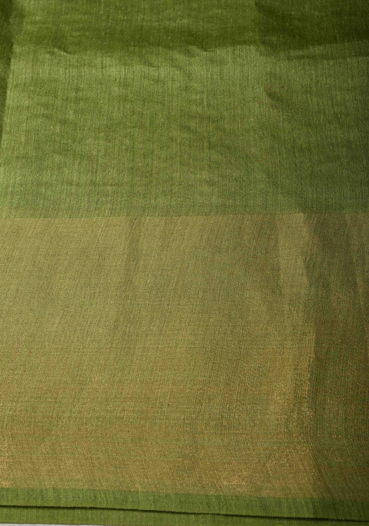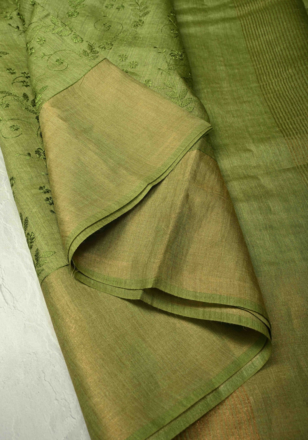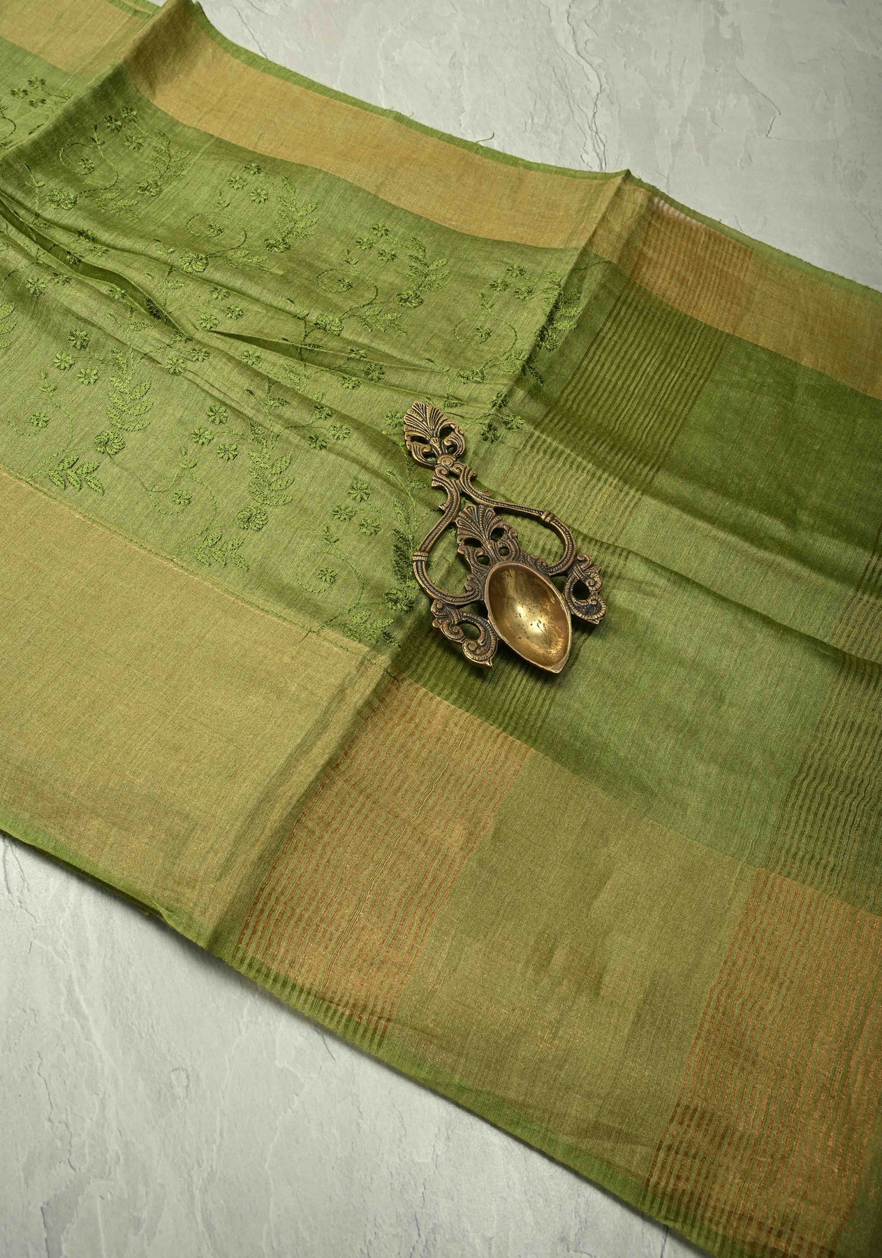 Experience the natural elegance of this Green Tussar Silk Saree. The raw, earthy texture of the Tussar is beautifully contrasted by the rich green hue, serving as a canvas for intricate Floral Embroidery. The look is completed by a Muted Zari Border, which offers a subtle, antique shimmer rather than a bold gleam. This saree is a perfect blend of natural charm and sophisticated artistry.