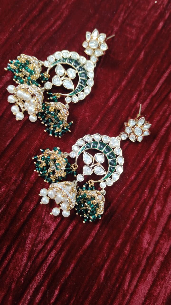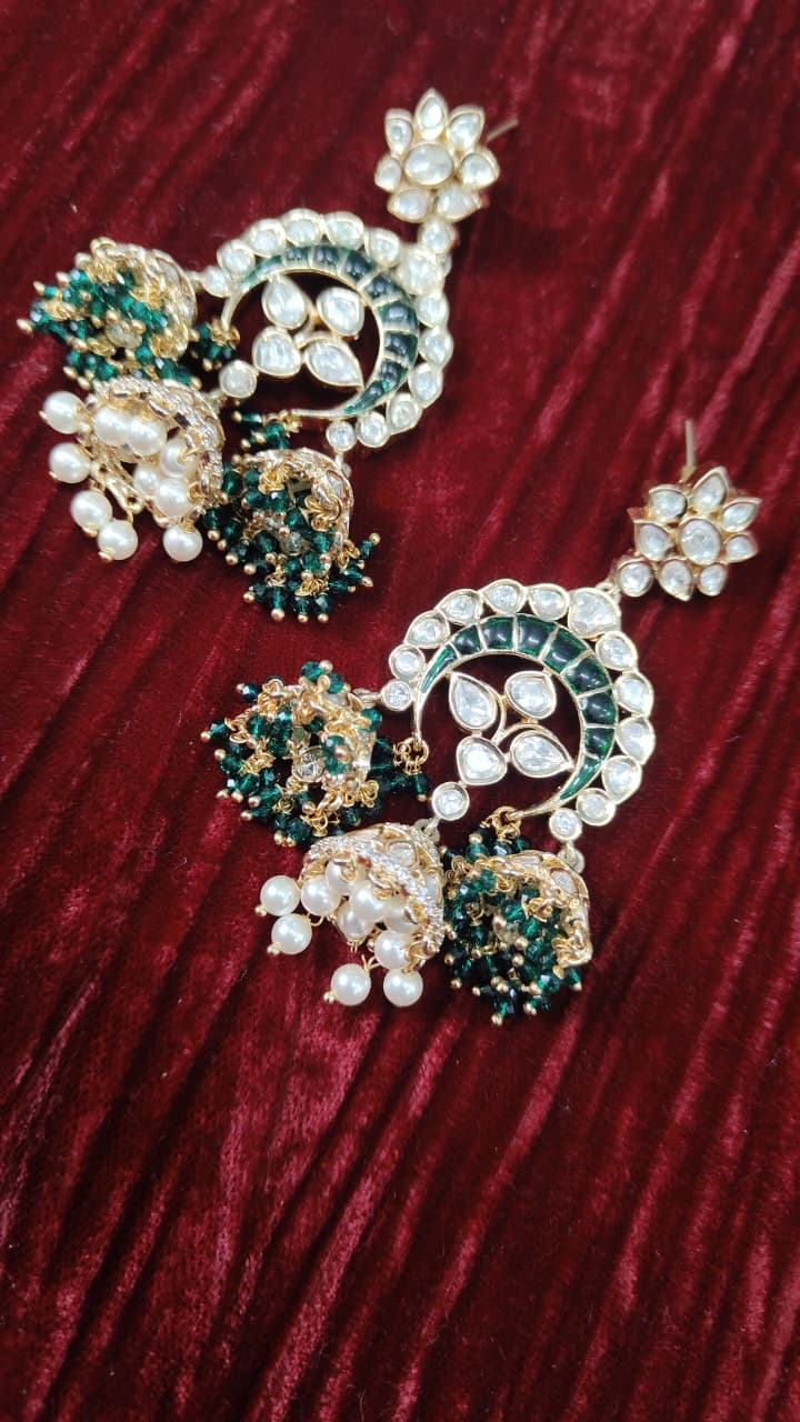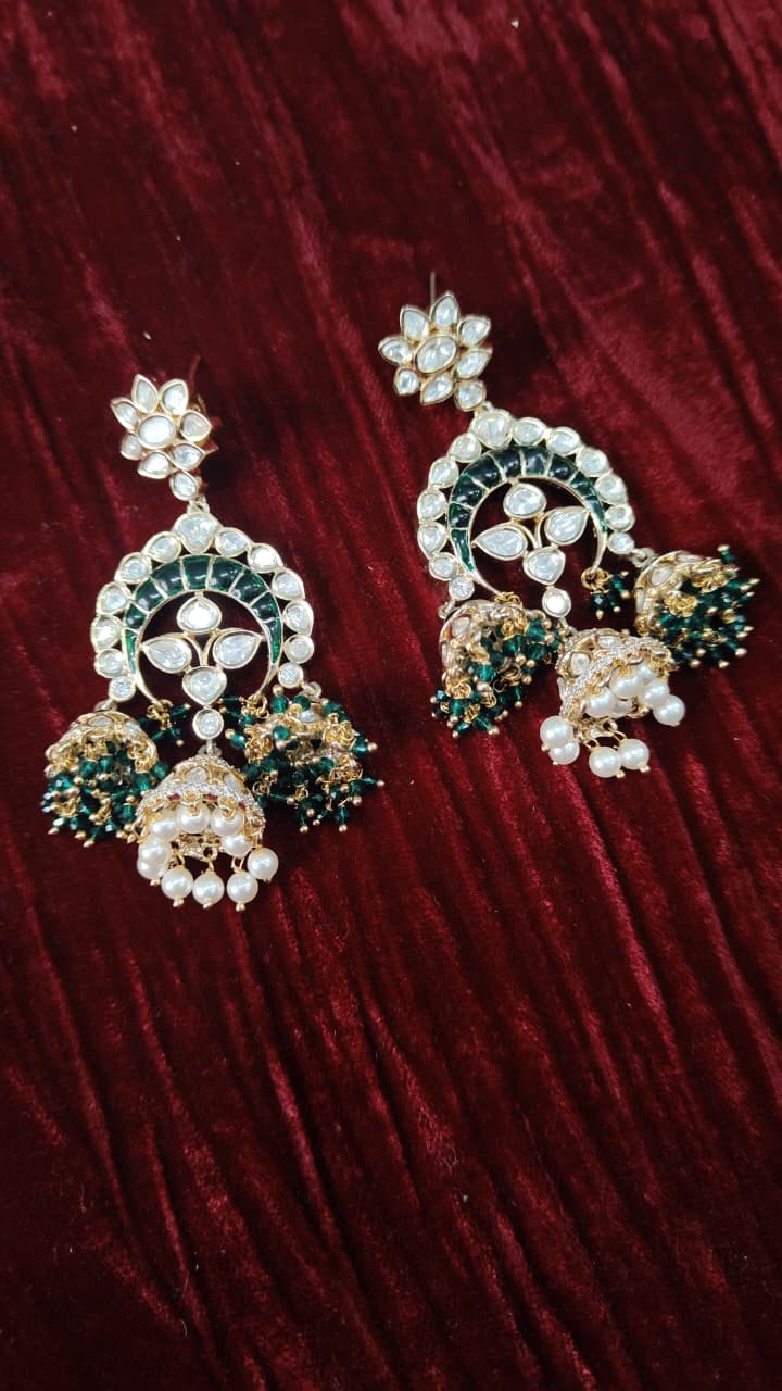 Make a statement with these Handcrafted Kundan Chandbali Earrings featuring triple jhumka drops. Exquisitely crafted, the earrings showcase traditional kundan work in a crescent-shaped chandbali design, reflecting timeless elegance and royal artistry. The triple layered jhumkas add movement and grandeur, while intricate detailing enhances their festive charm. Perfect for weddings, bridal events, and special occasions, these earrings effortlessly elevate any ethnic ensemble with a touch of regal sophistication.