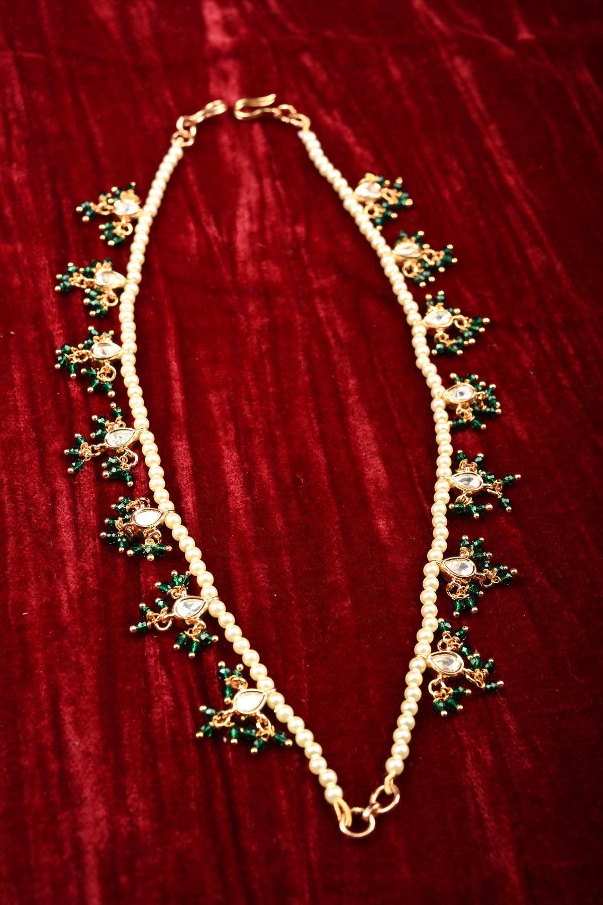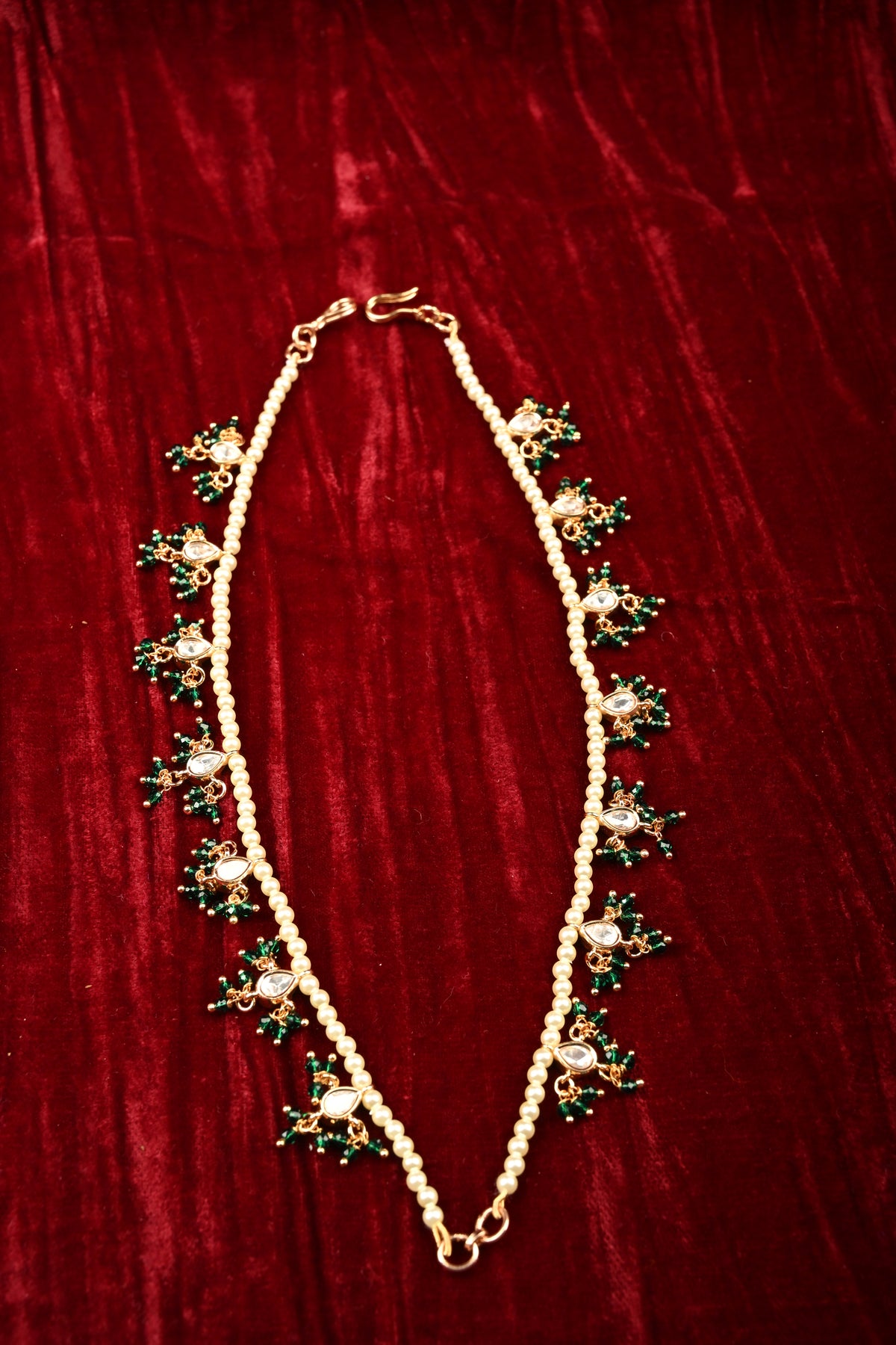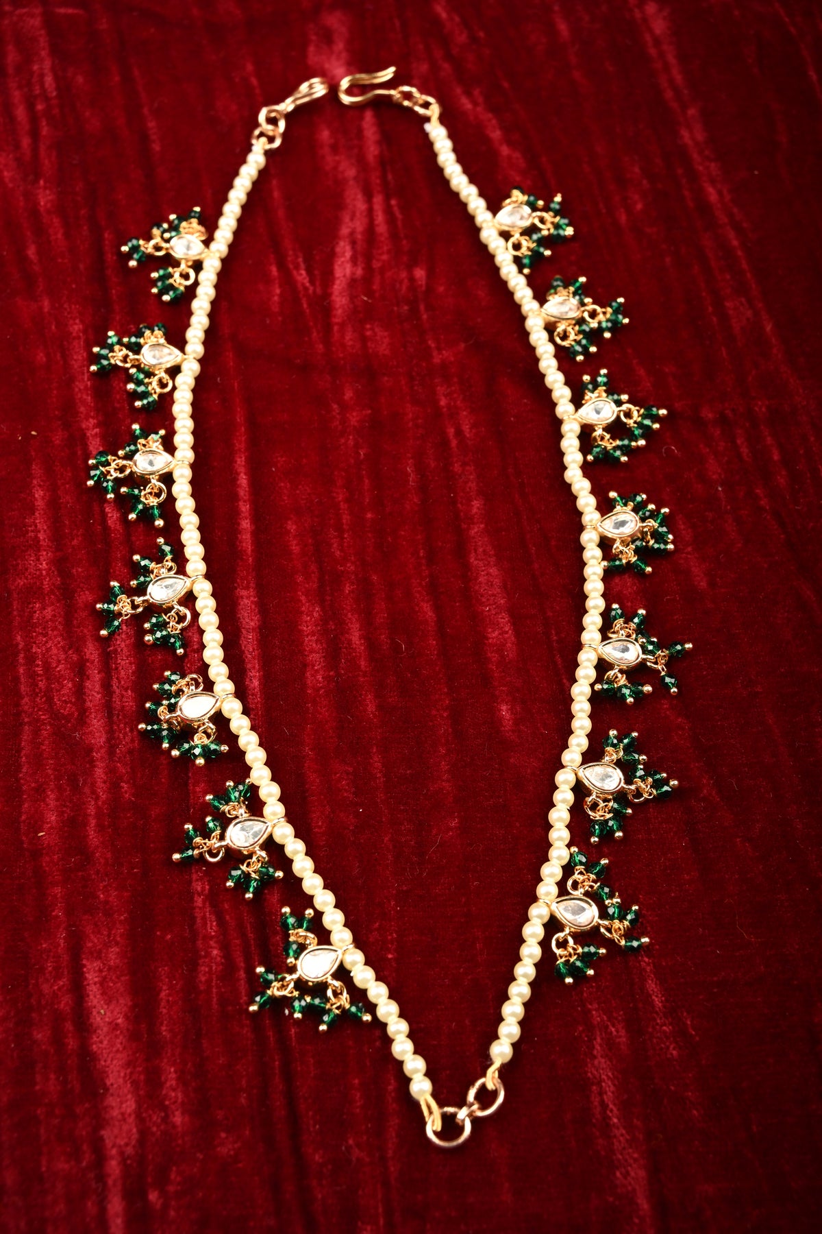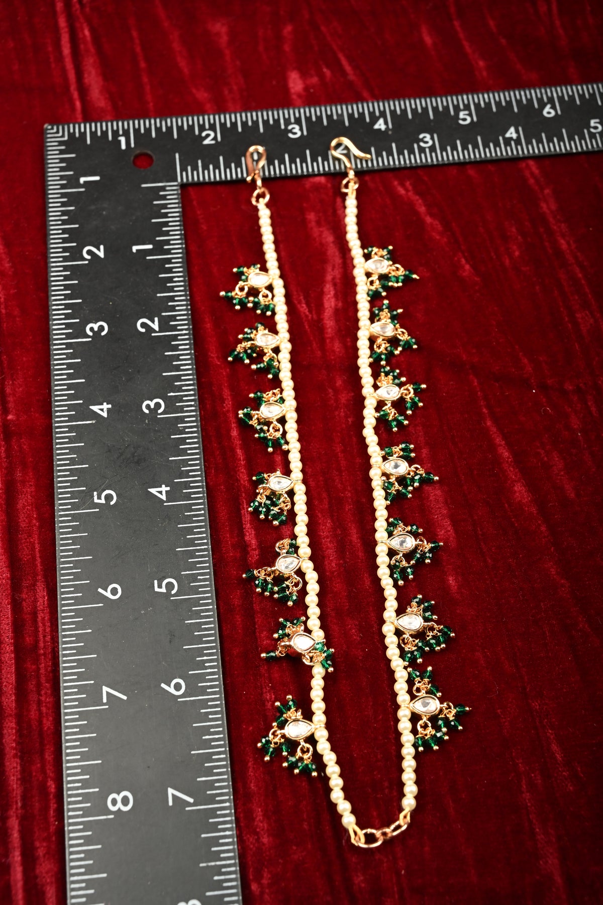 Enhance your traditional elegance with these Handcrafted Pearl Ear Chains, thoughtfully designed to reflect timeless beauty. Featuring delicate strands of lustrous pearls, each piece is adorned with sparkling tear-drop Kundan stones that add a touch of regal charm. The green bead accents bring a refreshing pop of color, creating a graceful balance between classic sophistication and festive allure. Lightweight yet statement-worthy, these ear chains are perfect for weddings, cultural celebrations, and special occasions, beautifully complementing sarees, lehengas, and other ethnic ensembles.