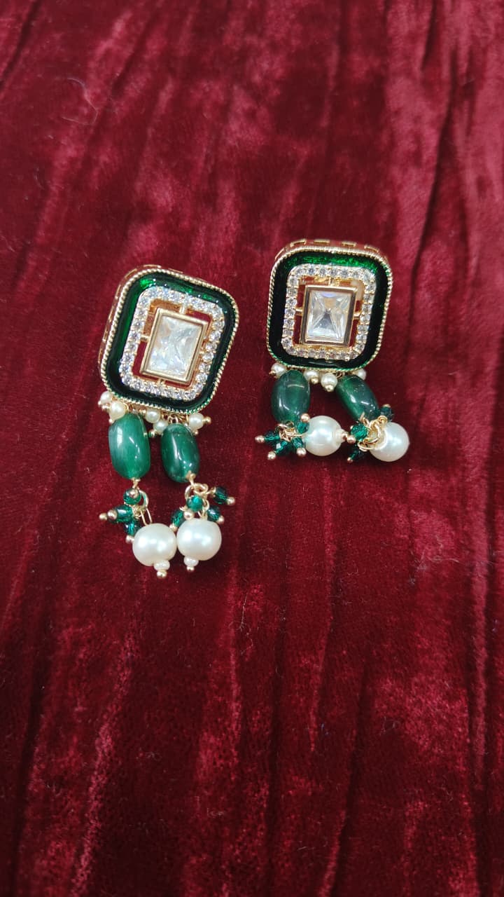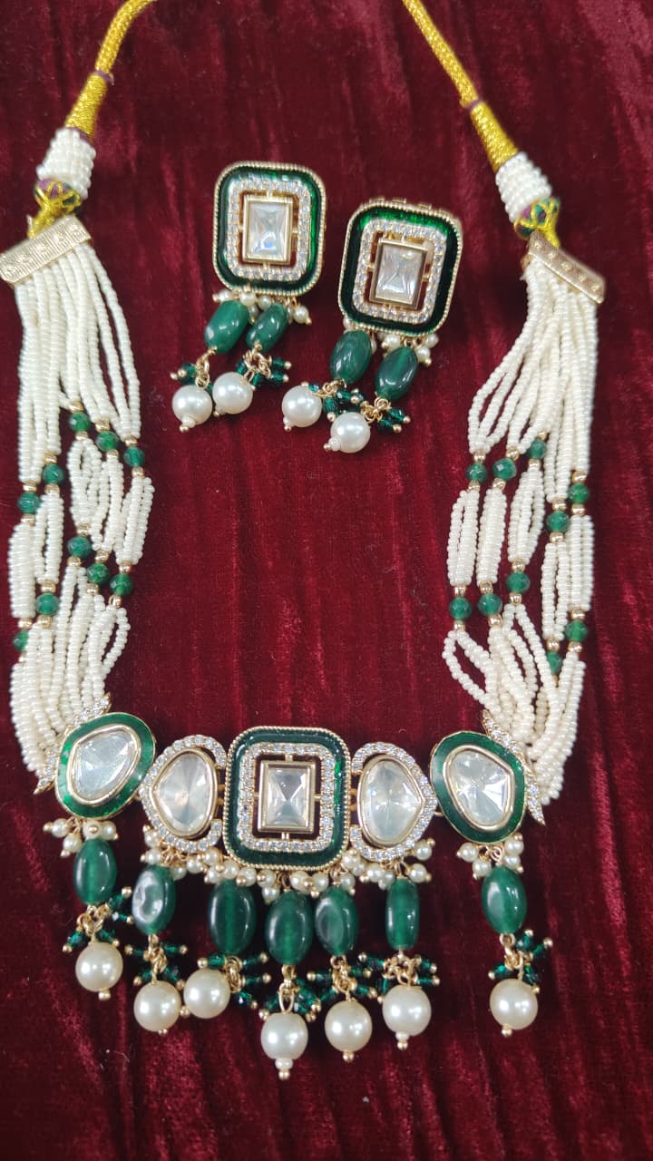 Celebrate timeless craftsmanship with this Handcrafted Polki-Style Choker Set adorned with multistrand seed pearls and intricate meenakari accents. The choker features beautifully set polki-style stones that radiate royal elegance, while the delicate layers of seed pearls add depth and graceful movement. meenakari detailing enhances the design with rich enamel artistry, reflecting traditional heritage charm. Paired with matching earrings, this exquisite set is perfect for weddings, festive occasions, and bridal wear, making it a standout addition to your ethnic jewelry collection.