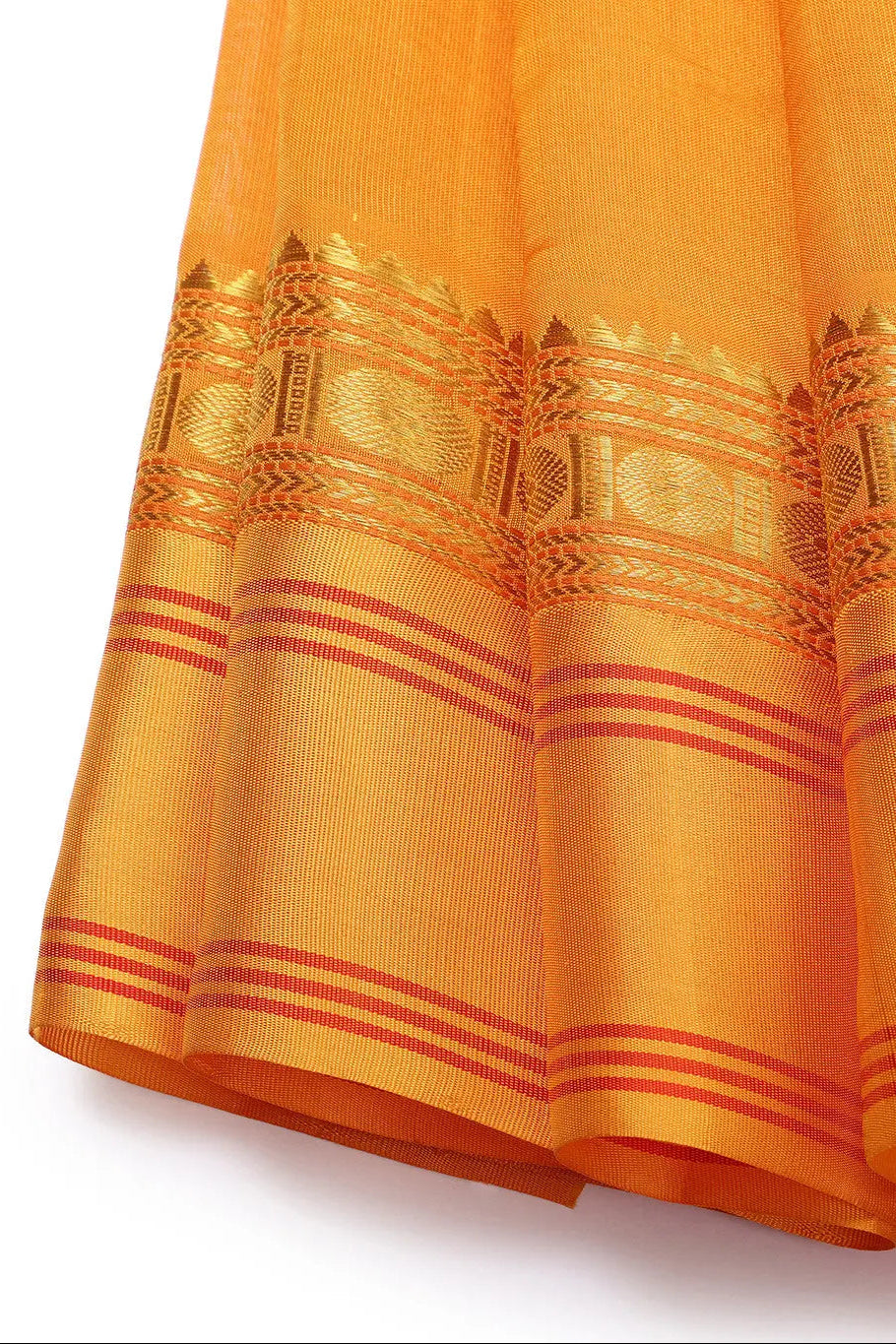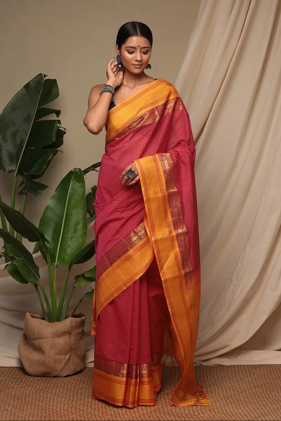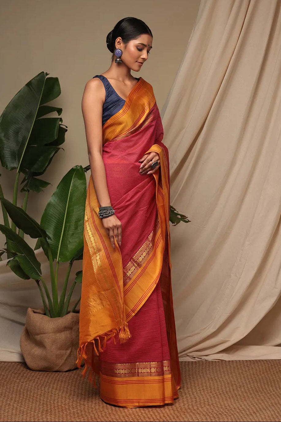 Immerse yourself in the exquisite beauty of our Handloom Candy Red Pure Cotton Kanchi Saree. This saree showcases graceful gradient stripes, a striking Mustard Pallu, and a meticulously woven silk border in vibrant Mustard shades, truly exemplifying skilled artistry and exceptional quality. Whether it's an ethnic gathering or any special occasion, this saree is bound to make a lasting impression. You can further enhance its stunning design by pairing it with captivating Jhumka accessories that are sure to catch everyone's attention.