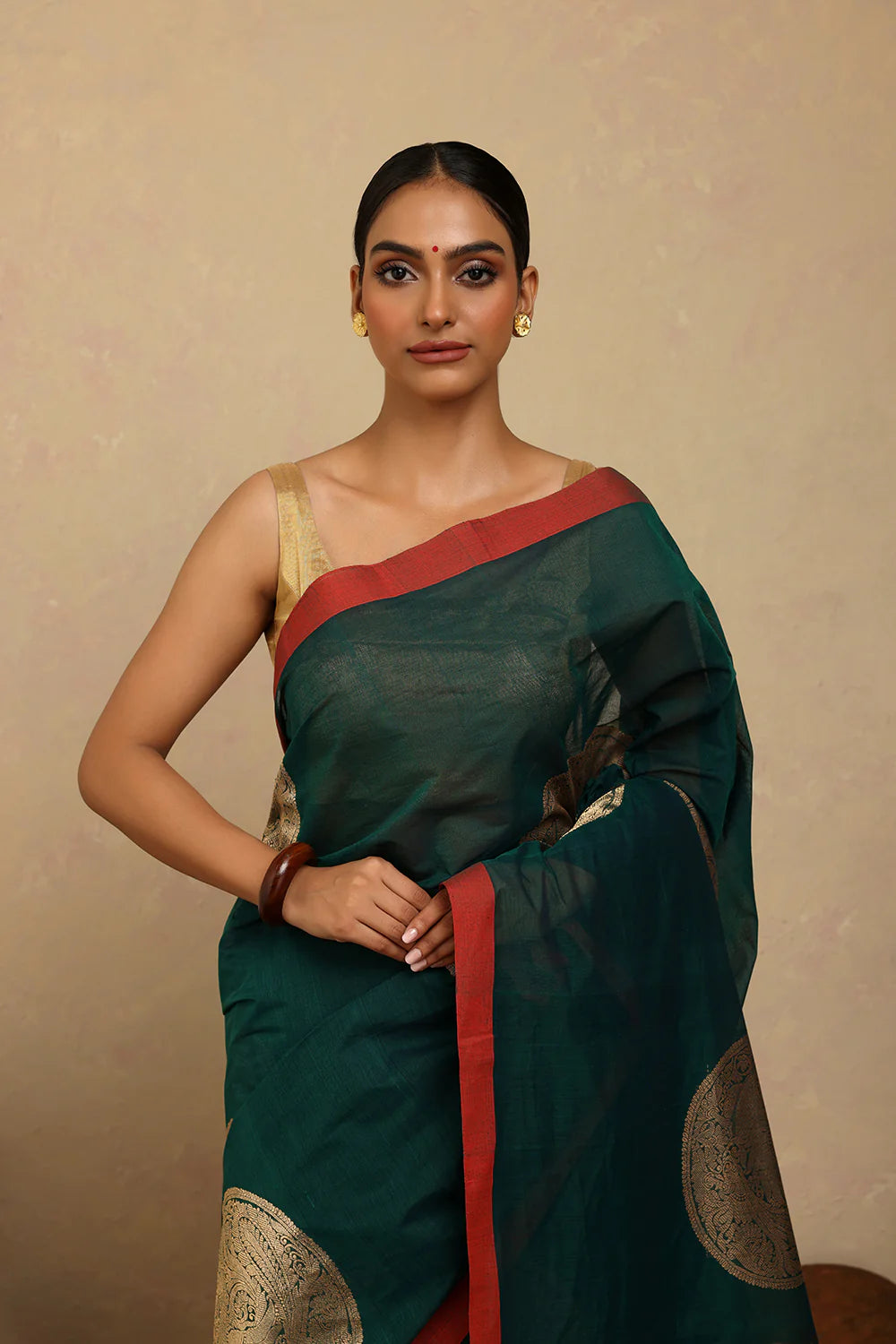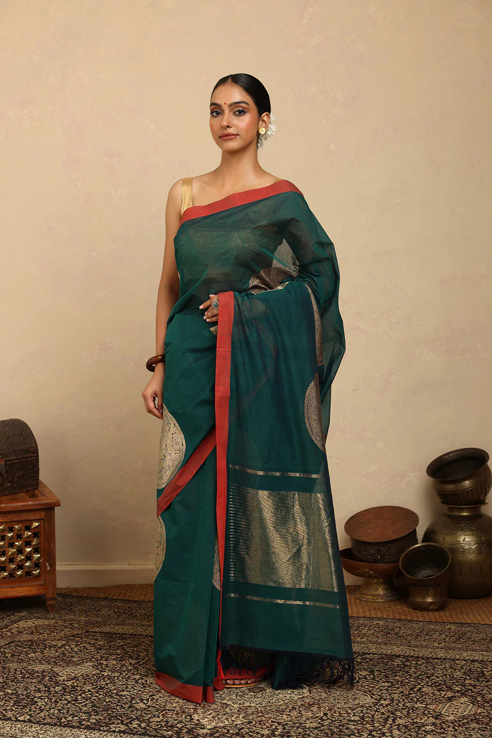 Graceful and timeless, this Handloom Dark Green Kanchi Cotton Saree is adorned with traditional coin motifs that enhance its classic appeal. Woven in fine cotton, it offers effortless comfort with a touch of heritage elegance. Perfect for festive occasions, cultural gatherings, or refined everyday wear, this saree beautifully reflects the artistry and tradition of handloom weaving.