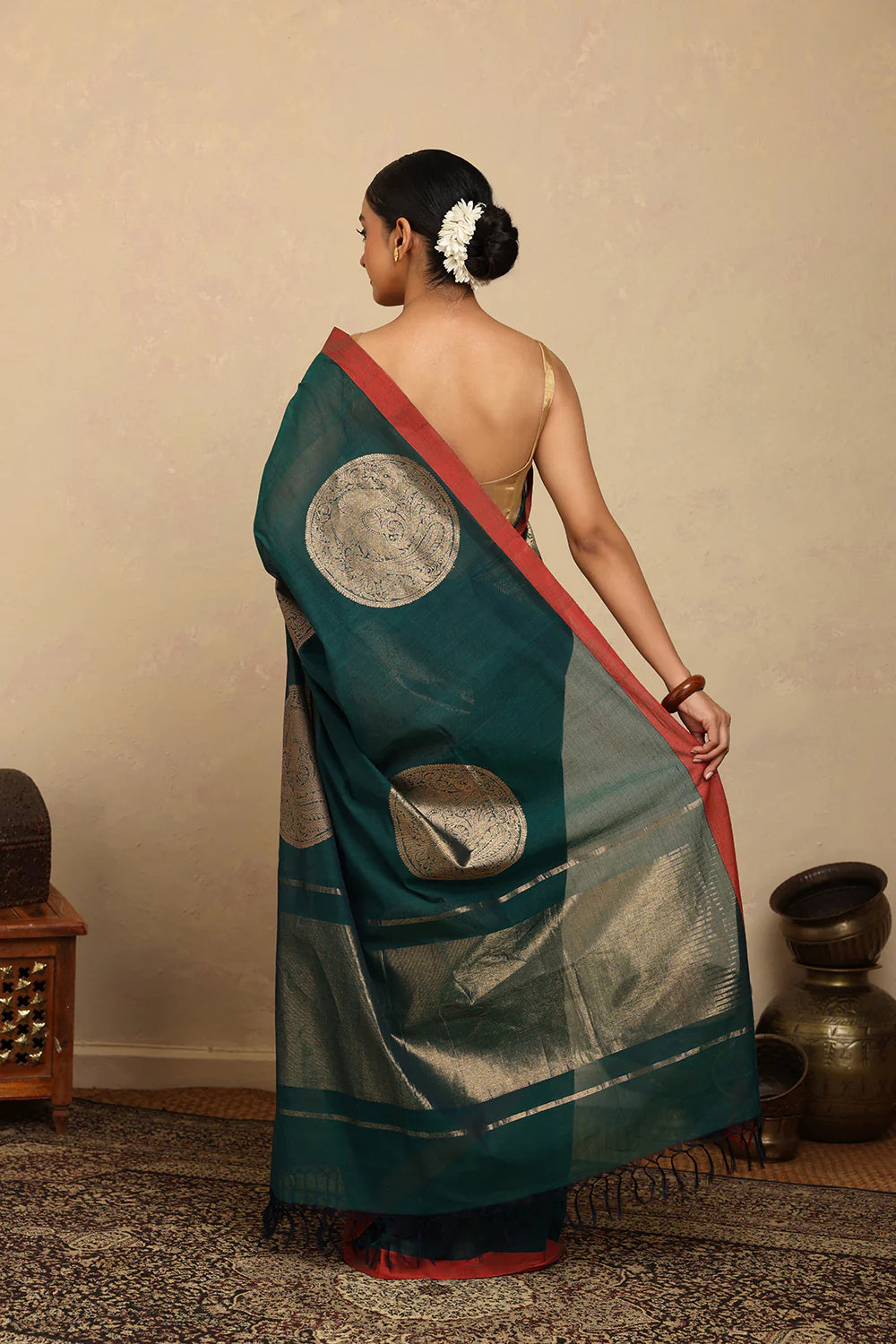 Handloom Dark Green Coin Motifs Kanchi Cotton Saree