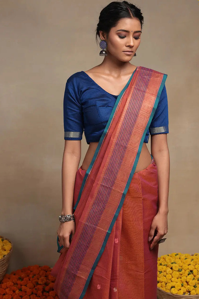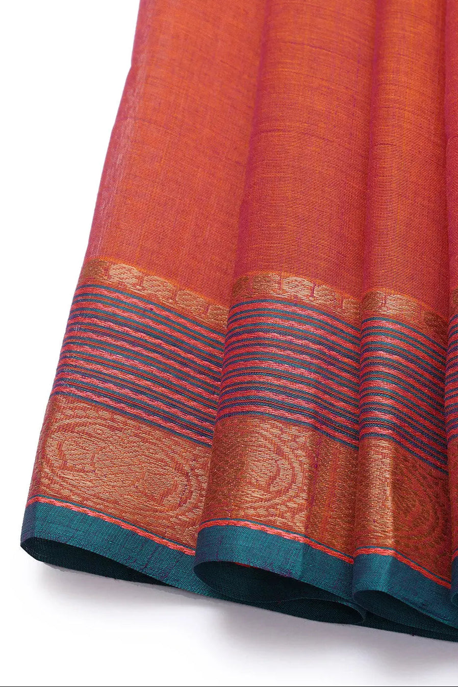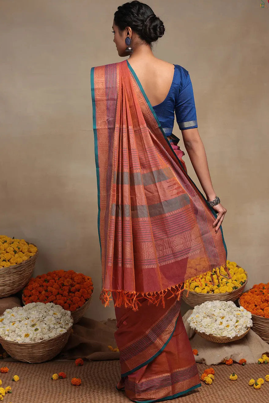 Handloom Fire Orange Pure Cotton Kanchi Saree