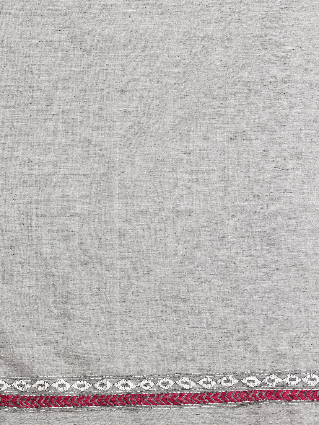 The saree features exquisite Kantha embroidery, meticulously hand-stitched by skilled artisans, adding a touch of heritage charm to its elegant grey body and purple accents. Lightweight and beautifully textured, it drapes gracefully, making it ideal for festive gatherings, cultural events, or everyday sophistication.
