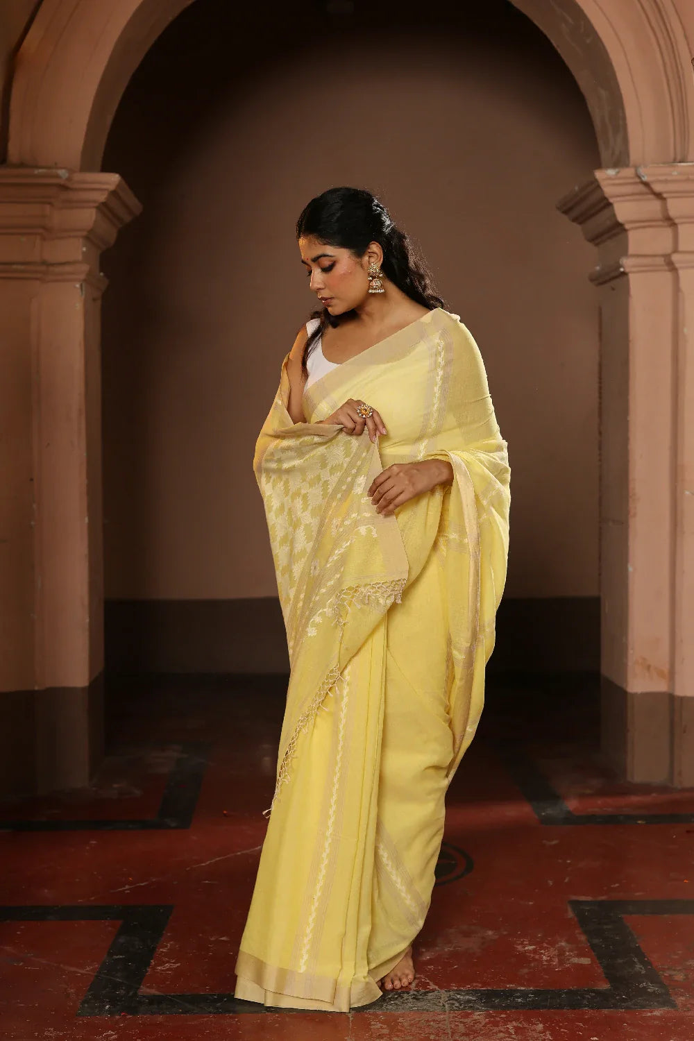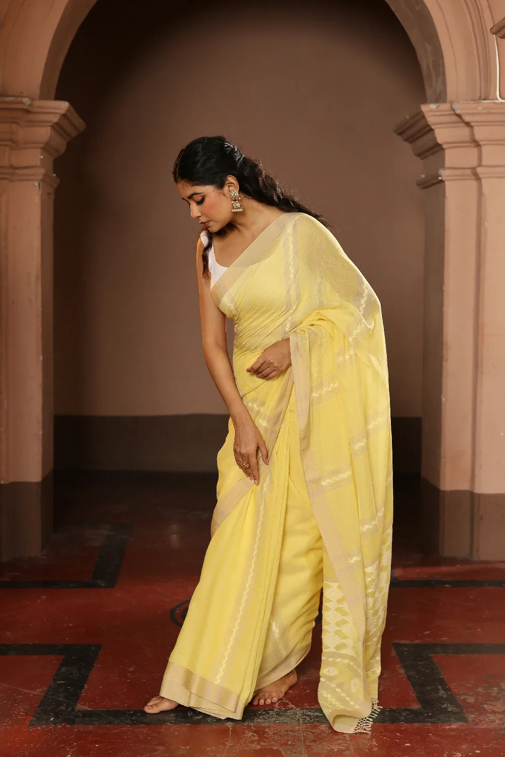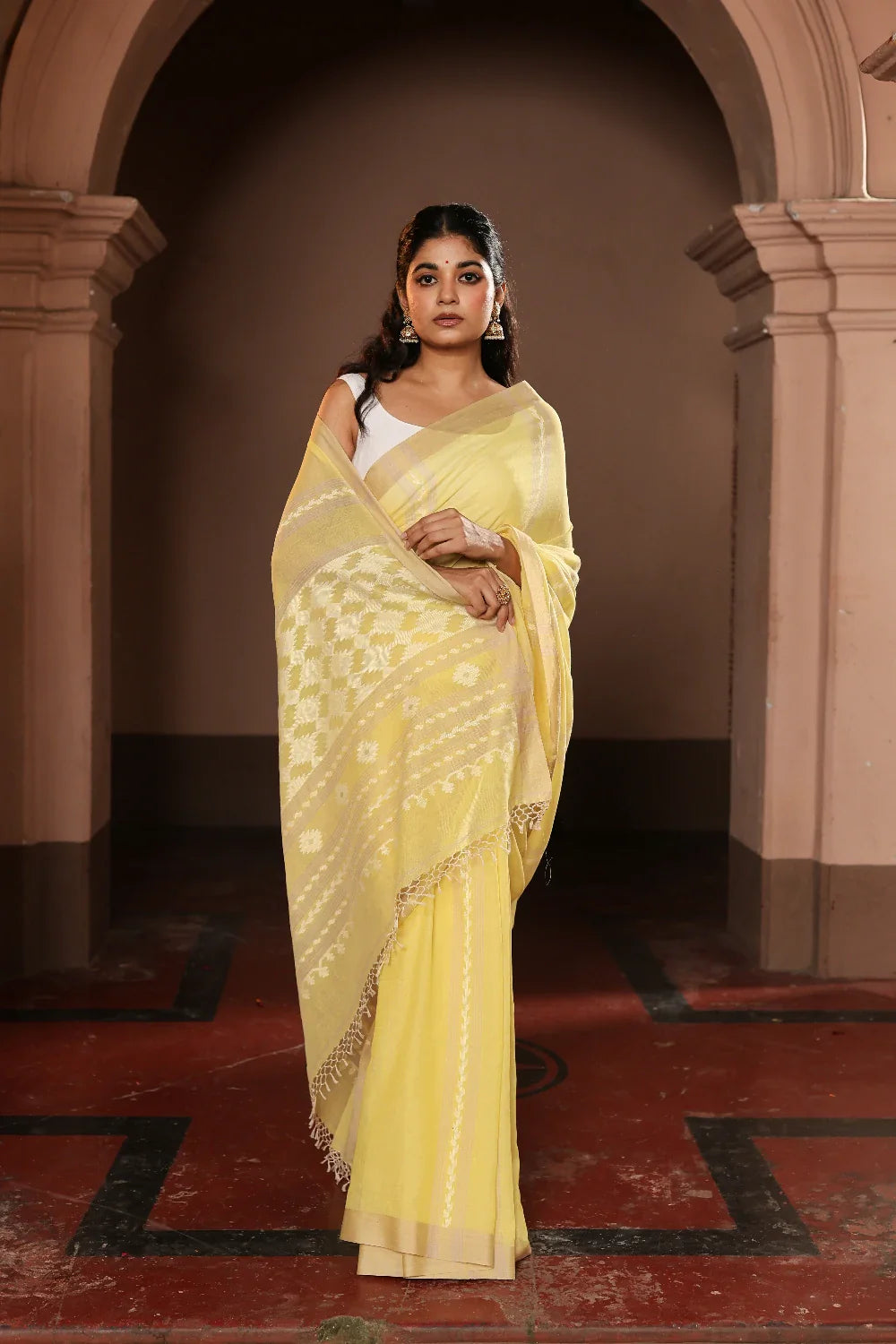 Handloom Lemon Yellow Pure Cotton Jamdani Saree