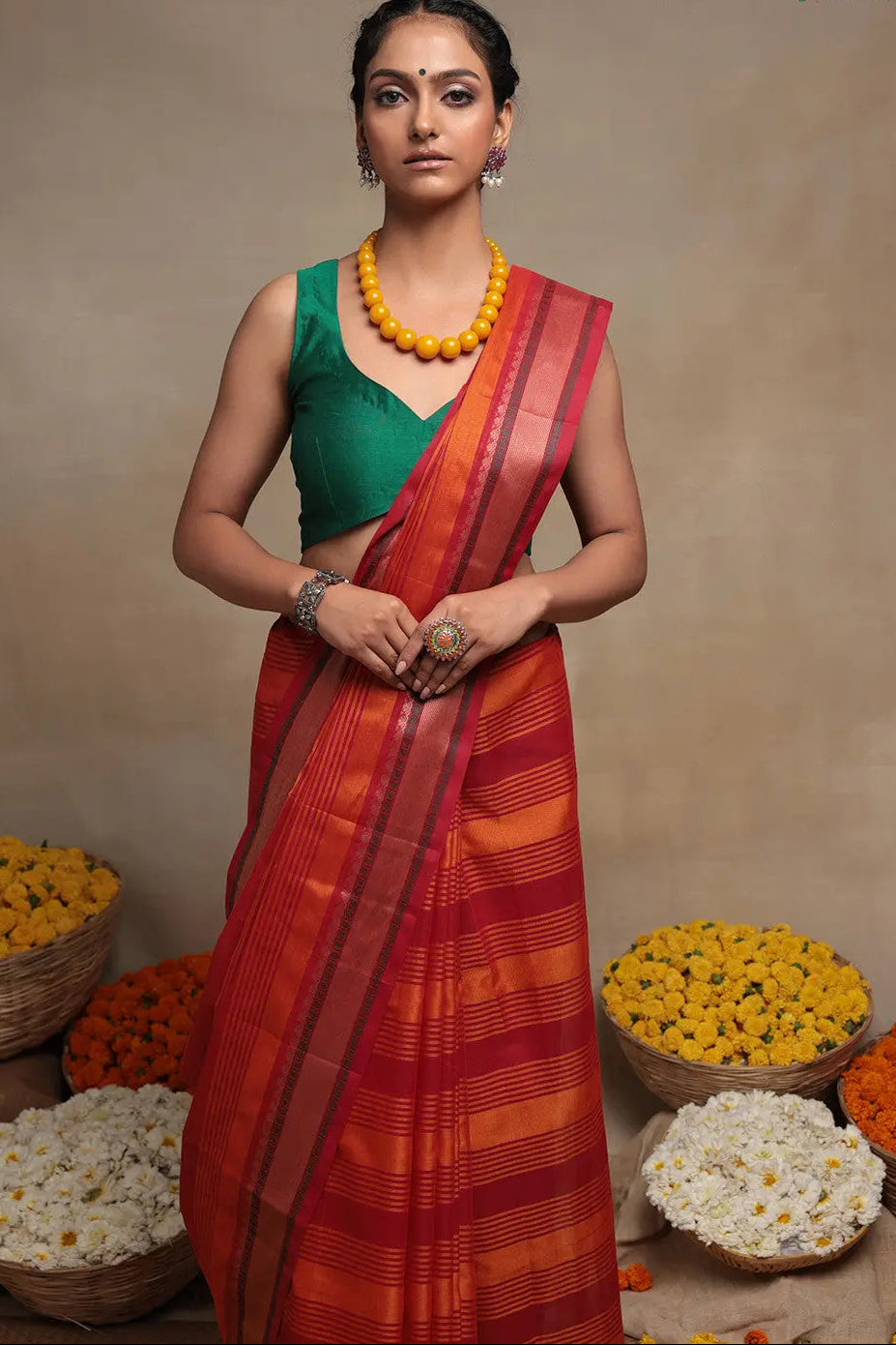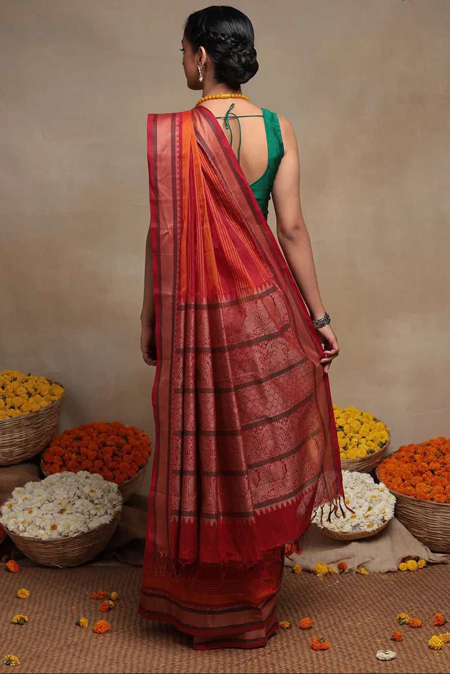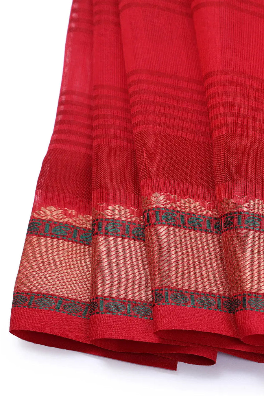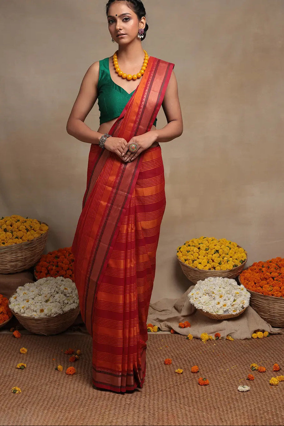 The magnificent shades of Orange and Red are adorned with enchanting Kanchi border artistry, adding a touch of allure. The lavish weaving is embellished with intricate borders and a delicately exquisite pallu. However, it is the awe-inspiring fabric body that truly mesmerizes, casting a spell with its aesthetic charm. The expressive interplay of two vibrant colors, interwoven in graceful stripes, is a spectacle to behold. Every single inch of this fabric is meticulously crafted with utmost finesse, ensuring perfection in every detail. Even the border exudes opulence, lavishly adorned with the same resplendent golden zari work, enhancing its grandeur.