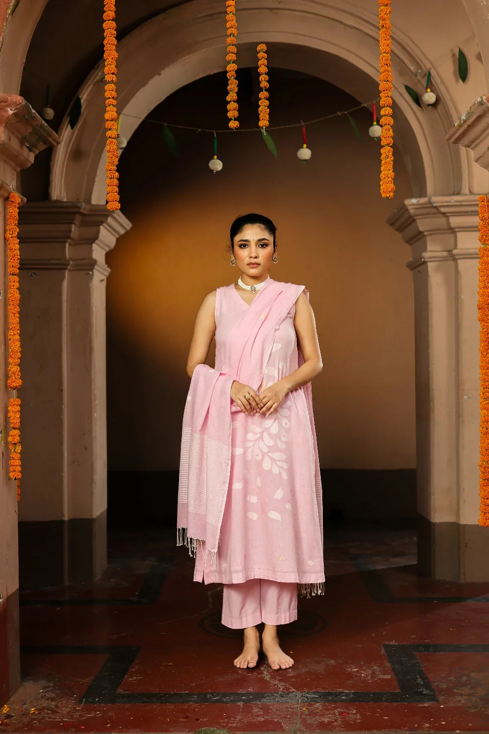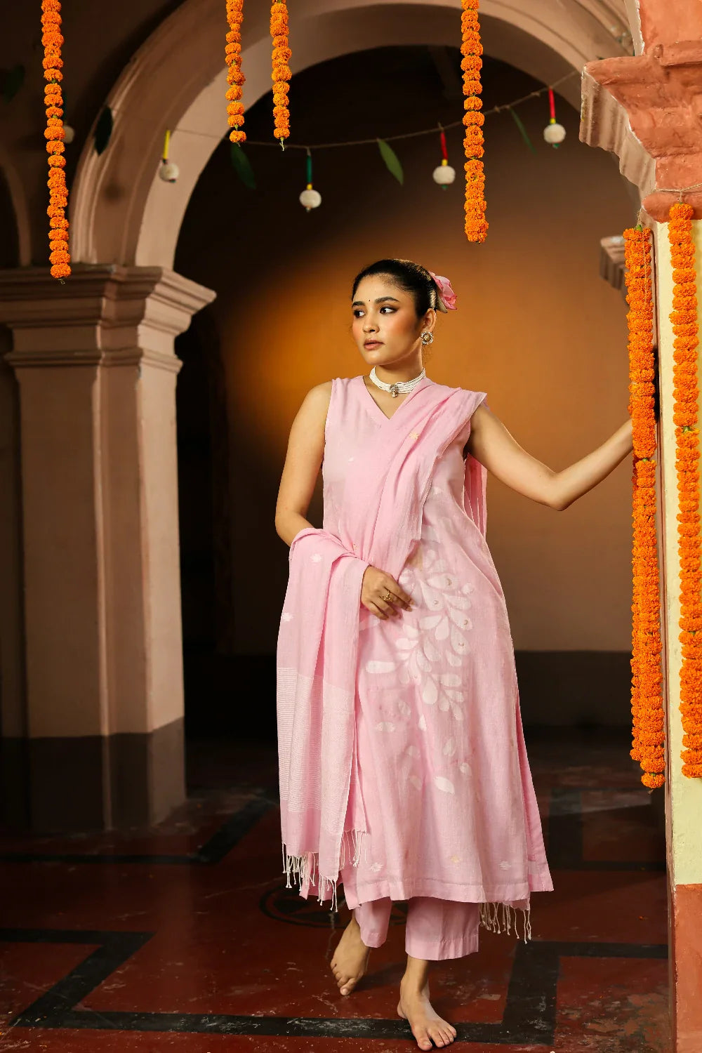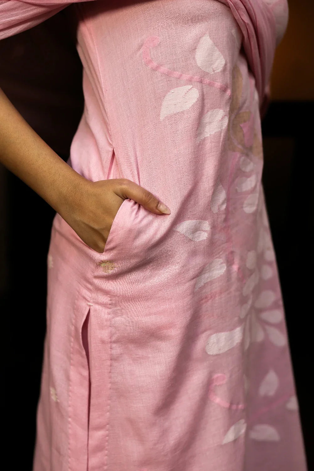 Soft and graceful, this handloom Jamdani kurta set in pastel pink is woven from pure cotton with delicate zari highlights. The subtle hue paired with intricate motifs exudes understated elegance. Completed with a matching dupatta, this ensemble is perfect for festive gatherings, daytime celebrations, or refined everyday wear, bringing timeless artistry to your wardrobe.