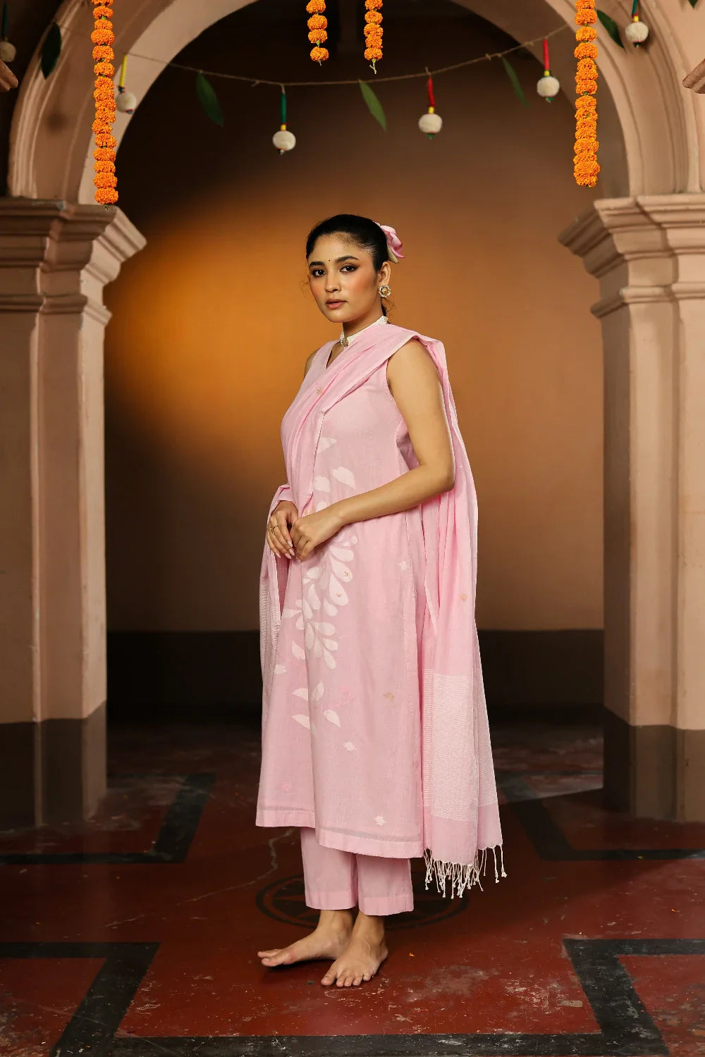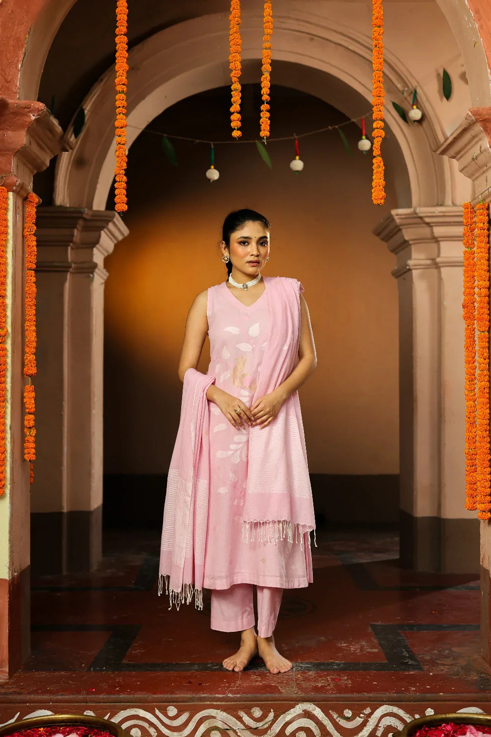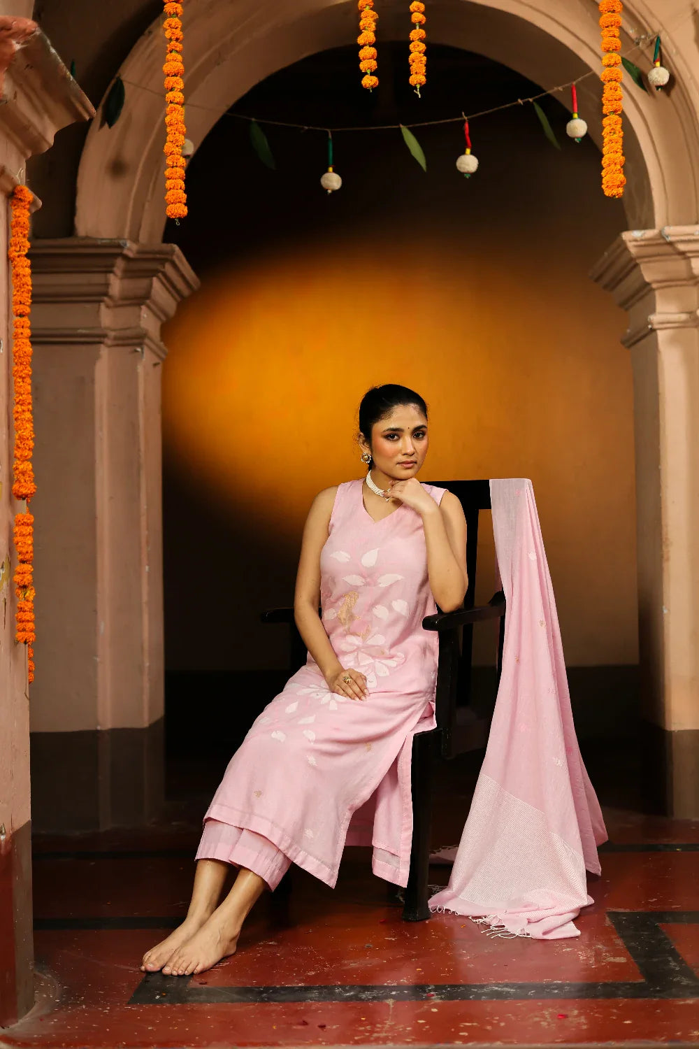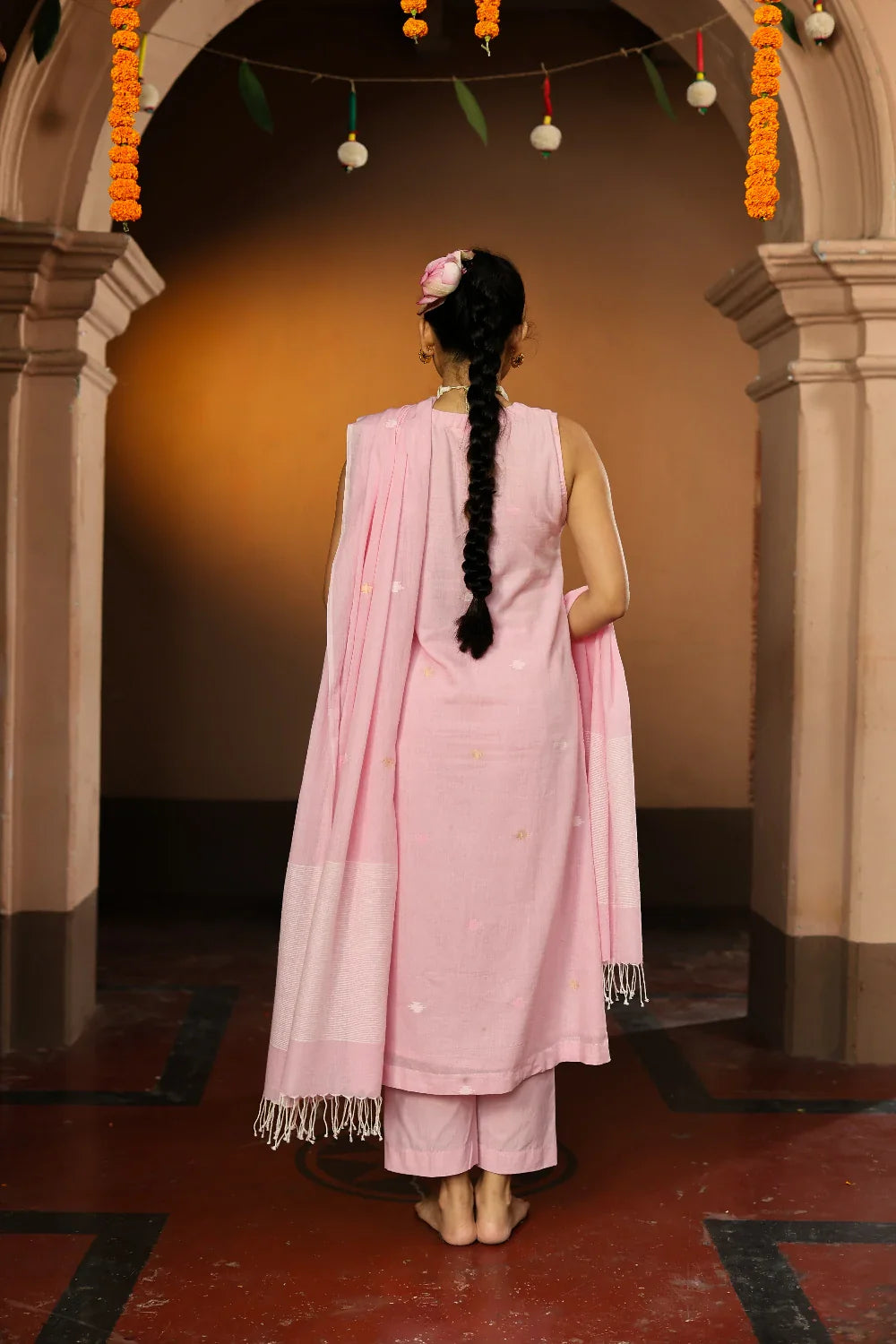 Soft and graceful, this handloom Jamdani kurta set in pastel pink is woven from pure cotton with delicate zari highlights. The subtle hue paired with intricate motifs exudes understated elegance. Completed with a matching dupatta, this ensemble is perfect for festive gatherings, daytime celebrations, or refined everyday wear, bringing timeless artistry to your wardrobe.