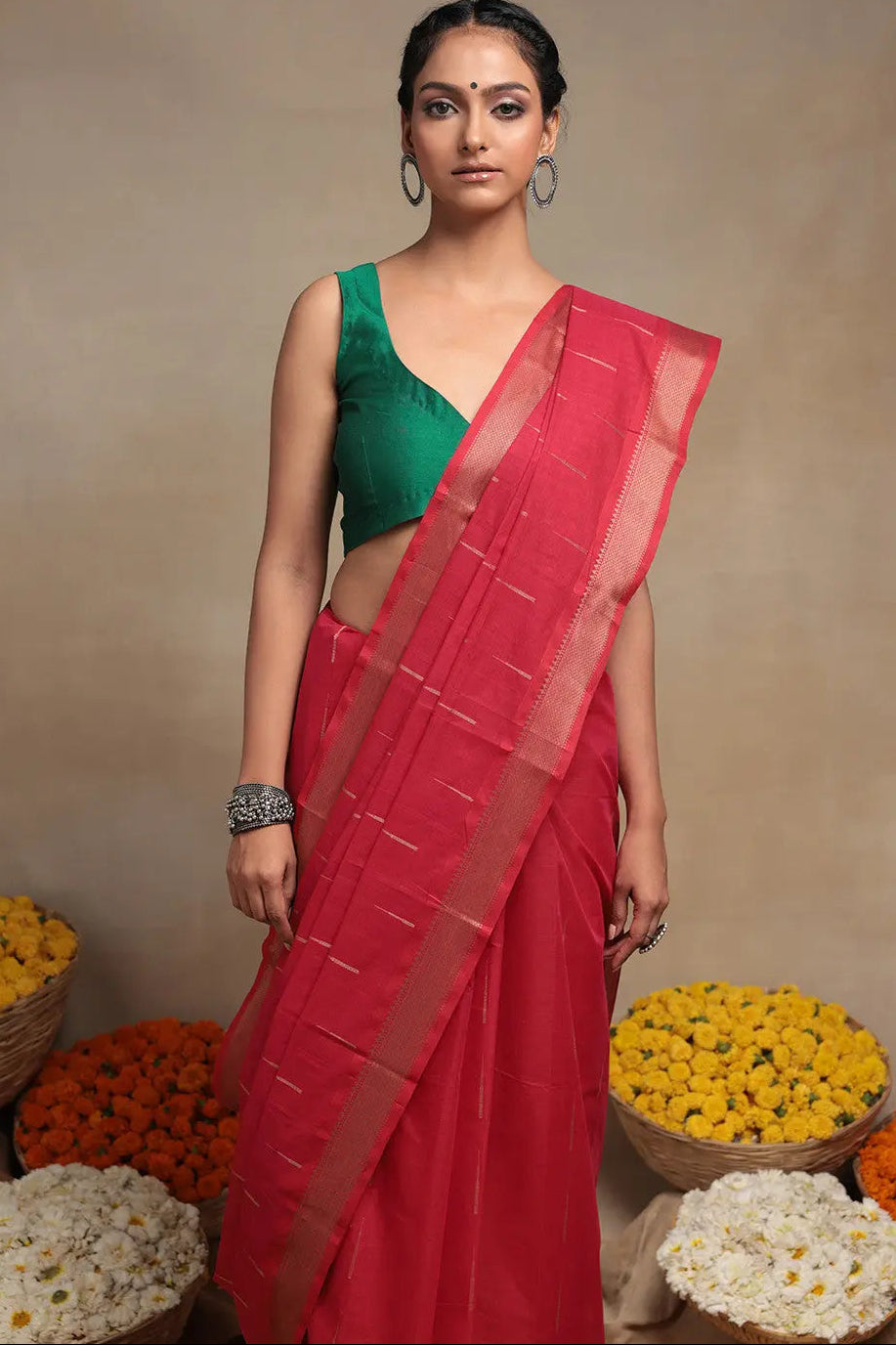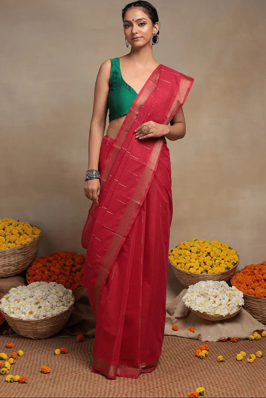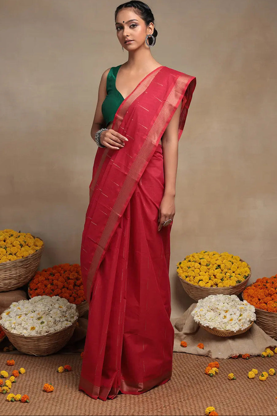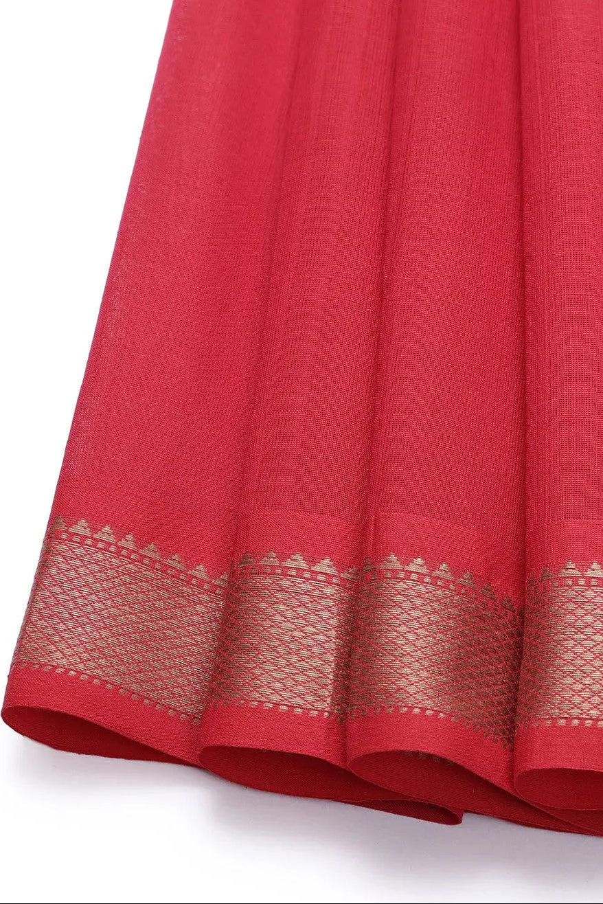 Behold the grandeur of our Handloom Raspberry Red Cotton Kanchi Saree, an exquisite fusion of Raspberry Red and Beige hues bedecked with an enchanting all-over strings design. The gentle caress of the supple cotton fabric gracefully envelops your form, rendering a garment that effortlessly harmonizes comfort and style, making it an impeccable choice for every occasion. The meticulous Beige Strings design showcases the exceptional artistry of our revered artisans, a testament to their unparalleled craftsmanship. Whether you choose to elevate it for casual outings or indulge in joyous festive revelries, this saree is an absolute essential for any discerning fashion connoisseur who reveres the allure of handcrafted opulence.