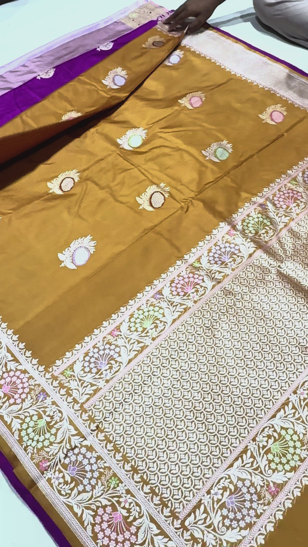 The Honey Brown Banarasi Pure Katan Silk Saree is a beautiful blend of warm tones and exquisite craftsmanship. Made from pure Katan silk, this saree features a honey brown color that adds a touch of understated elegance. The fabric is adorned with delicate Alfi floral buttas in silver zari, creating a subtle yet striking shimmer across the saree. Highlighting its traditional charm is a stunning Meenakari scallop border, intricately designed with vibrant enamel work and detailed patterns that elevate the overall look. Perfect for weddings, festive occasions, and formal events, this saree is a timeless piece that balances classic artistry with contemporary style.