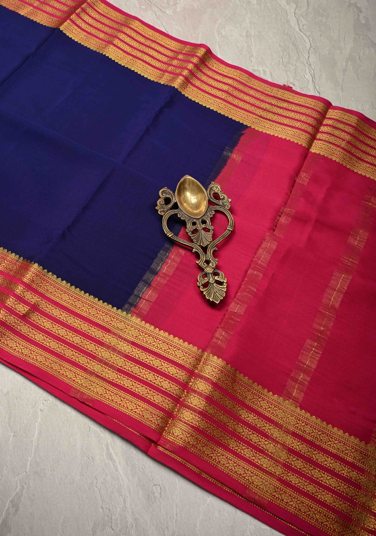 The Ink Blue Mysore Silk Saree with Contrast Zari Borders is a stunning fusion of deep color and intricate craftsmanship. Made from Mysore silk, the saree features a ink blue shade that exudes sophistication and charm. The contrast zari borders, in either gold provide a striking visual appeal, enhancing the saree’s regal allure. Perfect for weddings, festive occasions, and cultural celebrations, this saree drapes beautifully, offering a timeless elegance that is both graceful and impactful.