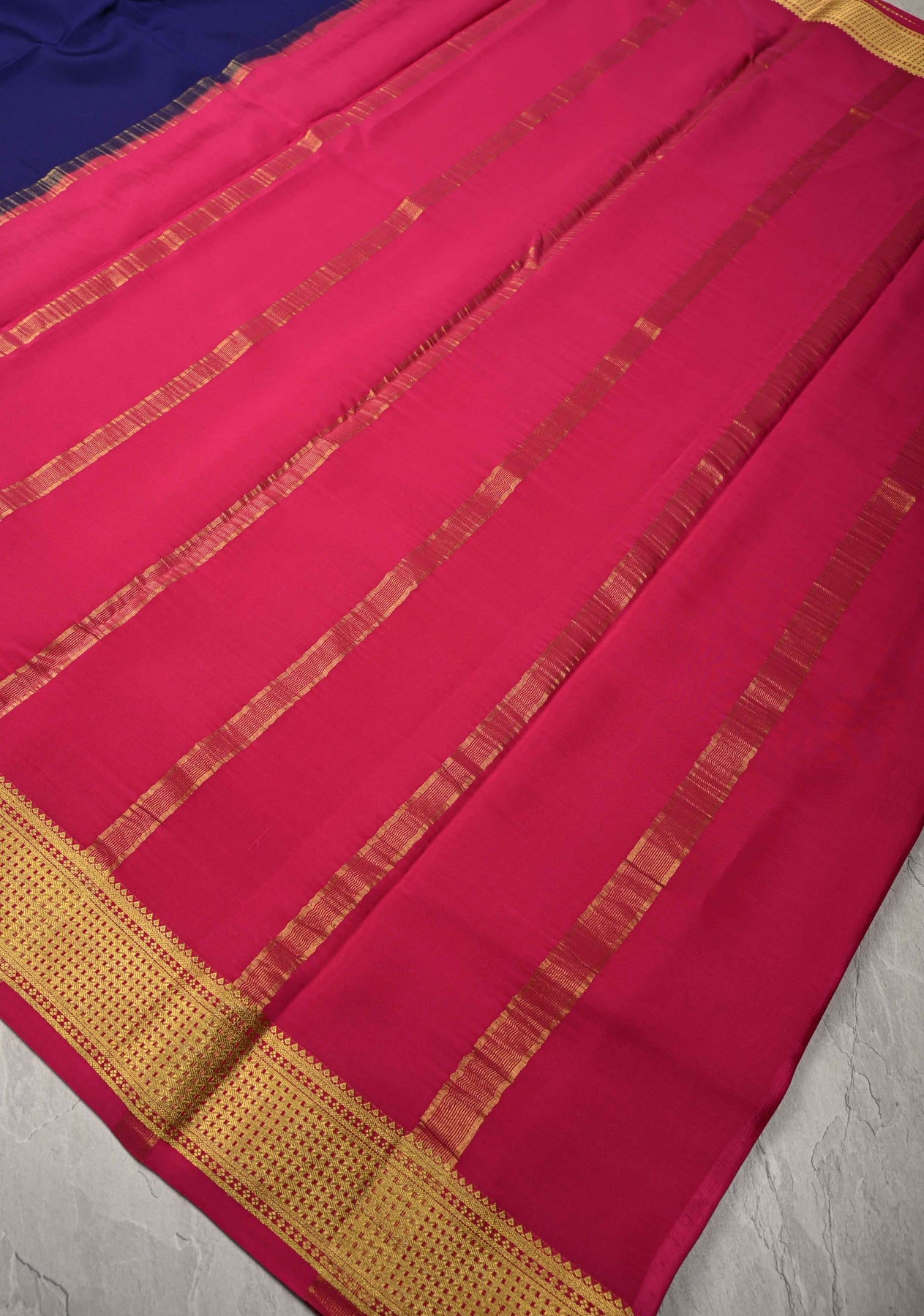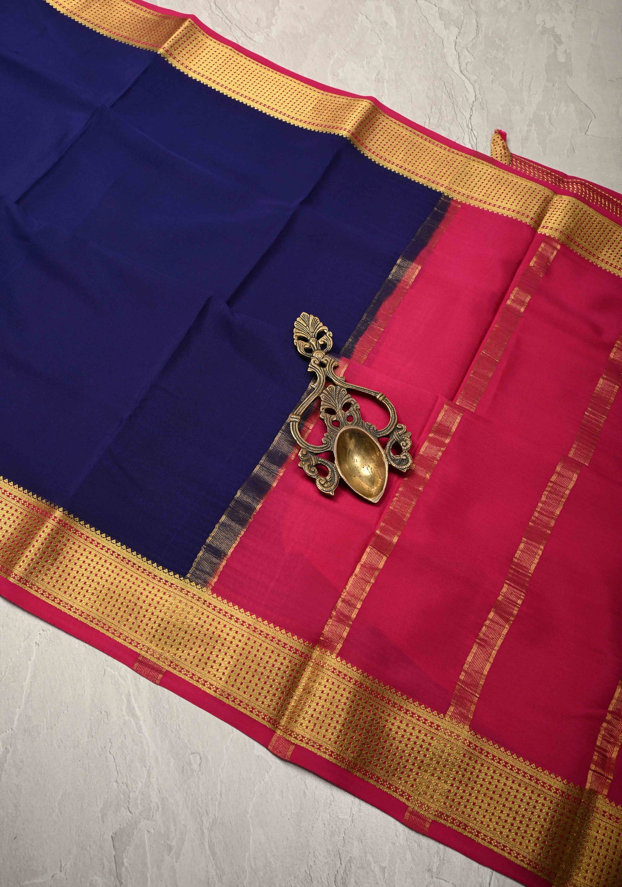 This Blue Mysore Silk Saree with Contrast Zari Borders is a timeless piece that beautifully blends elegance with tradition. Crafted from pure Mysore silk, the saree features a rich dark hue that exudes depth and grace. The contrasting zari borders — intricately woven in gold tones — add a regal touch, highlighting the saree’s luxurious appeal. Known for its smooth texture and lightweight drape, this saree is both comfortable and stunning, making it an ideal choice for weddings, festive occasions, and cultural events.