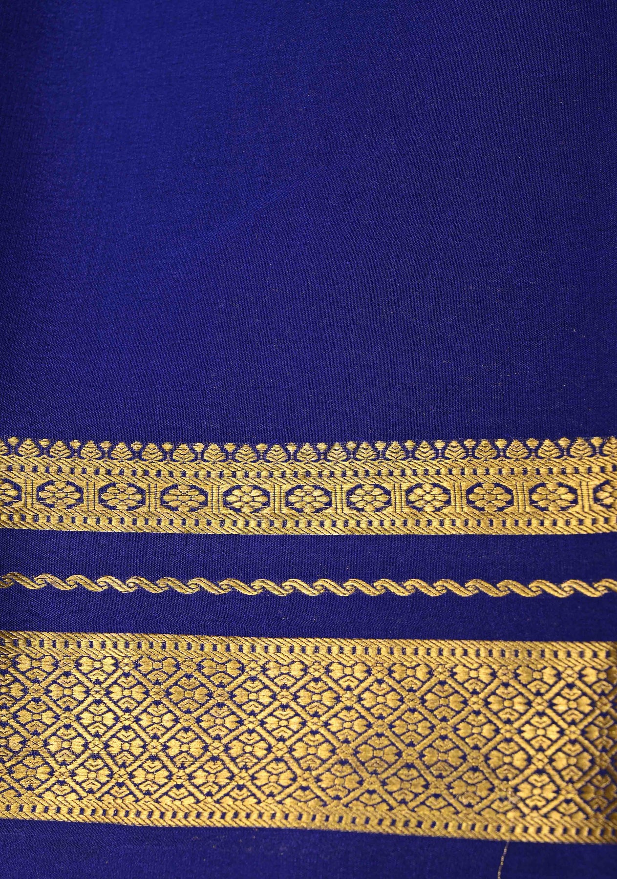 This Ink Blue Pure Mysore Silk Saree beautifully blends deep hues with intricate craftsmanship. The rich ink blue body is elegantly contrasted by Podi-Kattam zari checks woven on a ochre base, creating a subtle yet striking interplay of colors. Made from pure Mysore silk, the saree offers a smooth, lightweight texture with a graceful drape. The finely crafted zari border adds a touch of traditional sophistication, making this saree a perfect choice for weddings, festive occasions, and cultural celebrations where timeless elegance is desired.