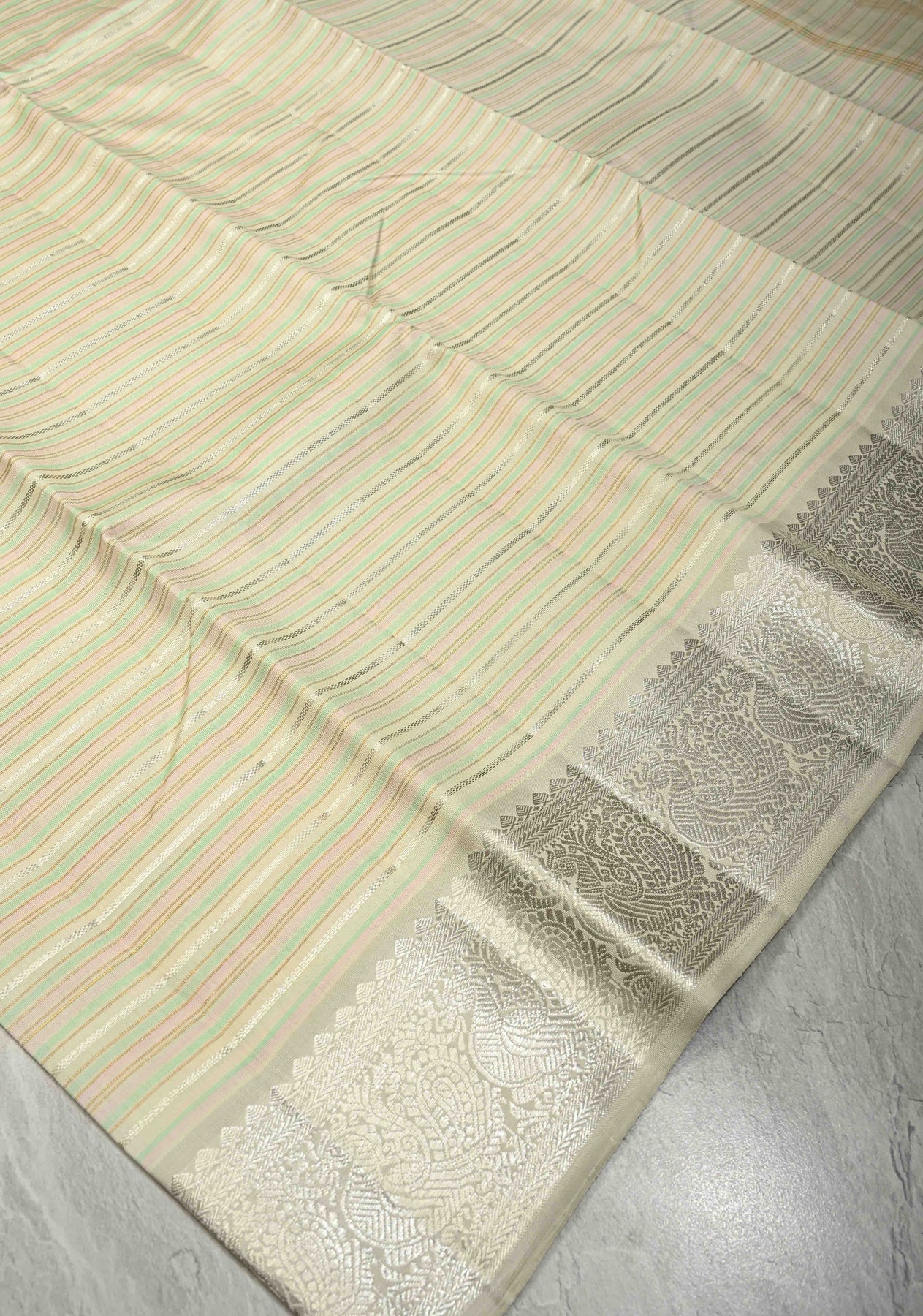 Ivory Contemporary Pure Kanjivaram Silk Saree with Silver Zari-Pastel Stripes and Zari Border | SILK MARK CERTIFIED