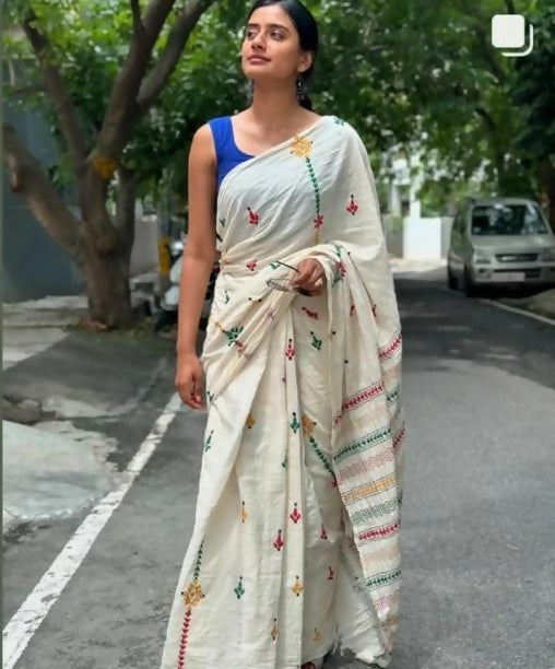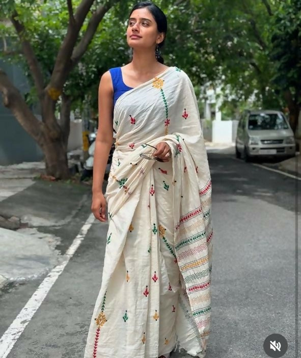 Handcrafted Kantha Saree on a canvas of white Mul Cotton. Designed to feel light and effortless, this saree offers comfort that carries you through the day.