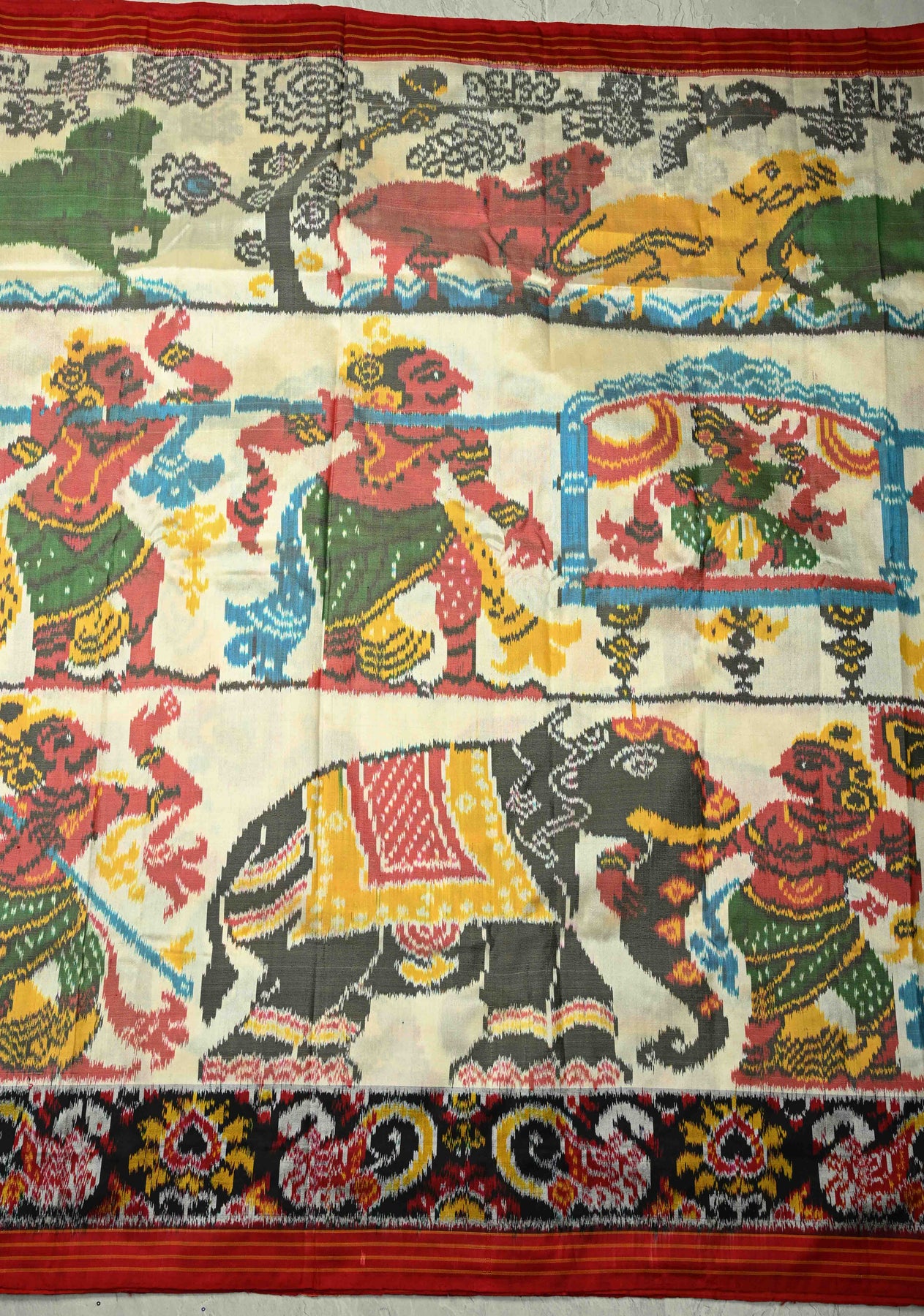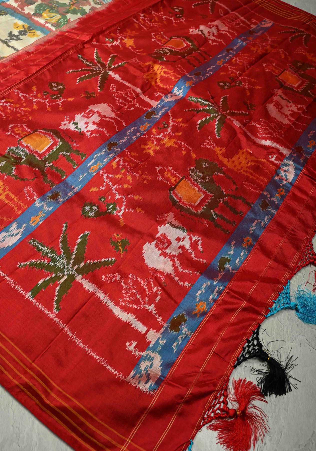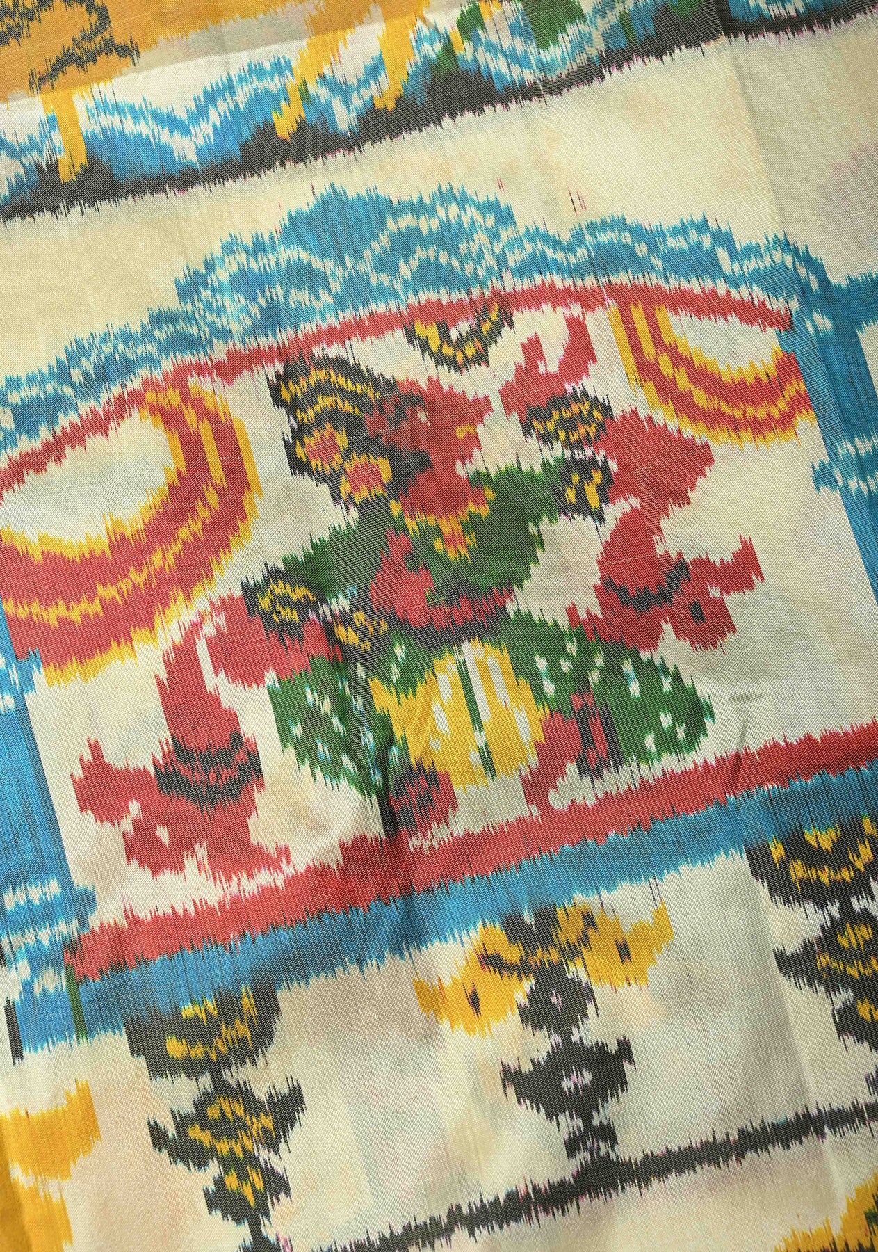 Experience the timeless allure of this Ivory Pochampally Ikkat Pure Silk Saree. Woven from lustrous pure silk, the saree drapes elegantly and features the signature feathered geometric patterns of the traditional Ikkat weave across the body.