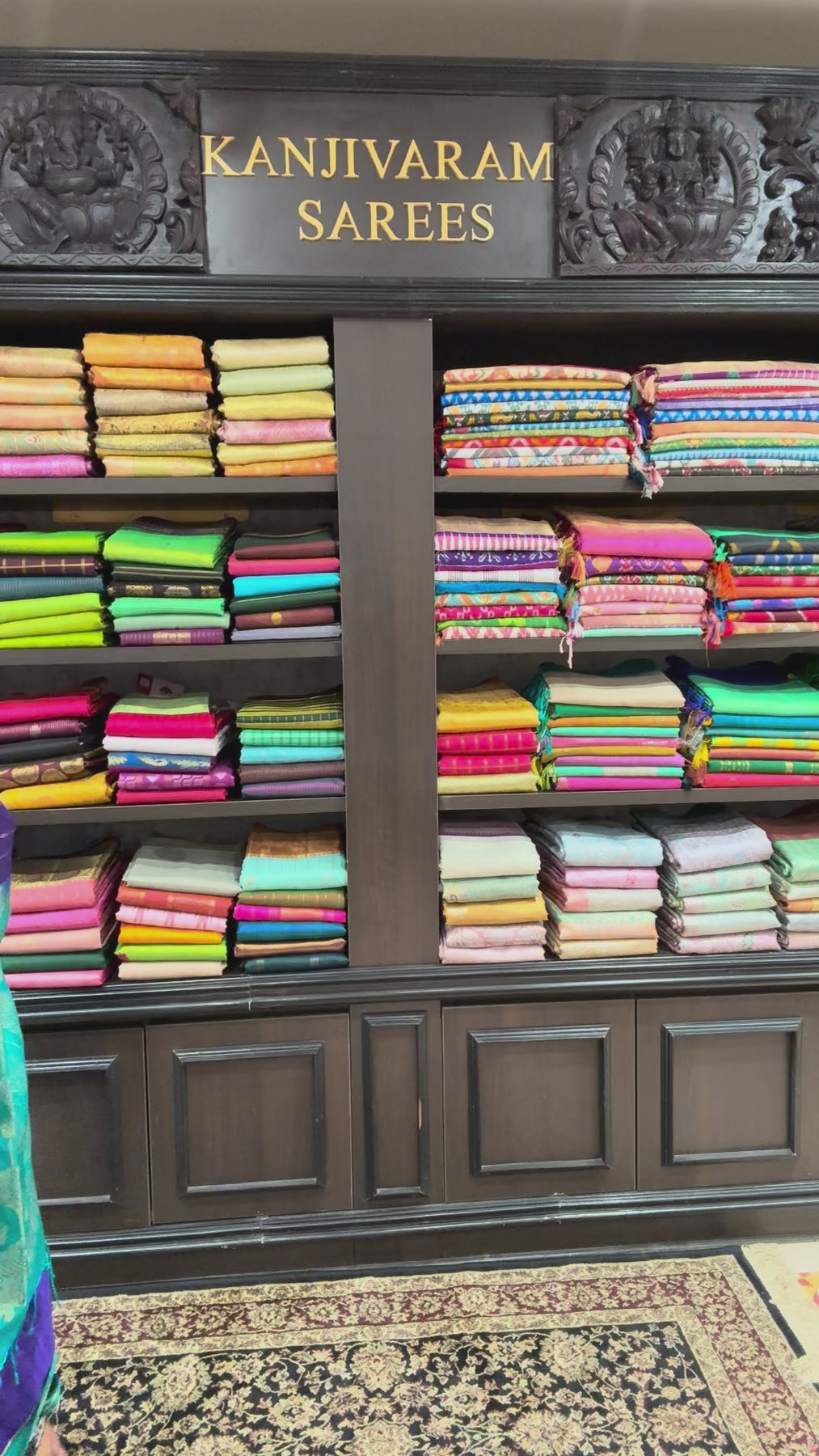 The serene ivory body is adorned with subtle gold-silver zari stripes, lending a refined shimmer and contemporary elegance. Enhancing its beauty is a vibrant contrast orange zari border, which adds a striking pop of color while maintaining classic Kanjivaram aesthetics. A perfect blend of sophistication and tradition, this saree is a must-have for elegant festive styling.