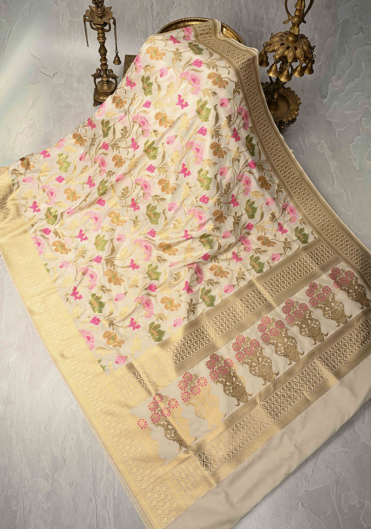 Step into effortless grace with this Ivory Semi Silk Saree, a timeless piece that beautifully blends subtle charm with intricate craftsmanship. The saree features an all-over Meenakari floral jaal, delicately woven in soft, multicolored threads that add a touch of vibrancy to the serene ivory base.