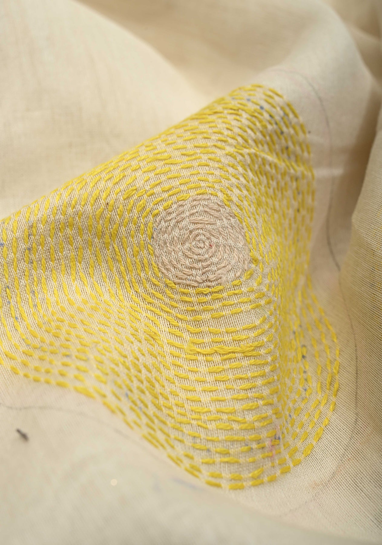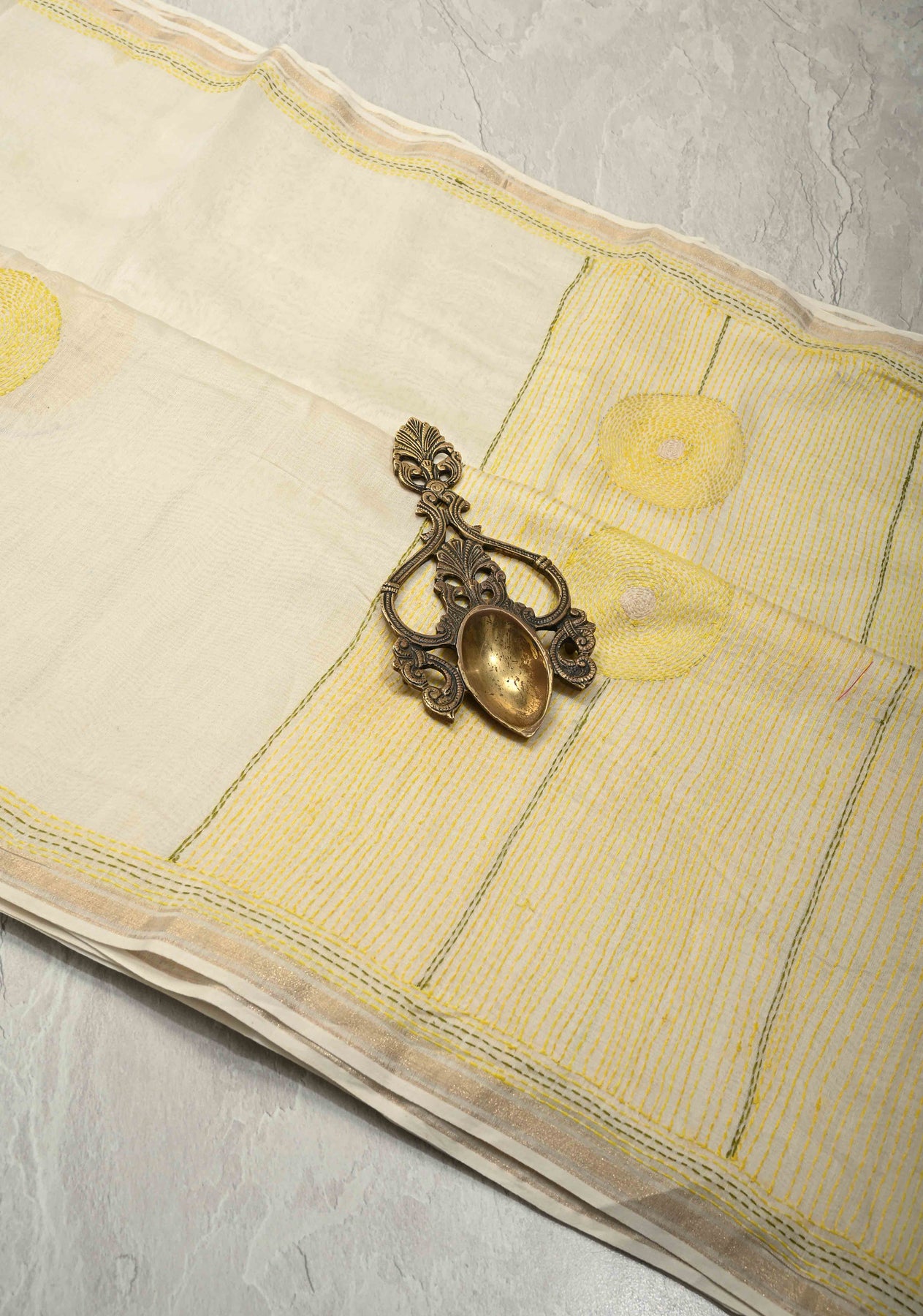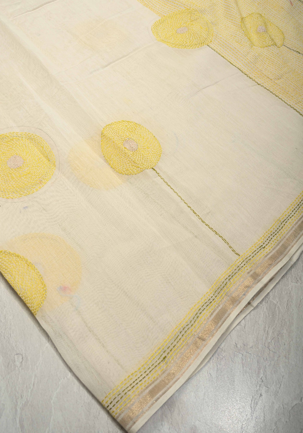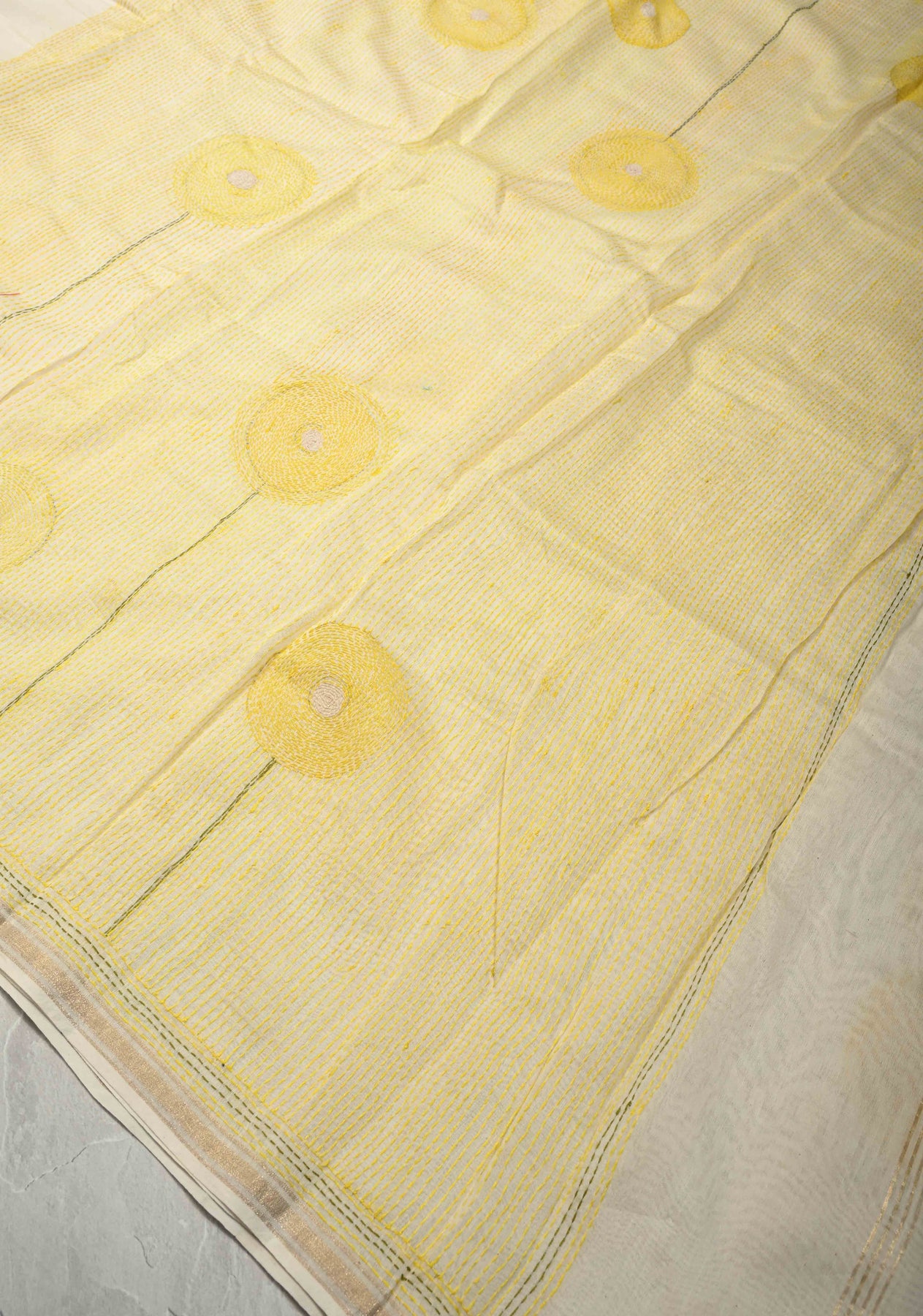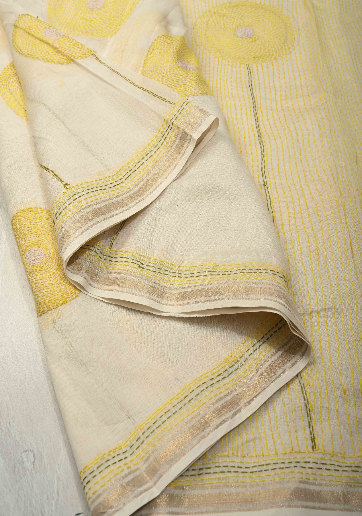 Graceful and refined, this Ivory Chanderi Silk Saree features a delicate sunflower theme brought to life with authentic Sujni embroidery. Crafted from fine Chanderi silk, the saree offers a lightweight, airy drape with a subtle natural sheen. The soft ivory base beautifully enhances the intricate hand-embroidered sunflower motifs, while the minimal zari border adds a touch of understated elegance. Perfect for festive occasions, cultural gatherings, or elegant daytime events, this saree is a timeless blend of heritage craftsmanship and contemporary sophistication.
