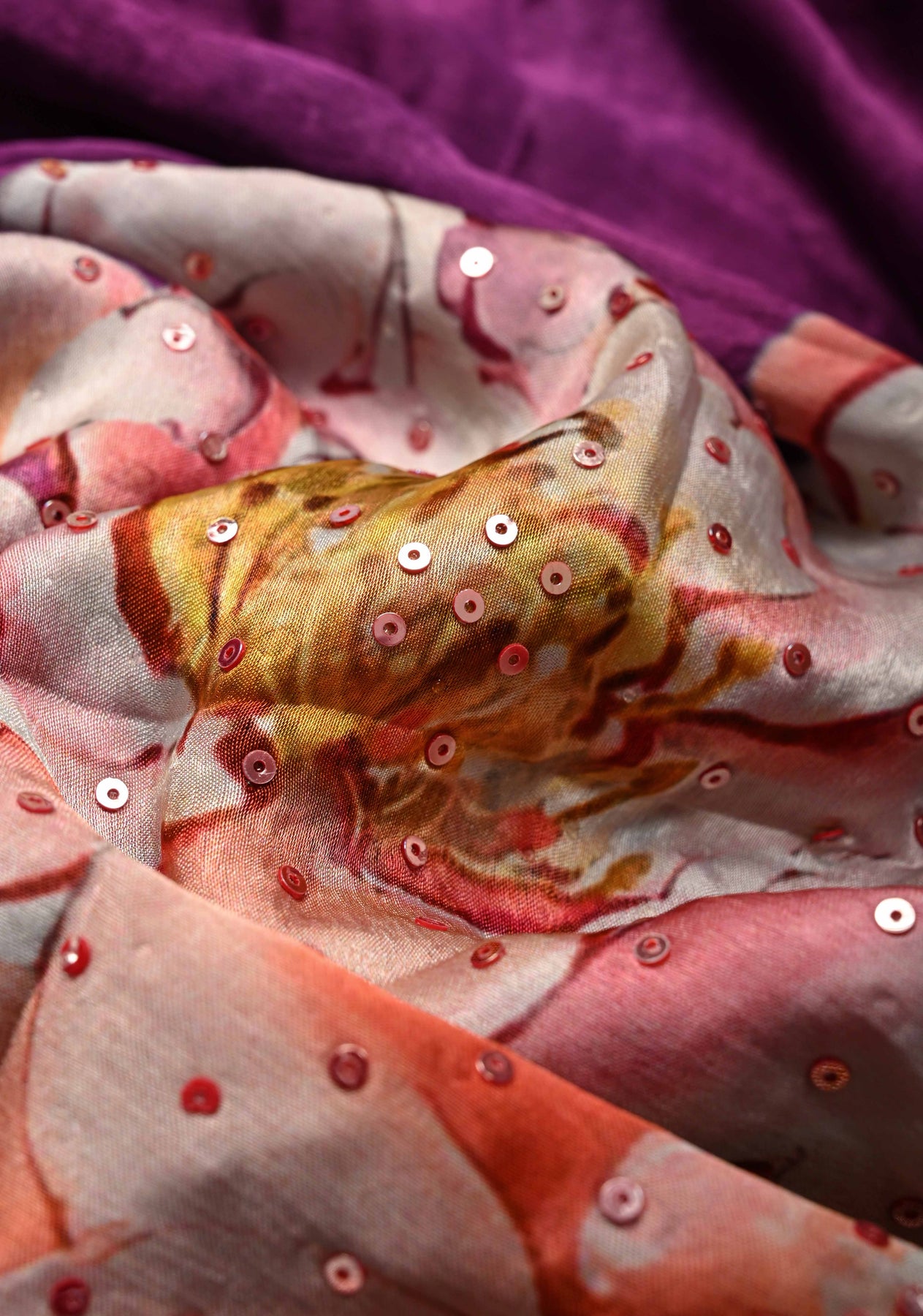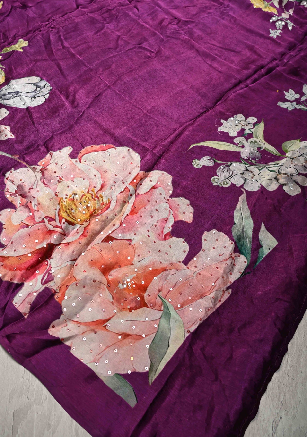 Embrace elegance with this Jamuni Purple Satin Georgette Saree, featuring a stunning floral digital print that adds a contemporary artistic flair. The soft satin georgette fabric drapes gracefully, enhanced with delicate sequins that shimmer subtly under light, perfect for evening events and festive celebrations. Lightweight and vibrant, this saree pairs beautifully with simple accessories to create a sophisticated, modern look.