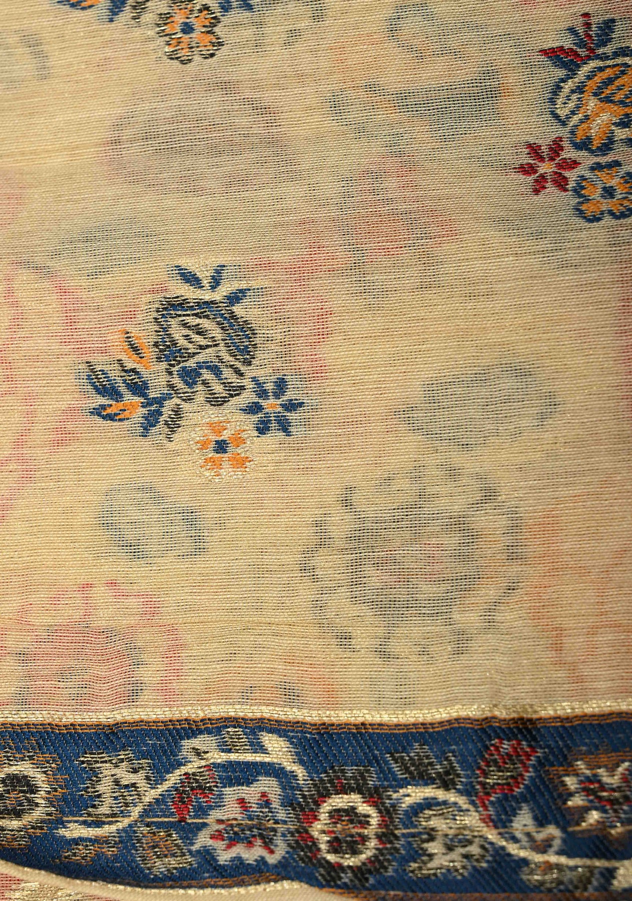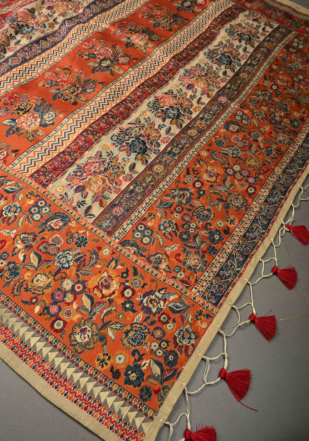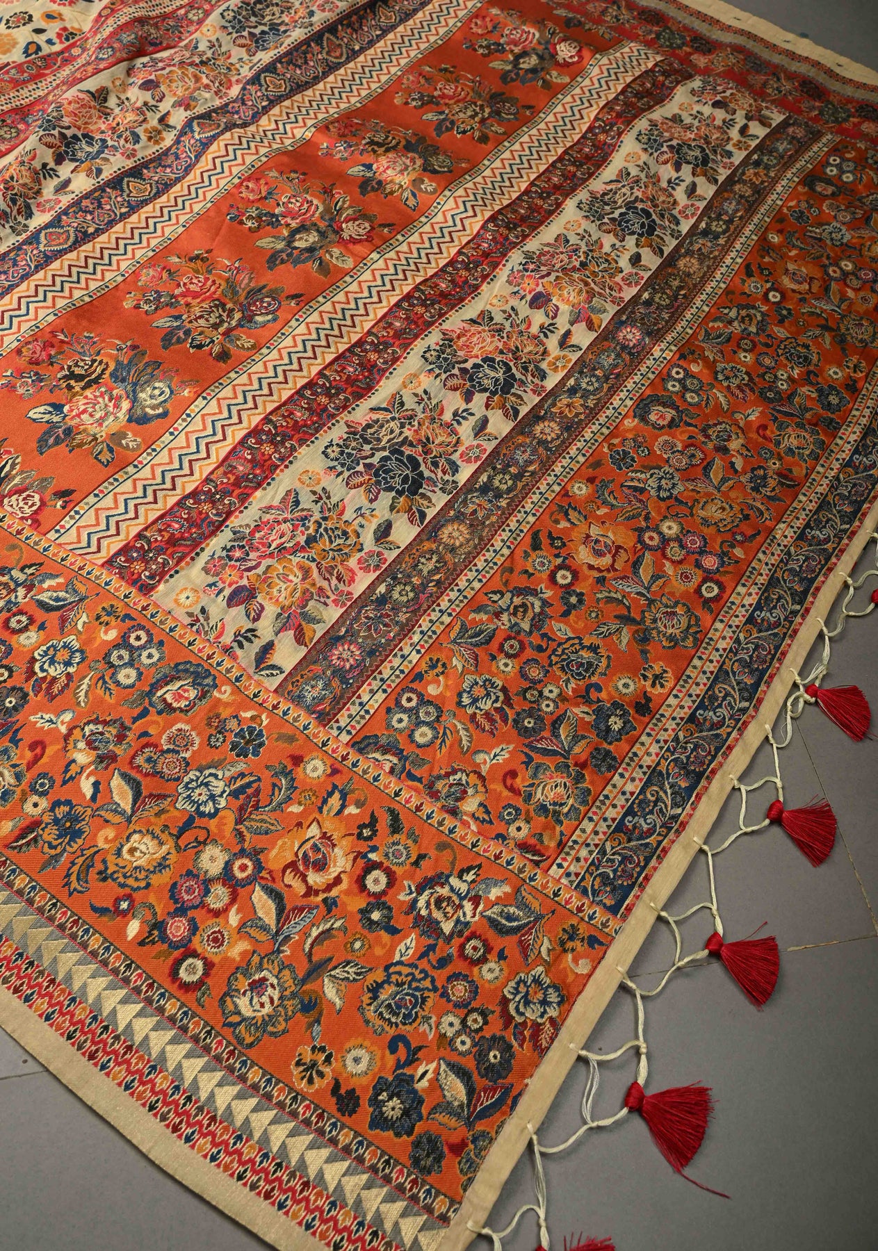 Embrace timeless sophistication with this exquisite Beige Rayon Saree, featuring a signature Kani-style floral jaal. The intricate vine patterns, inspired by traditional Kashmiri weaving, sprawl gracefully across the soft, breathable rayon fabric, offering a perfect blend of heritage and comfort.