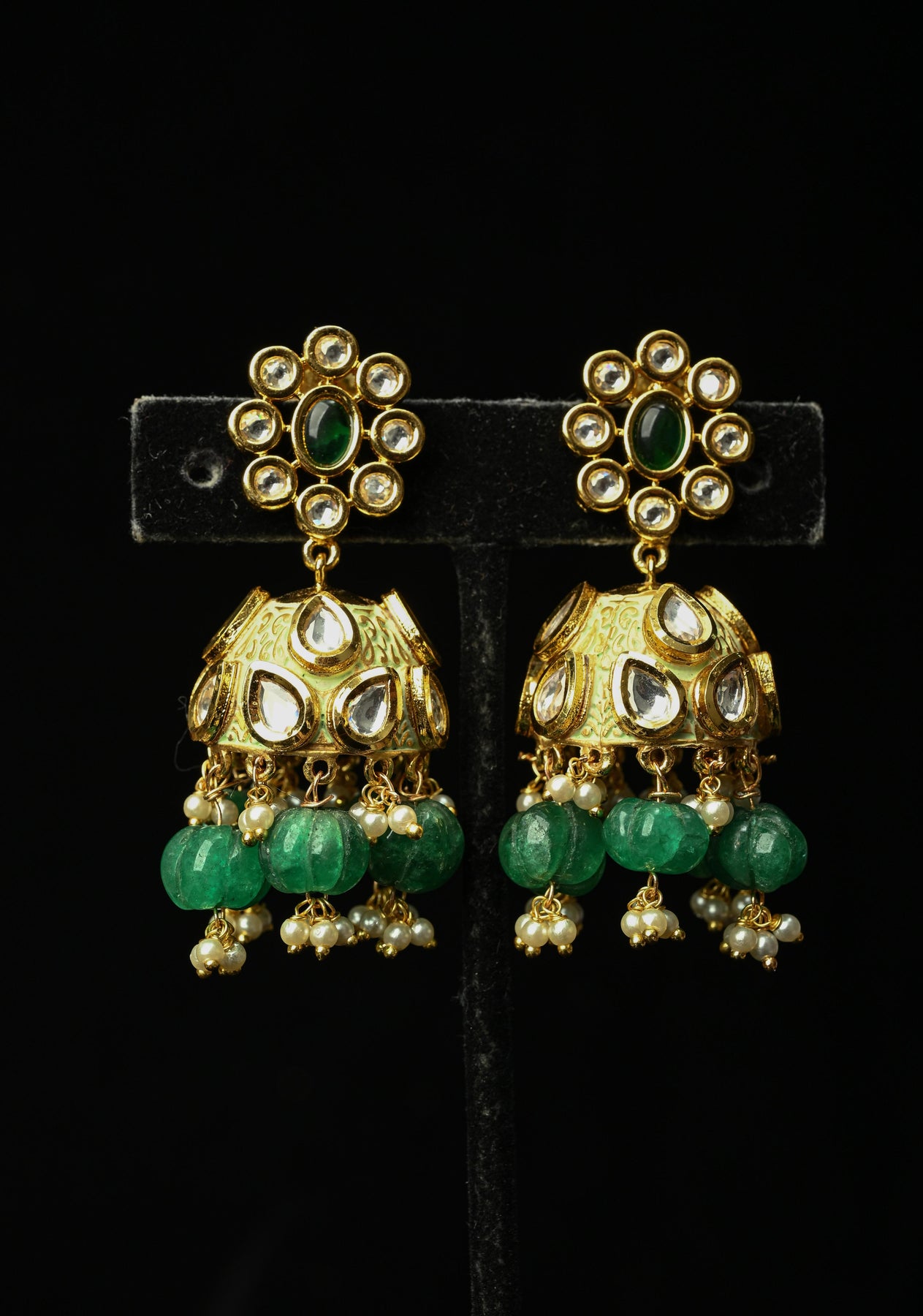Elevate your look with our Kanika Floral Kundan and Meenakari Jhumki earrings. Handcrafted with intricate floral designs and featuring authentic Kundan and Meenakari work, these jhumkis add a touch of elegance and traditional charm to any outfit. Grab a pair today and experience the timeless beauty of Indian jewelry!