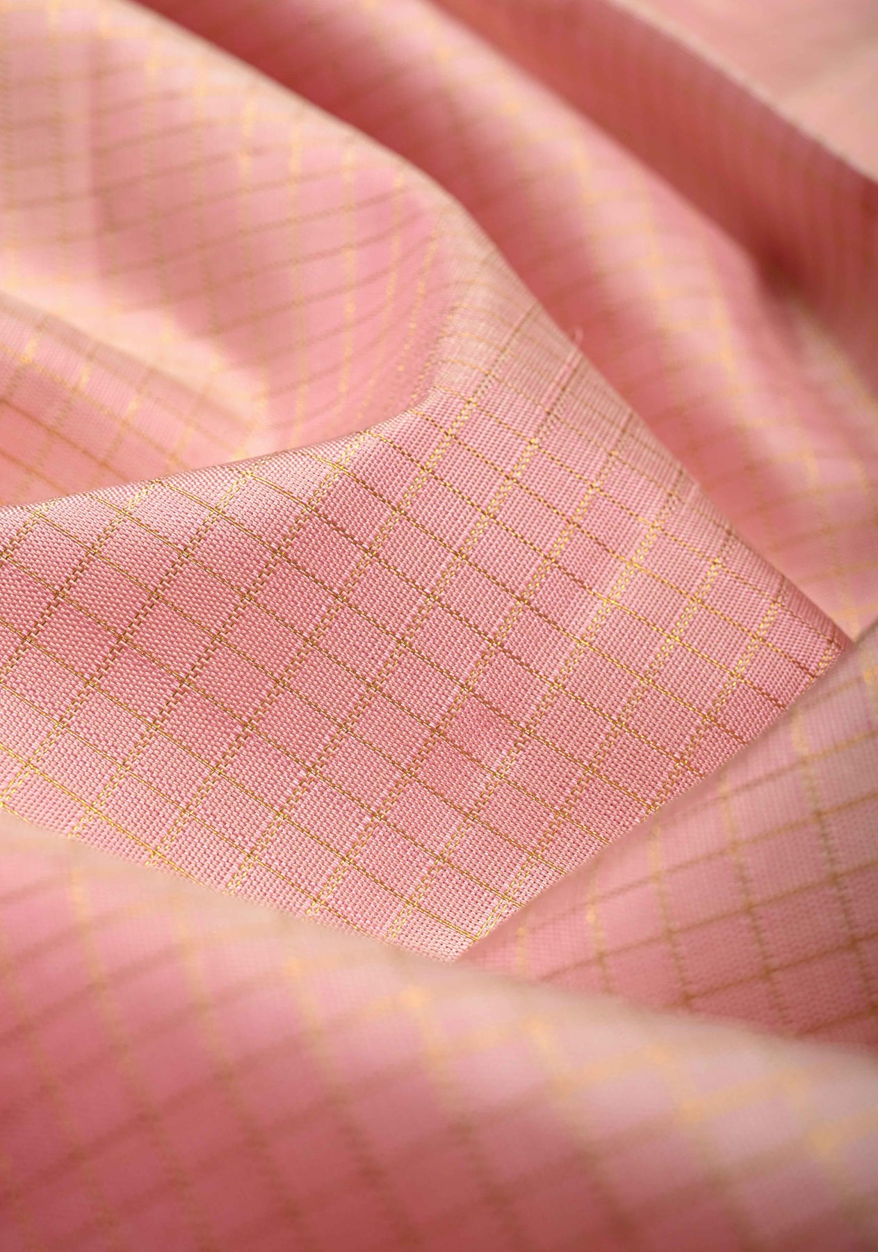 The Korvai Baby Pink Kanjivaram Pure Silk Saree is a breathtaking piece of craftsmanship, designed to capture the essence of tradition with a modern touch. The baby pink hue of the saree creates an elegant base, while the podi-kattam zari checks in intricate gold zari add a timeless appeal. These zari checks shimmer subtly, reflecting the craftsmanship that Kanjivaram sarees are known for. The saree is further accentuated by a contrast zari border, woven with traditional designs, typically in gold zari, creating a stunning visual contrast against the delicate pink. The Korvai technique used in the saree ensures the seamless joining of the body and the border, highlighting the distinct difference in texture and design. This saree is perfect for weddings, festivals, or any ceremonial occasion, offering a blend of grace, luxury, and cultural heritage.