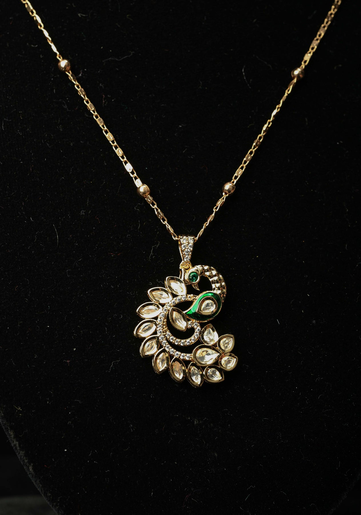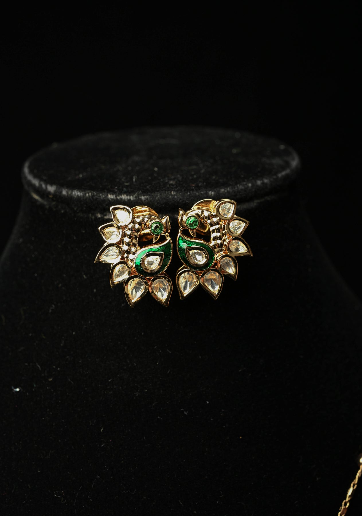 The Regal Mor Pendant Set is an exquisite jewelry ensemble that radiates elegance and sophistication. Featuring a beautifully designed peacock-inspired (Mor) pendant adorned with sparkling stones, this set captures attention with its intricate craftsmanship and artistic detailing. The matching earrings perfectly complement the pendant, creating a harmonious and graceful look. Ideal for weddings, festive occasions, or special celebrations, the Regal Mor Pendant Set adds a touch of regal charm to any outfit. Its luxurious design and polished finish make it a standout accessory, perfect for those who wish to make a stylish and memorable statement.