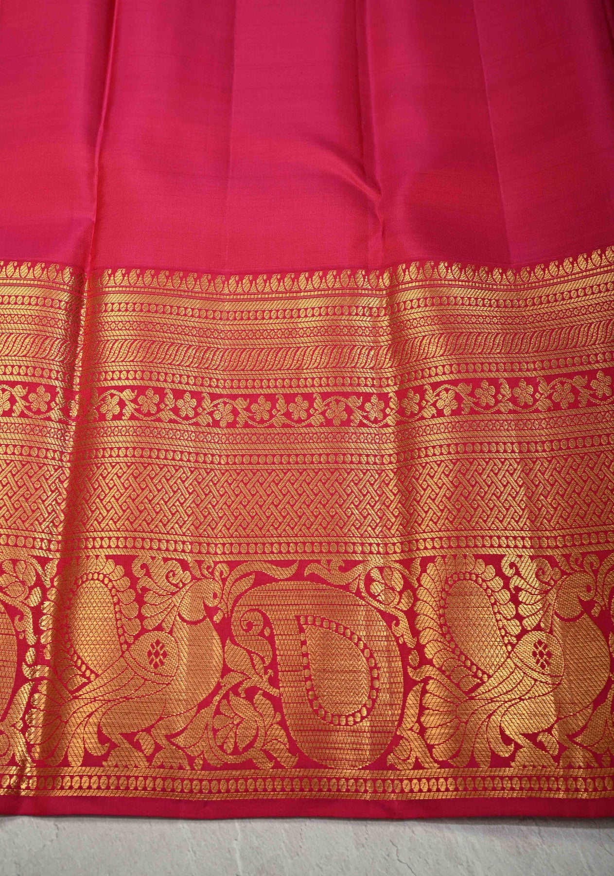 Exude royal charm in this Lavender Mauve Kanjivaram Pure Silk Saree. The body features an all-over silver Zari diamond brocade that creates a shimmering, sophisticated texture. A striking contrast red "skirt" border adds grandeur, meticulously woven with traditional gold Zari peacock and floral motifs. Perfect for weddings, this heritage piece balances soft pastel tones with a bold, festive finish.