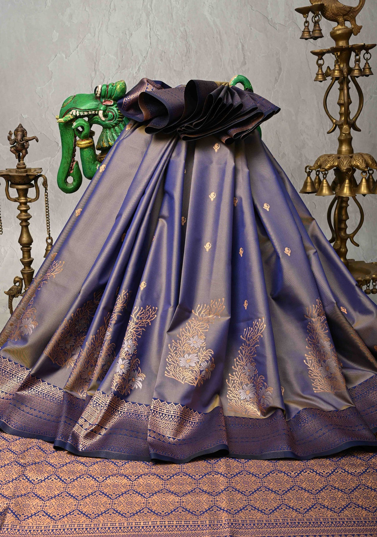 the pallu and add more grace to it. An unstitched blouse fabric is included.
