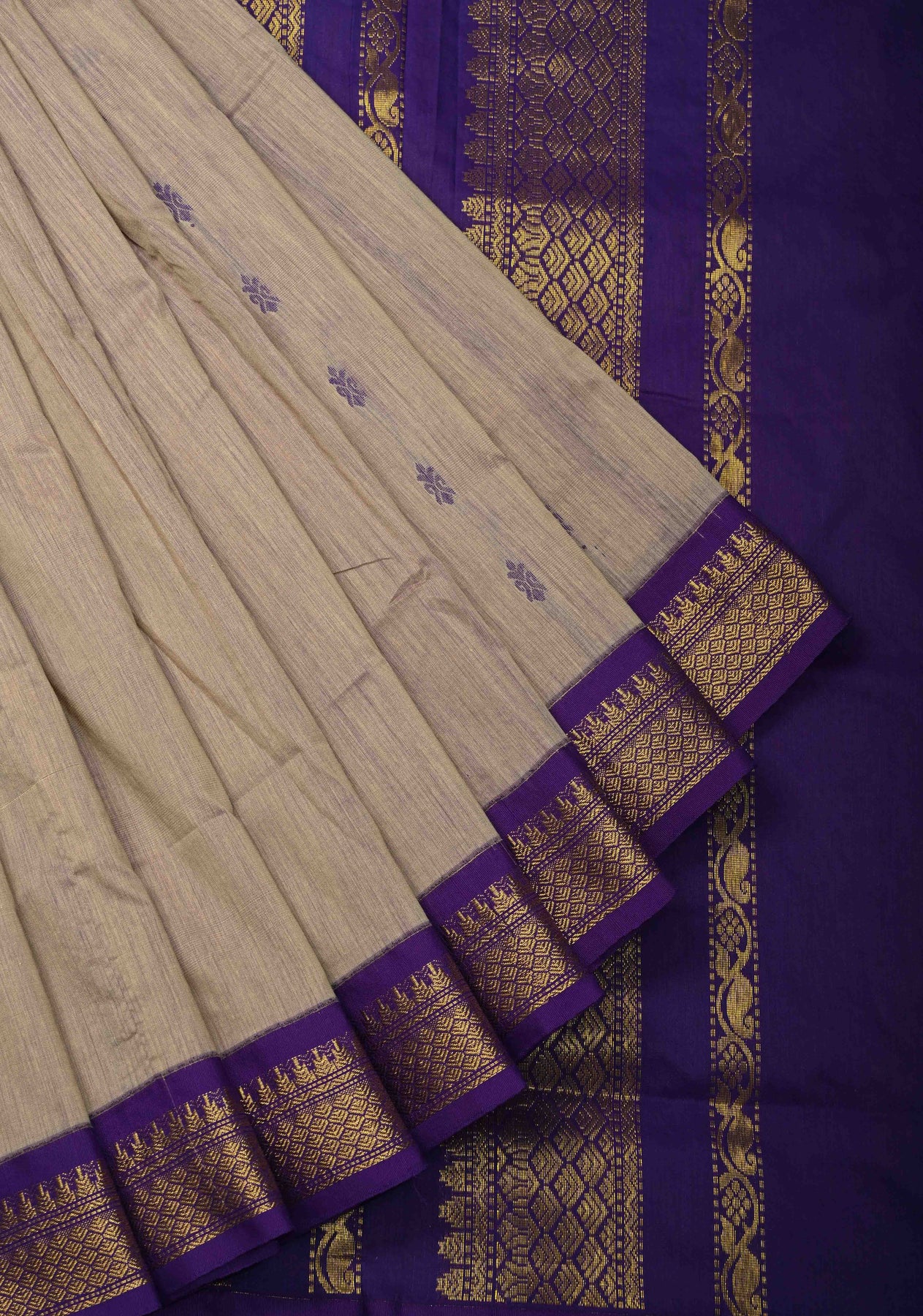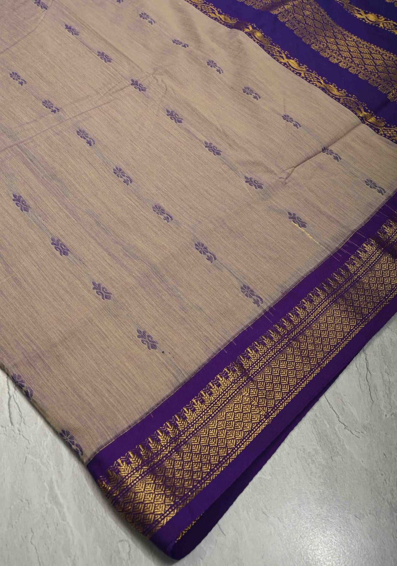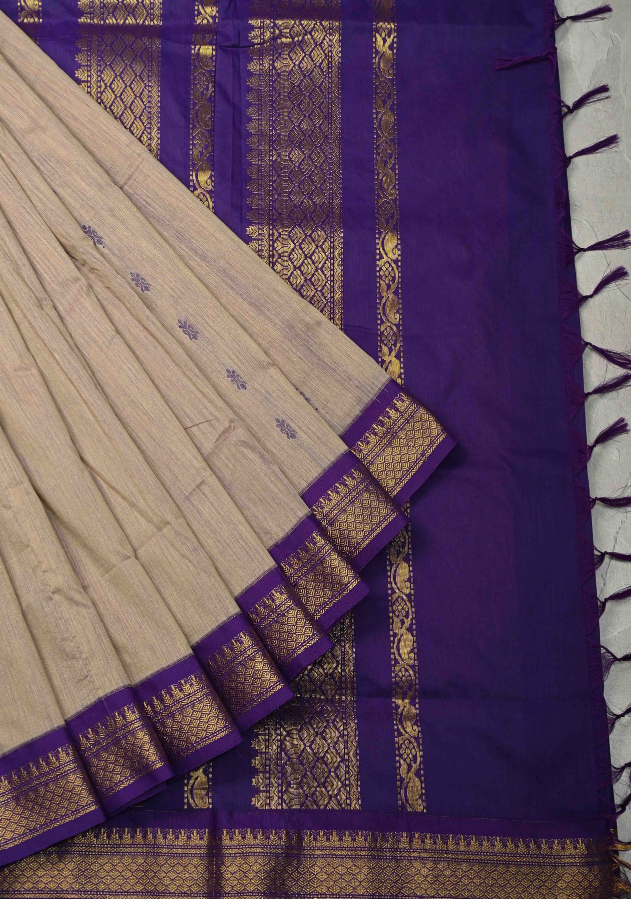 Light Fawn Cotton Silk Saree with Thread Buttas and Contrast Zari Border