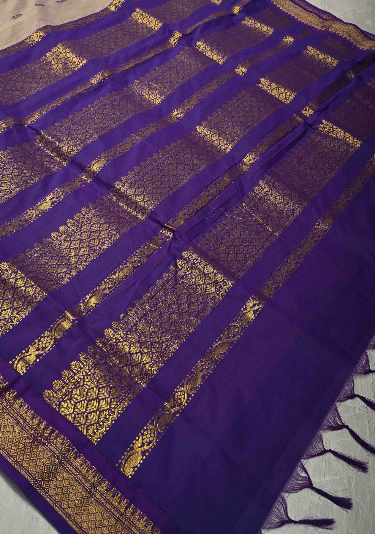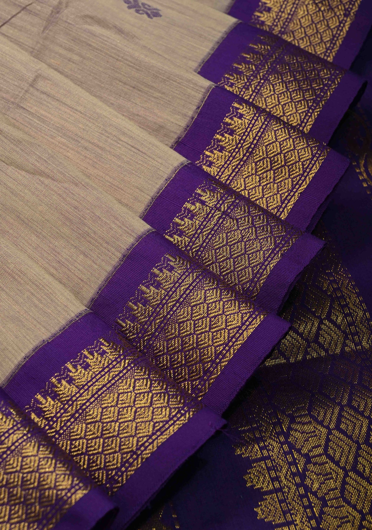 Experience the perfect blend of understated elegance and vibrant tradition with this Light Fawn Cotton Silk Saree. The earthy, neutral body is beautifully balanced by a striking deep purple contrast border and pallu, making it a versatile choice for both professional settings and festive gatherings. Handcrafted with attention to detail, this saree offers a sophisticated silhouette with a touch of regal charm.
