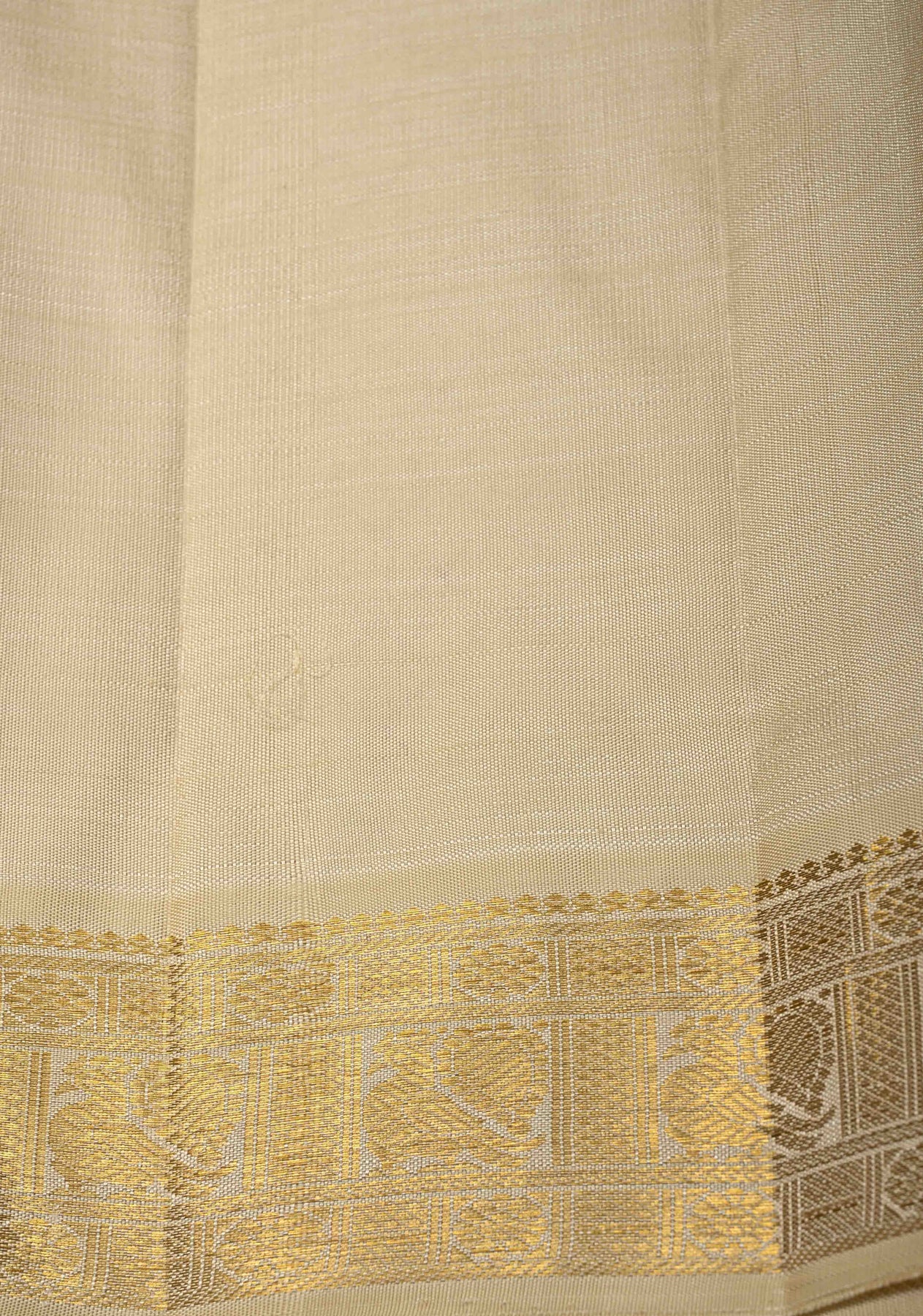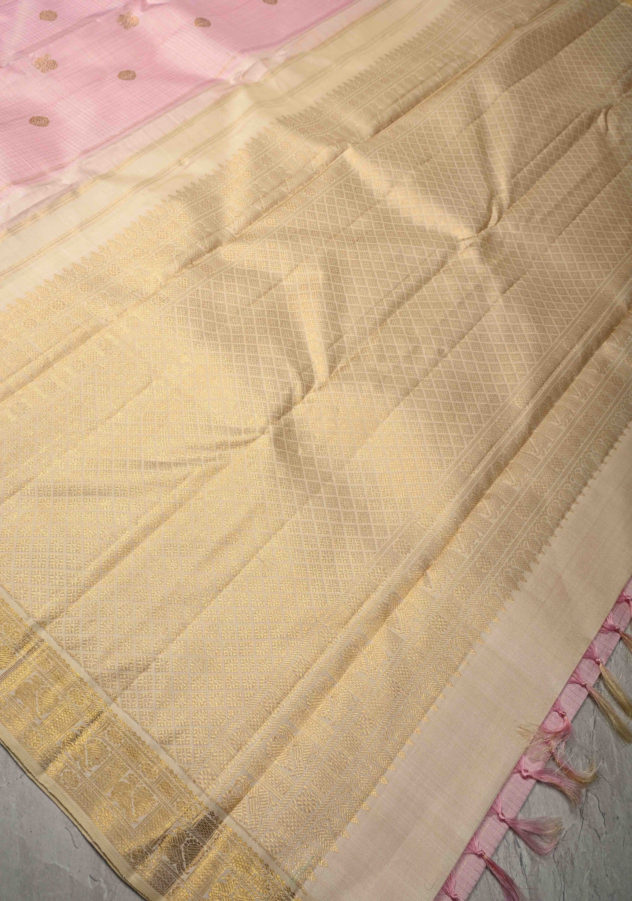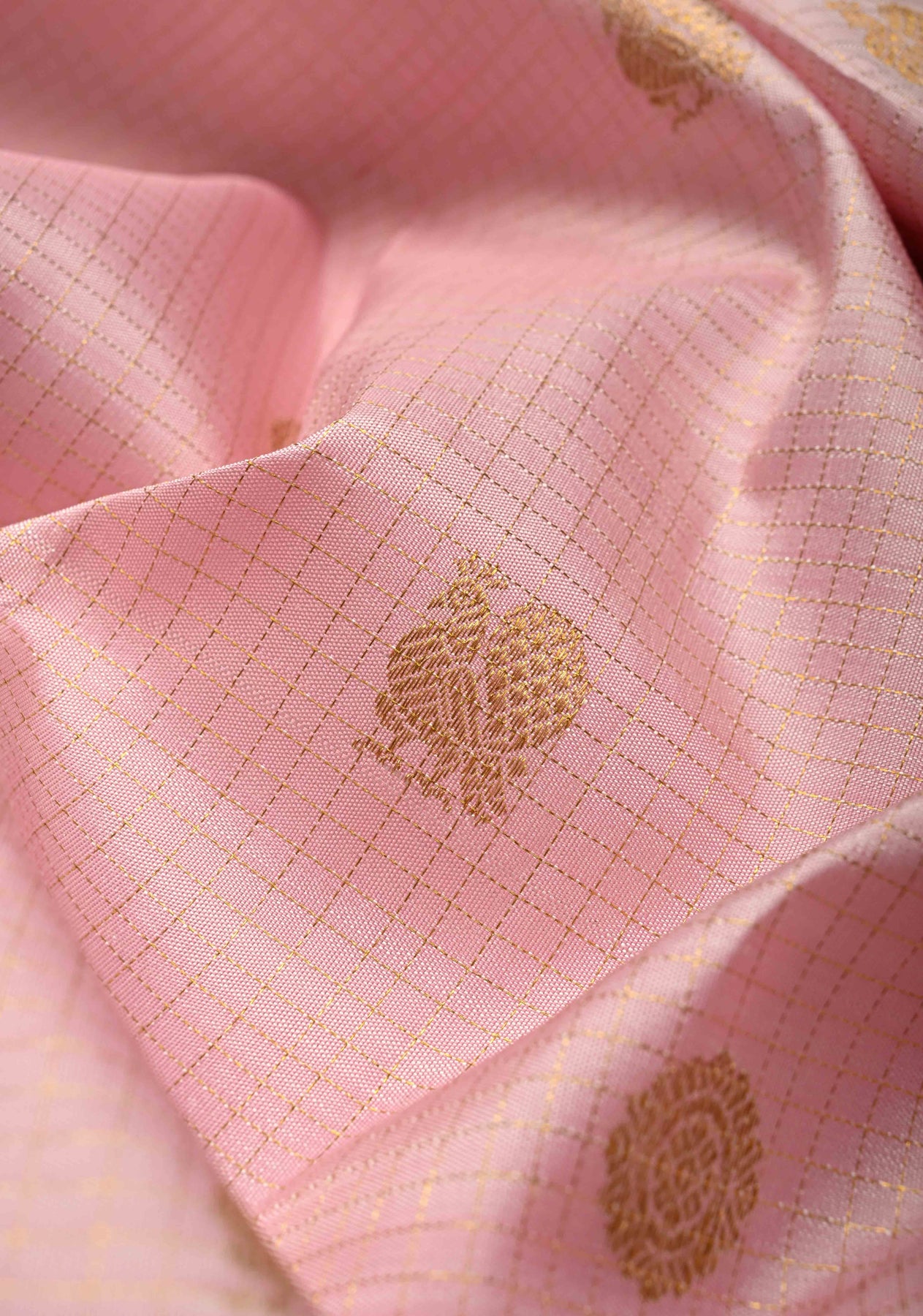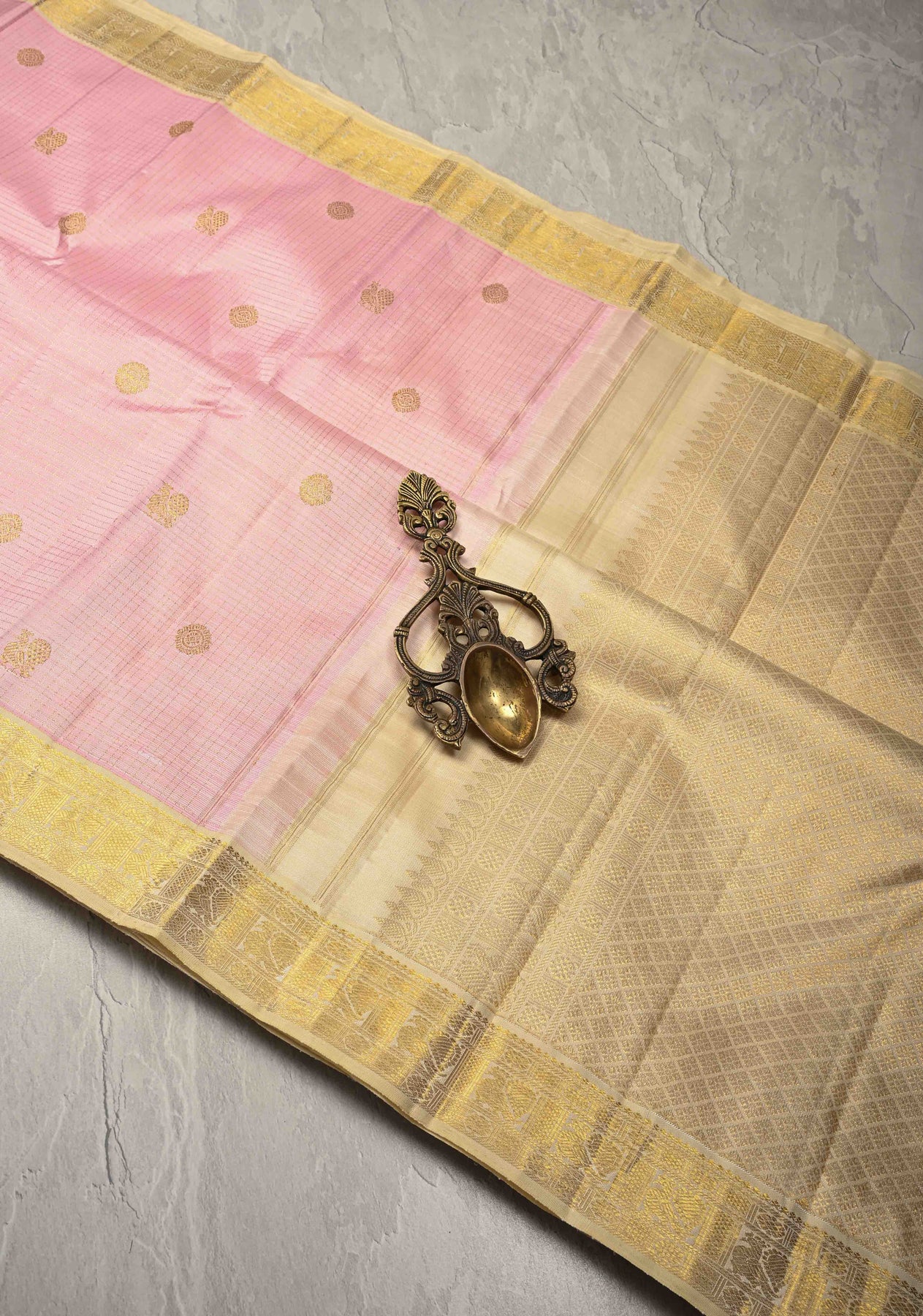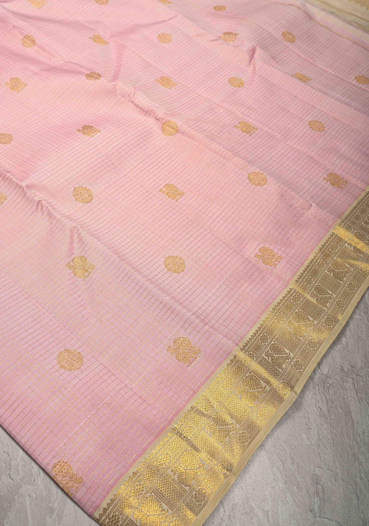 Soft, elegant, and steeped in tradition, this Light Rose Pink Kanjivaram Pure Silk Saree is a timeless expression of South Indian weaving artistry. Crafted from authentic pure Kanjivaram silk, the saree is adorned with classic Podi Kattam zari buttas—fine, checked motifs delicately woven in shimmering zari that lend subtle texture and sophistication to the body.