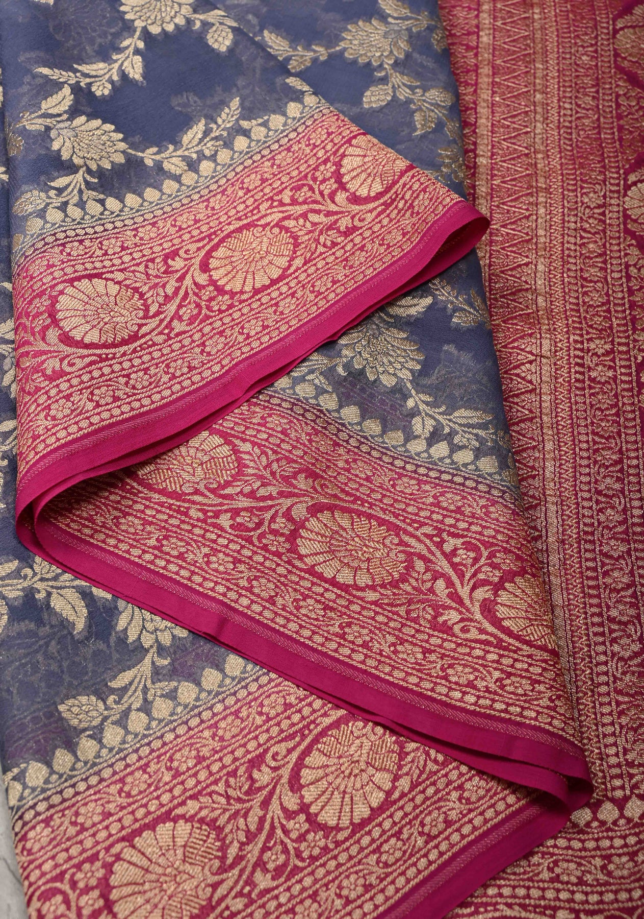 Drape yourself in timeless elegance with this exquisite Lilac Banarasi Georgette Silk Saree, a graceful fusion of tradition and contemporary charm. Crafted from soft, lightweight georgette silk, the saree features an intricately woven floral jaal pattern across the body, showcasing the finesse of Banarasi craftsmanship.
