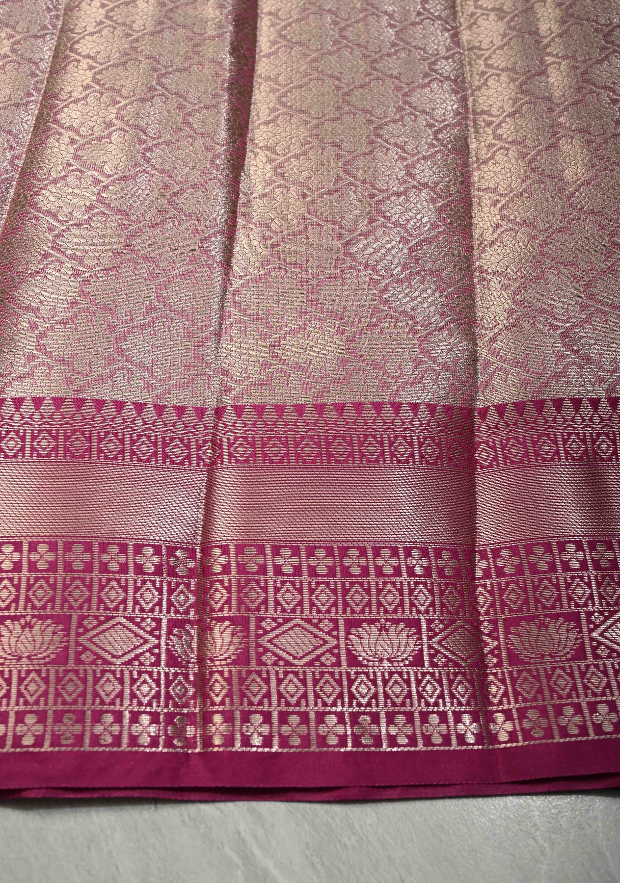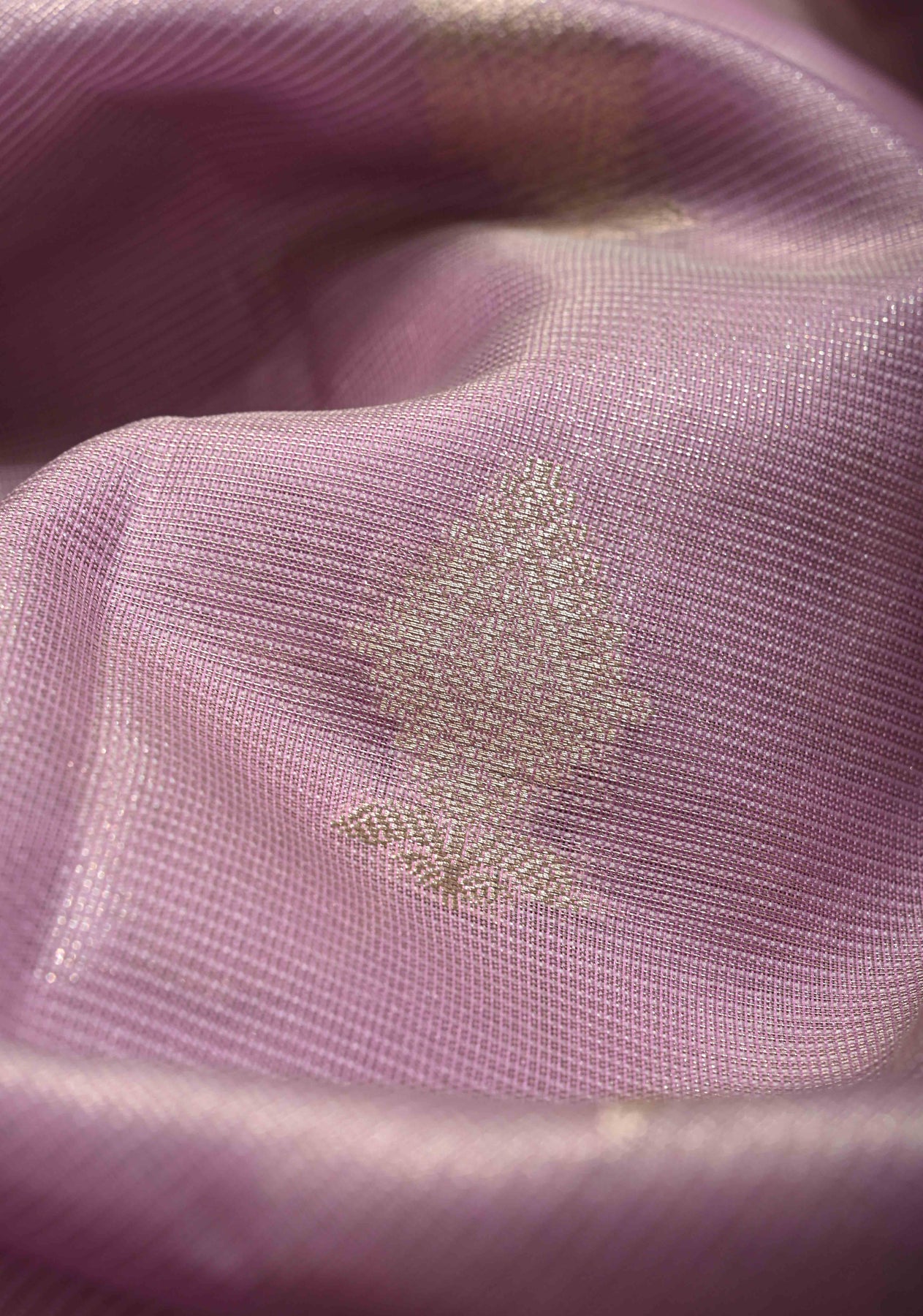 The Lilac Kanjivaram Tissue Semi Silk Saree with Zari Buttas and Contrast Zari Border is an elegant blend of traditional craftsmanship and contemporary charm. Crafted from tissue semi silk, this saree is adorned with delicate zari butta motifs that add subtle shimmer and timeless appeal. The contrast zari border enhances its richness, creating a striking visual balance and highlighting the classic Kanjivaram artistry.