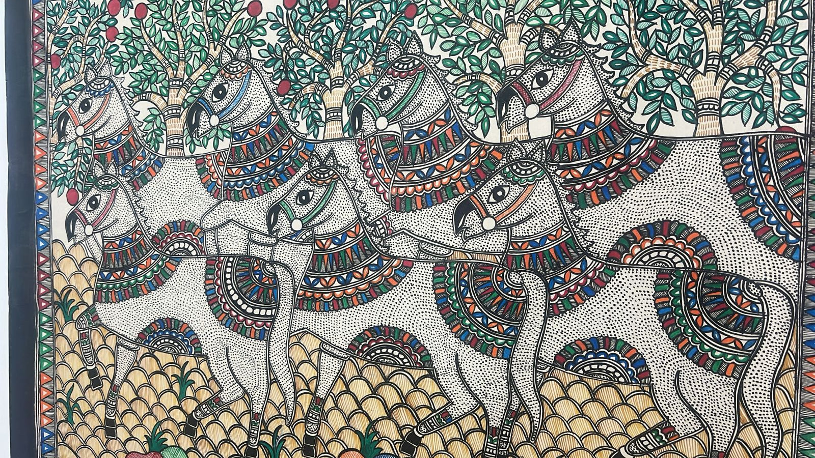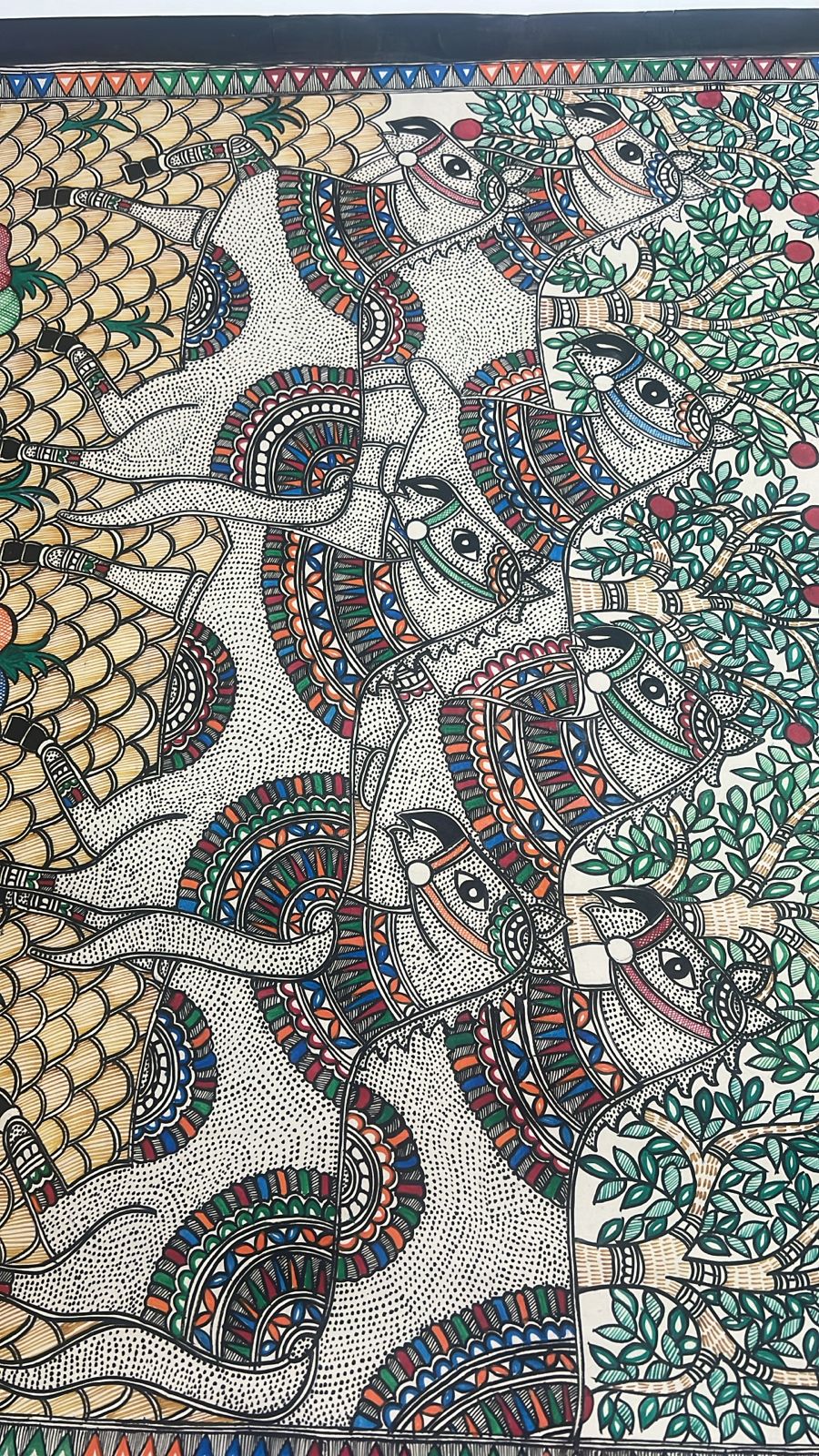 This Lucky 7 Horses Madhubani Wall Painting is a vibrant expression of traditional Indian folk art, symbolizing strength, success, and positive energy. Hand-painted by skilled Madhubani artists, the artwork features seven dynamic horses rendered in intricate patterns and bold natural colors, reflecting the authenticity of the Mithila style. The unframed format allows flexibility for custom framing to match your décor. Perfect for home, office, or gifting, this painting brings an auspicious and artistic touch to any space.
