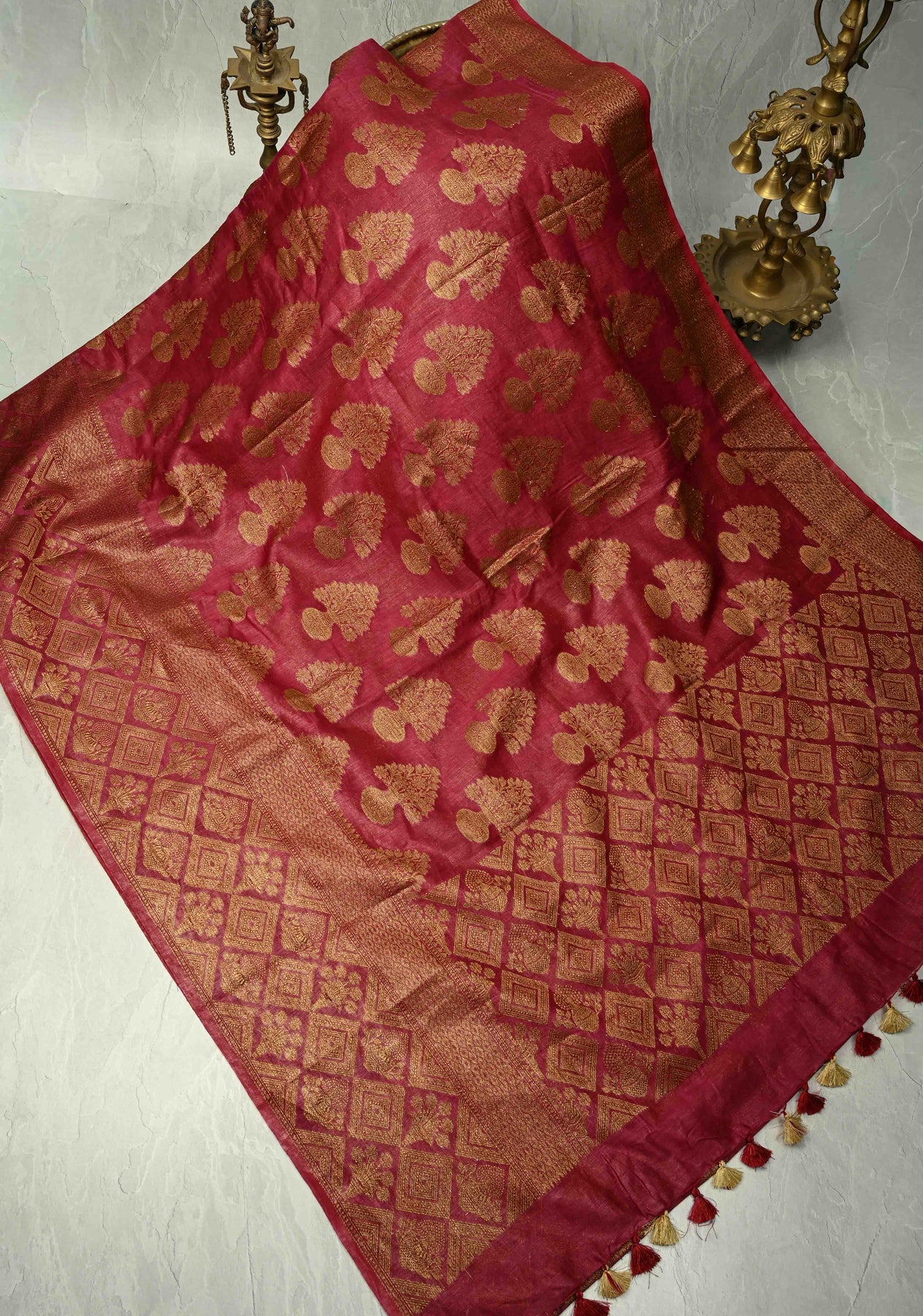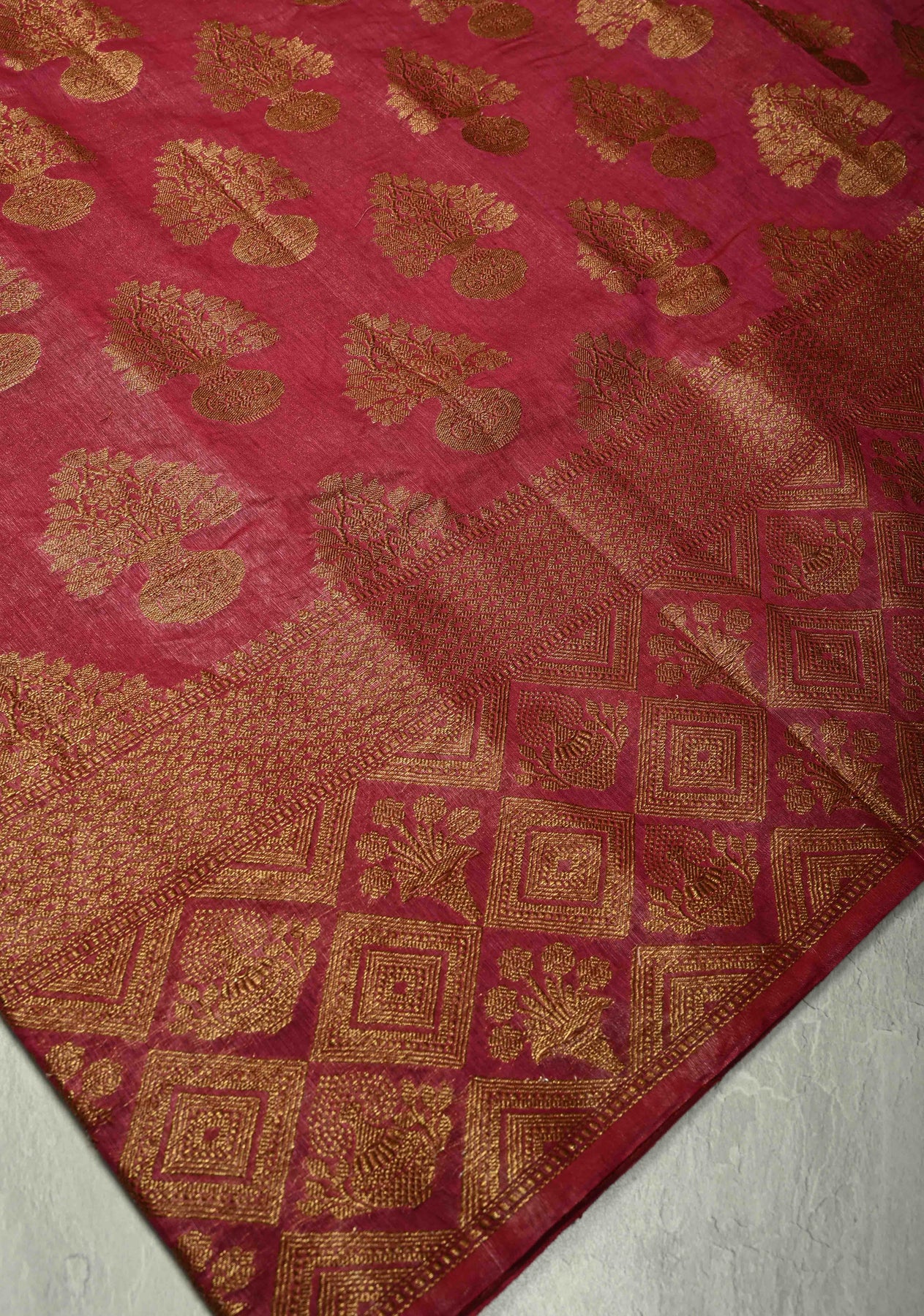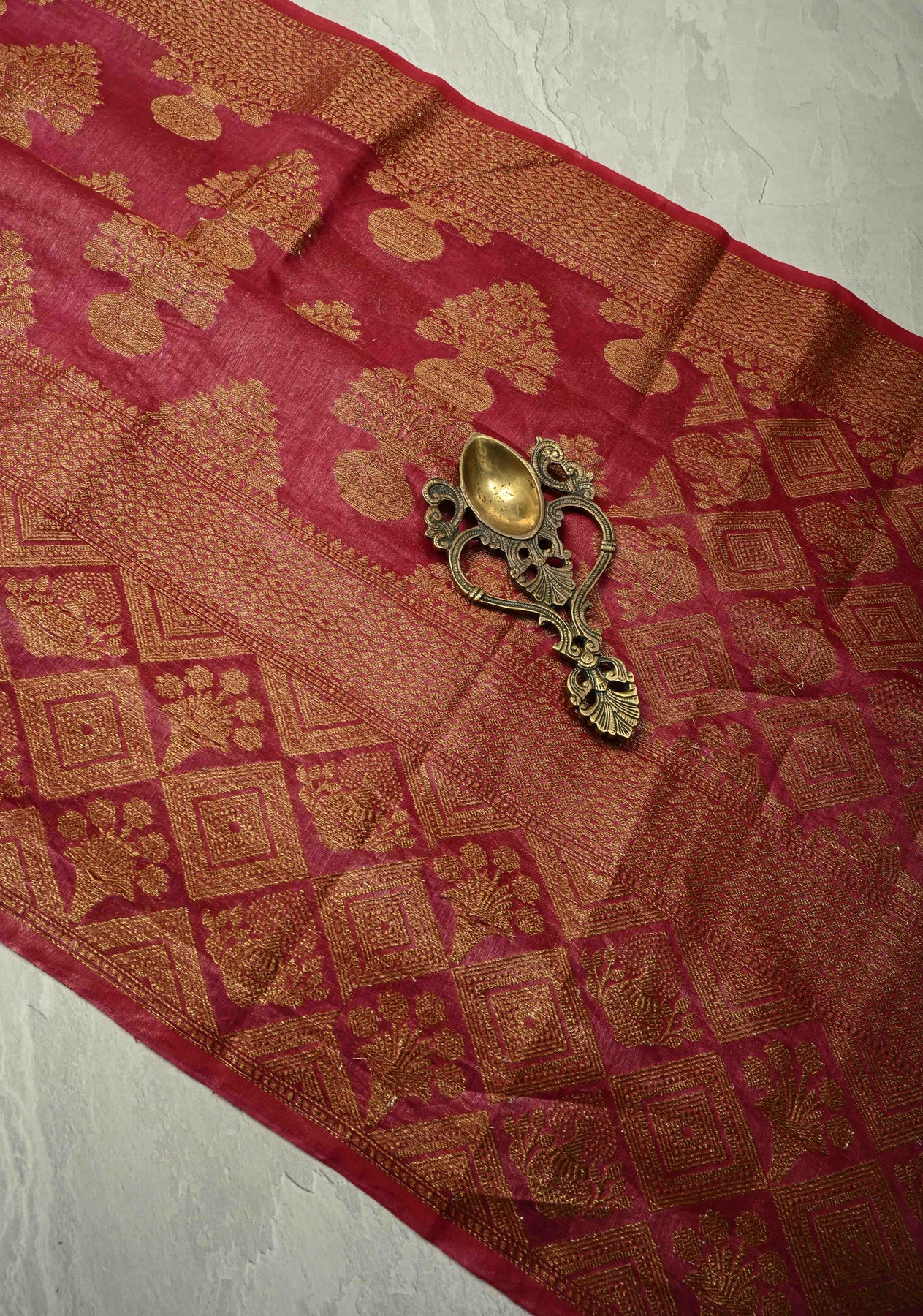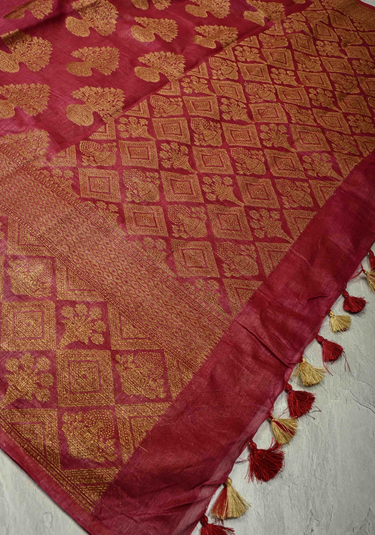 This Magenta Banarasi Linen Saree blends traditional elegance with contemporary comfort. The rich magenta hue lends a vibrant yet refined appeal, while the lightweight Banarasi linen fabric ensures a soft, breathable drape perfect for all-day wear. Delicate antique zari buttas are intricately woven across the body, adding a touch of old-world charm and subtle shimmer. The saree is beautifully framed with a matching zari border that enhances its regal look. Ideal for festive gatherings, cultural events, or elegant daytime occasions, this saree offers a perfect balance of sophistication and ease.