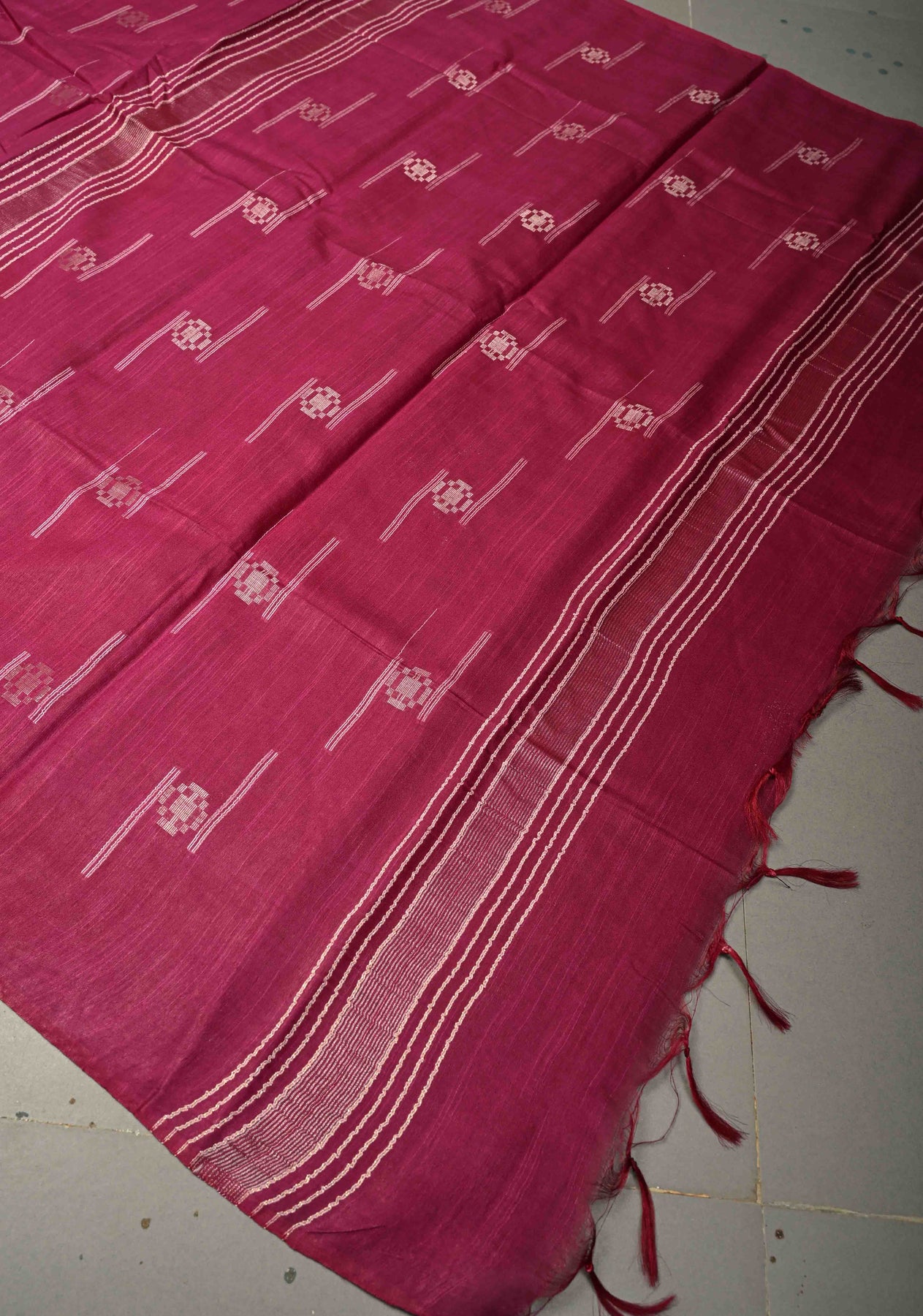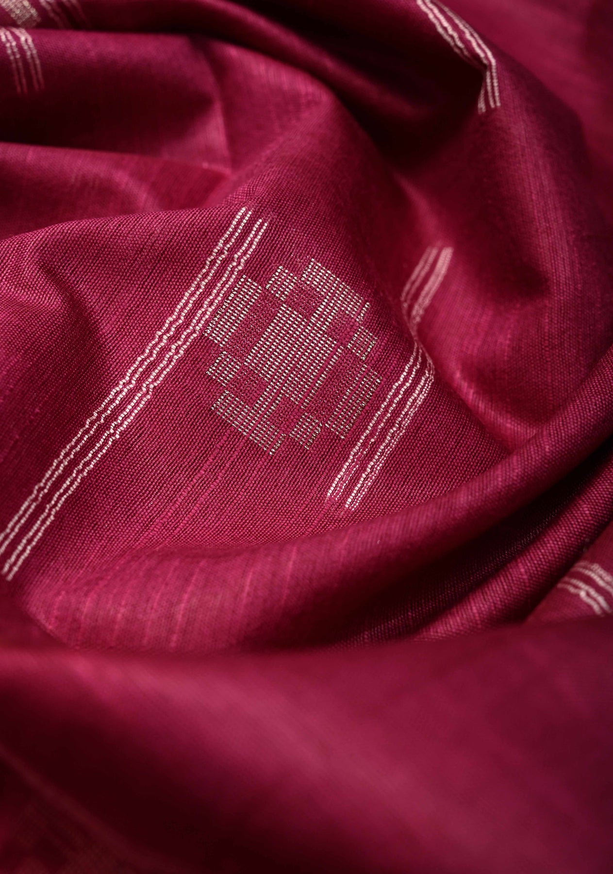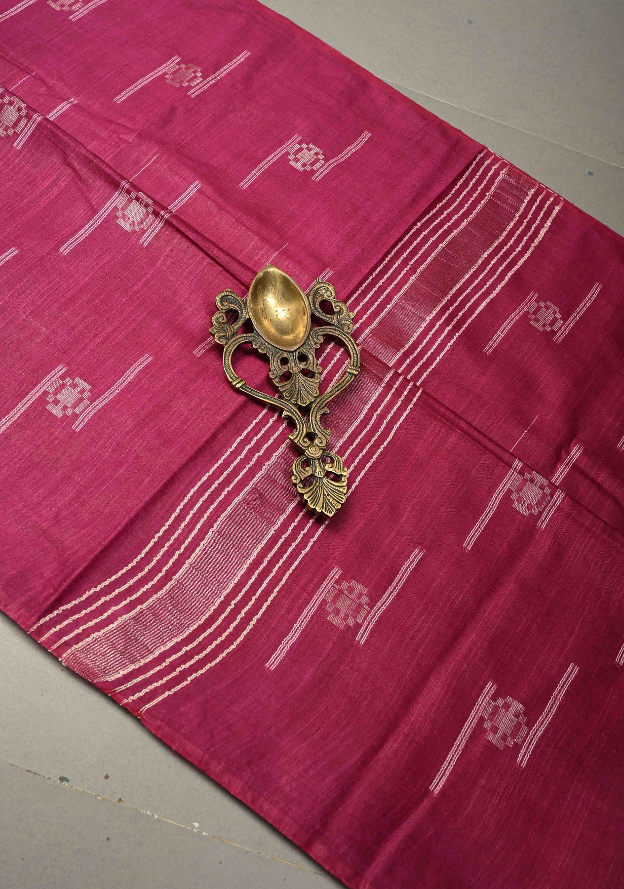 Step into modern elegance with this Magenta Borderless Semi Tussar Saree, designed for a refined contemporary look. Crafted in lightweight semi tussar silk, it features subtle thread stripes across the body, enhanced with delicate zari buttas that add understated. The borderless design lends a clean, modern silhouette, making this saree perfect for festive occasions, cultural gatherings, and stylish daytime celebrations.