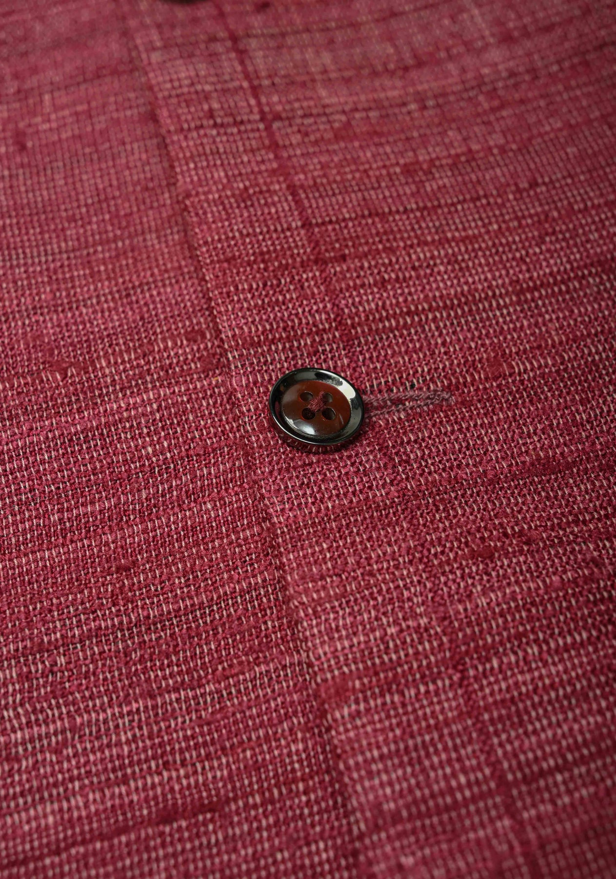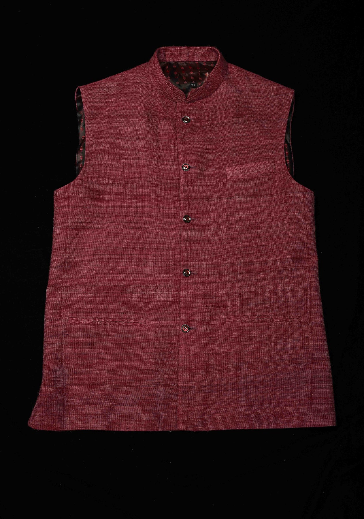 This Plum Men’s Jute Silk Nehru Jacket combines bold color with refined ethnic elegance. Crafted from jute silk, it offers a subtle sheen, lightweight comfort, and a structured fit. Featuring a classic Nehru collar, this versatile waistcoat pairs seamlessly with kurtas, shirts, or formal trousers, making it ideal for weddings, festive celebrations, or smart casual occasions. Its vibrant magenta hue ensures a striking yet sophisticated look, perfect for standing out while embracing traditional Indian craftsmanship.
