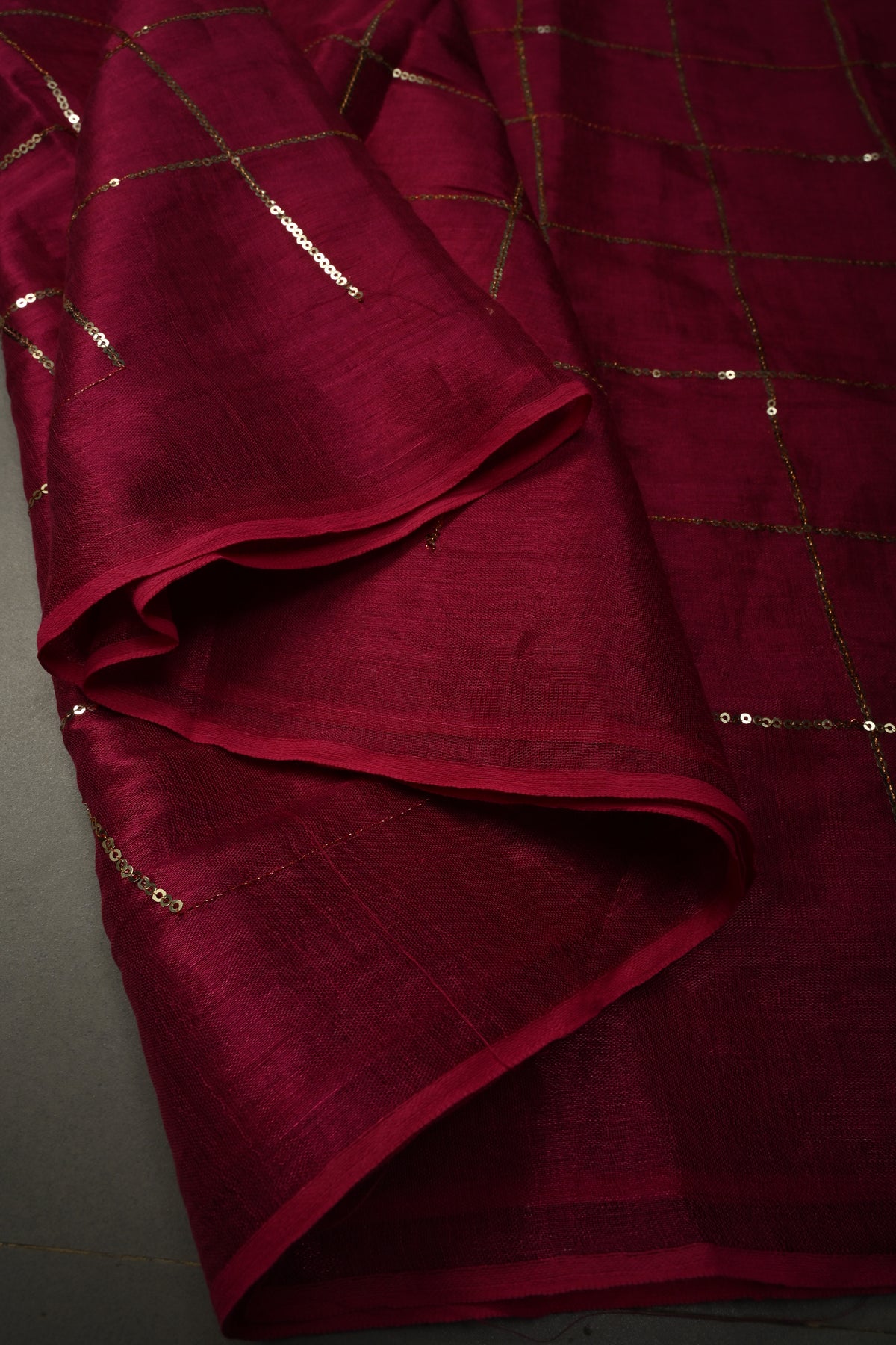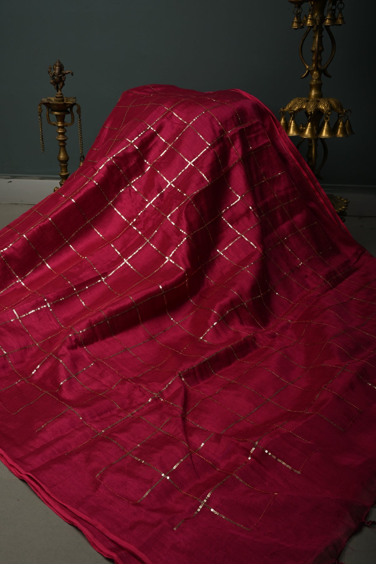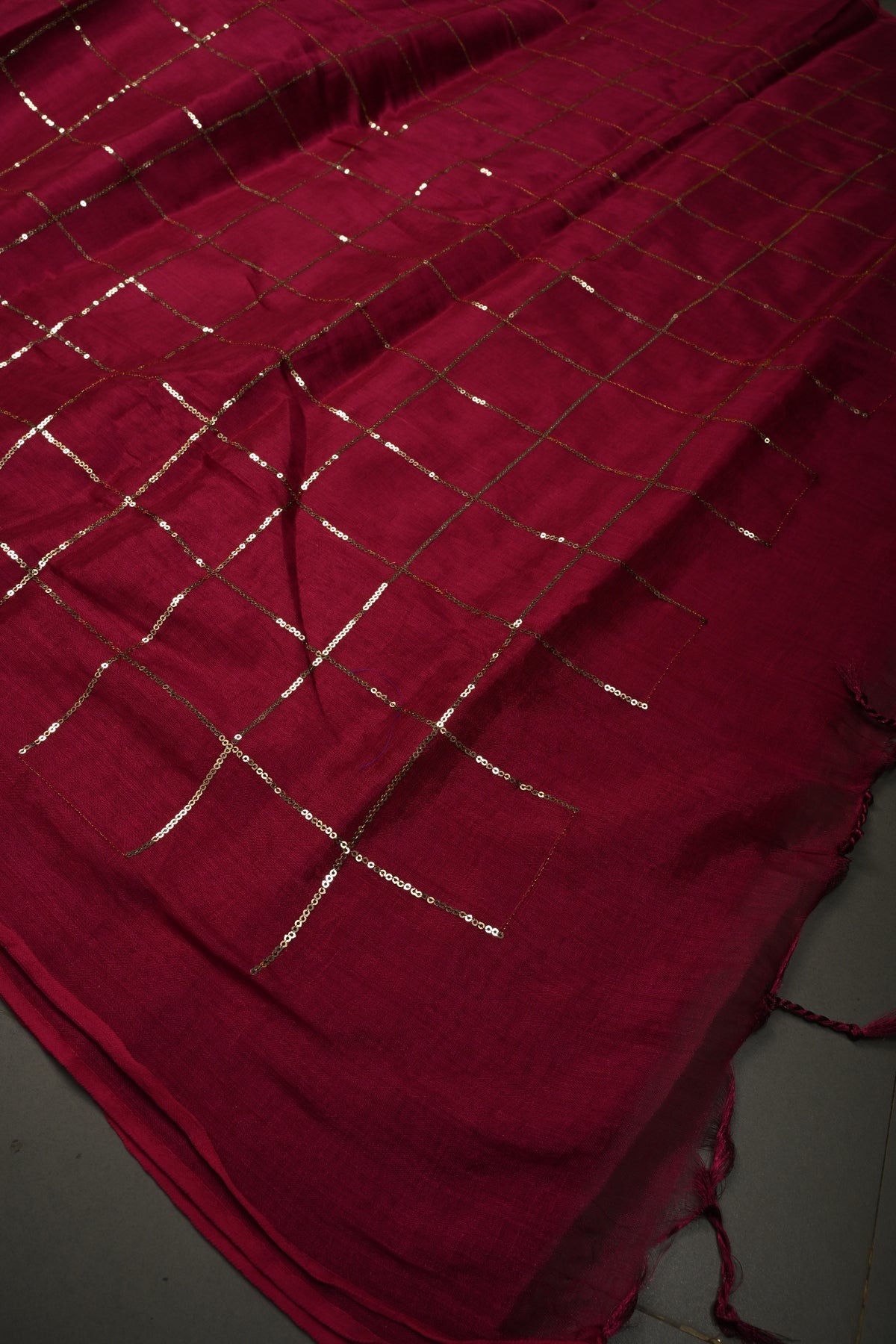 Make a bold and elegant statement with this Magenta Tissue Saree with Tikki Work and Long Tassels. Crafted from tissue fabric, this saree features a magenta hue with a natural shimmer, creating a graceful and festive drape that catches the light beautifully.