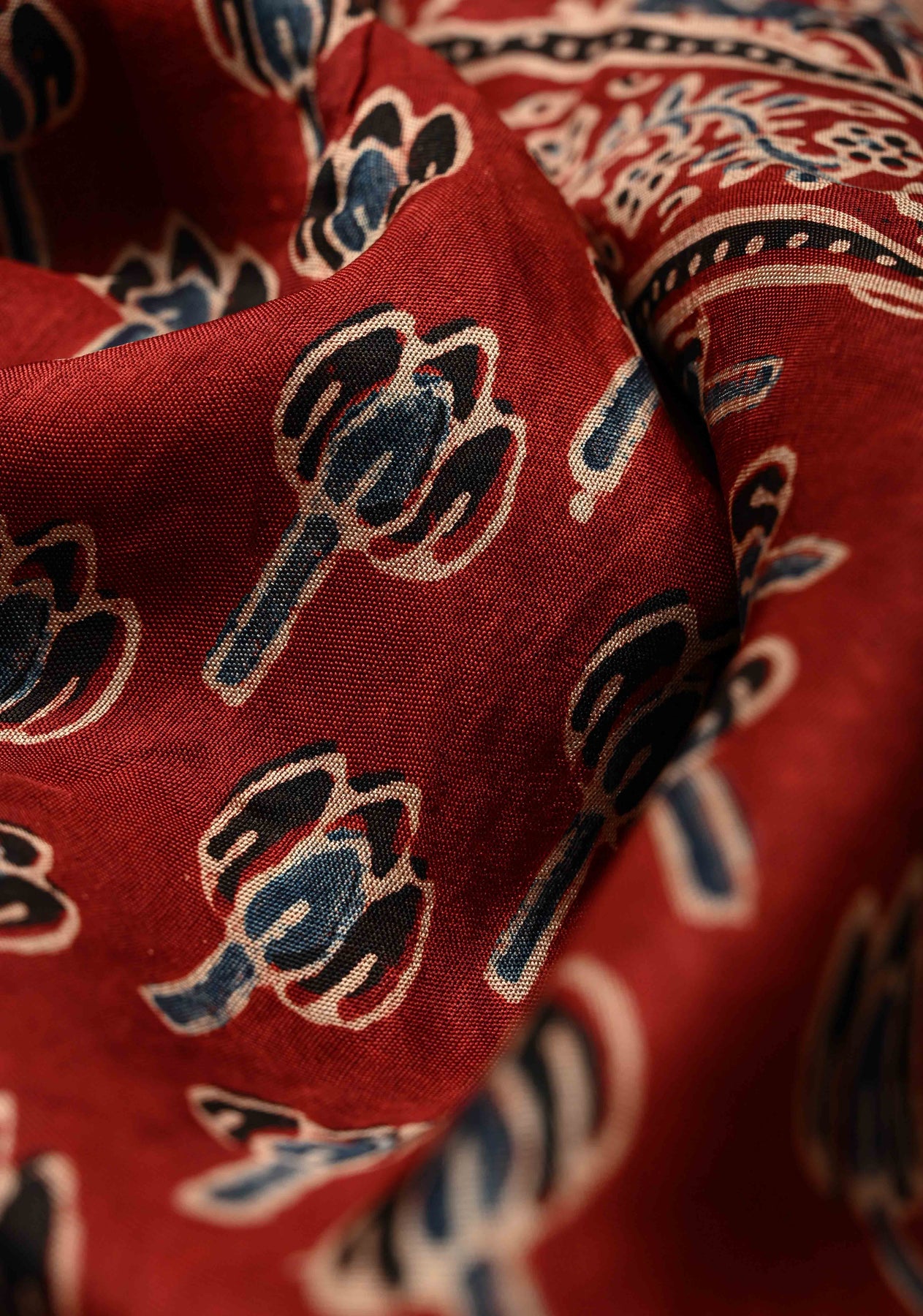Maroon Dola Silk Saree with Bagru Hand Block Print and Fancy Zari Border