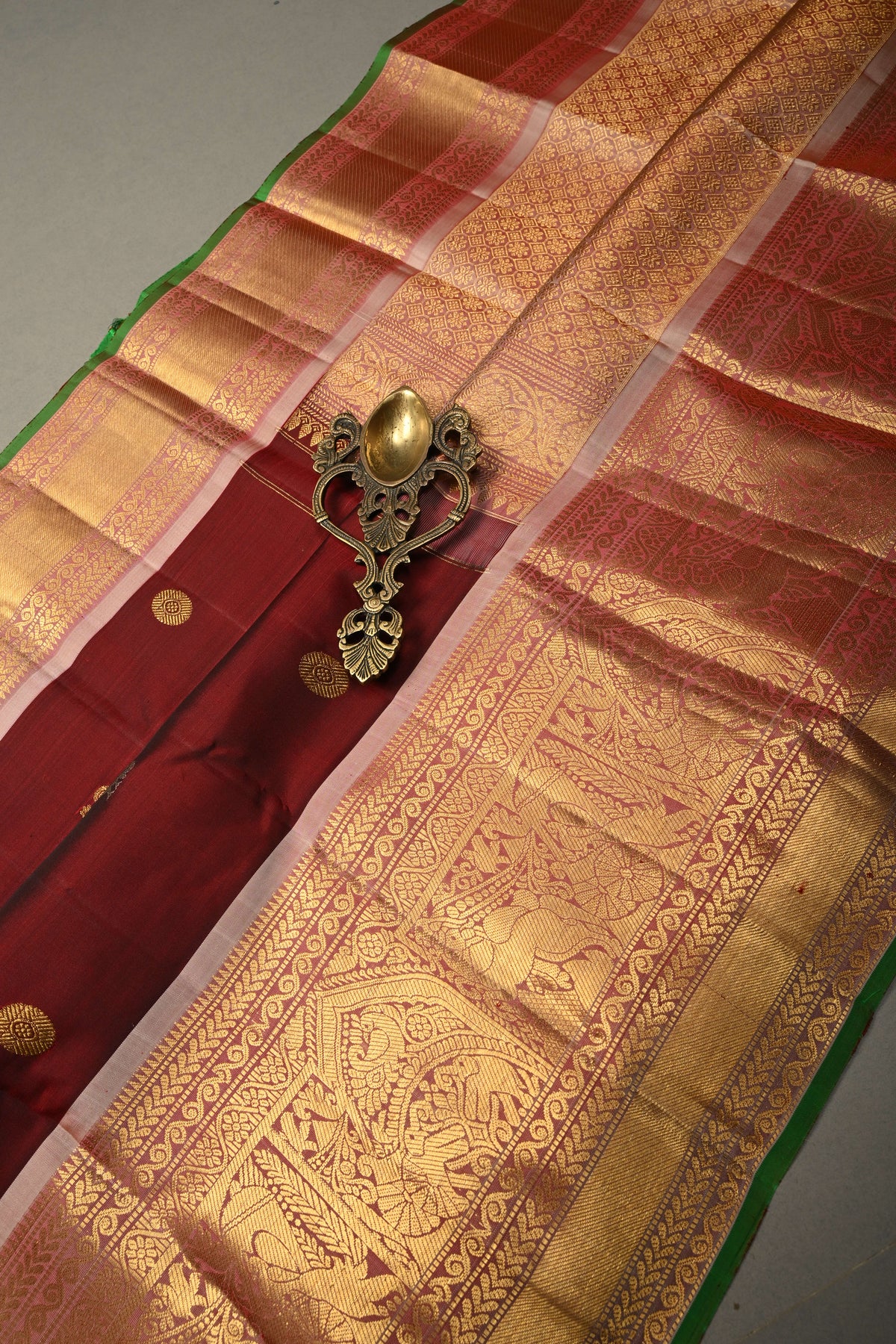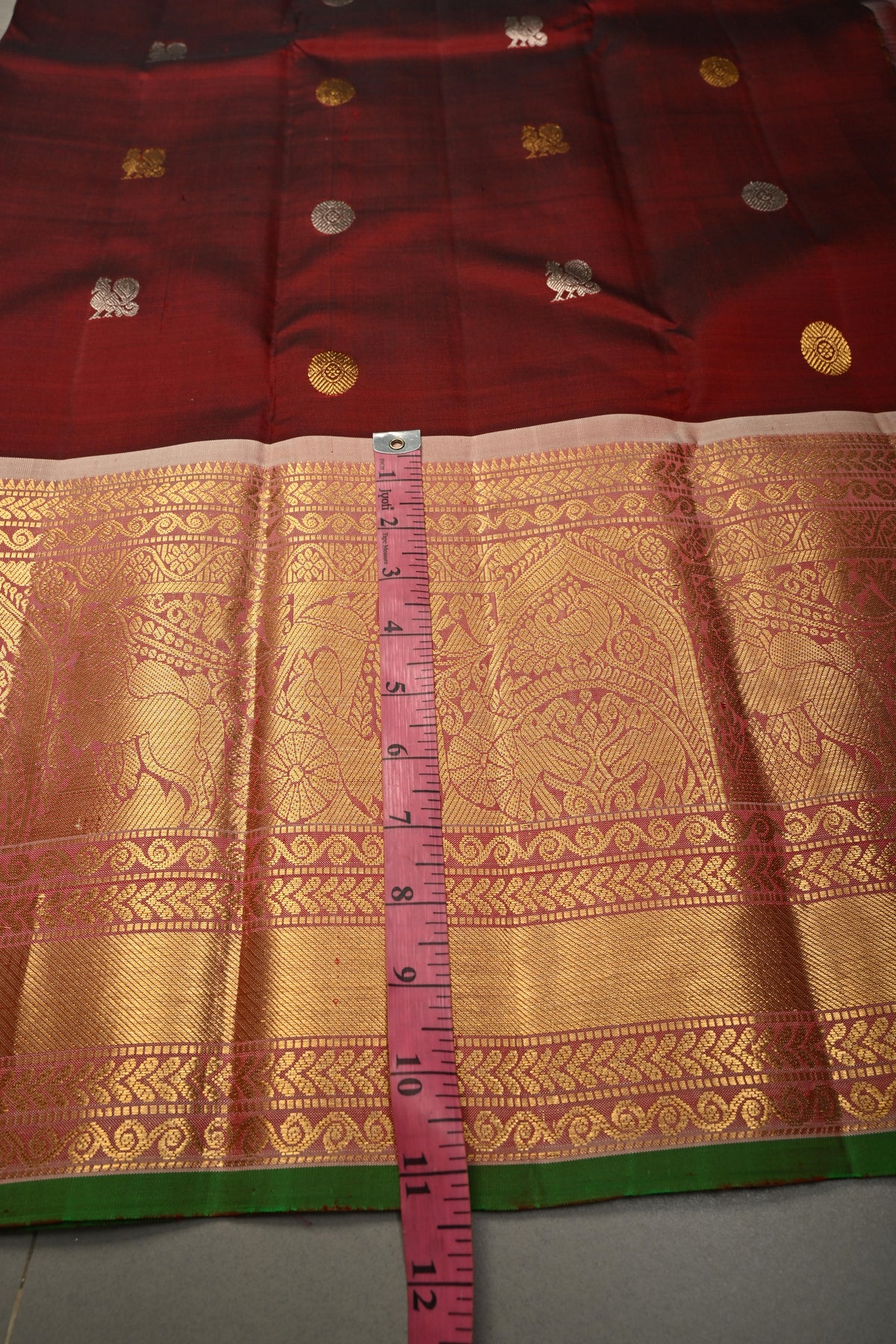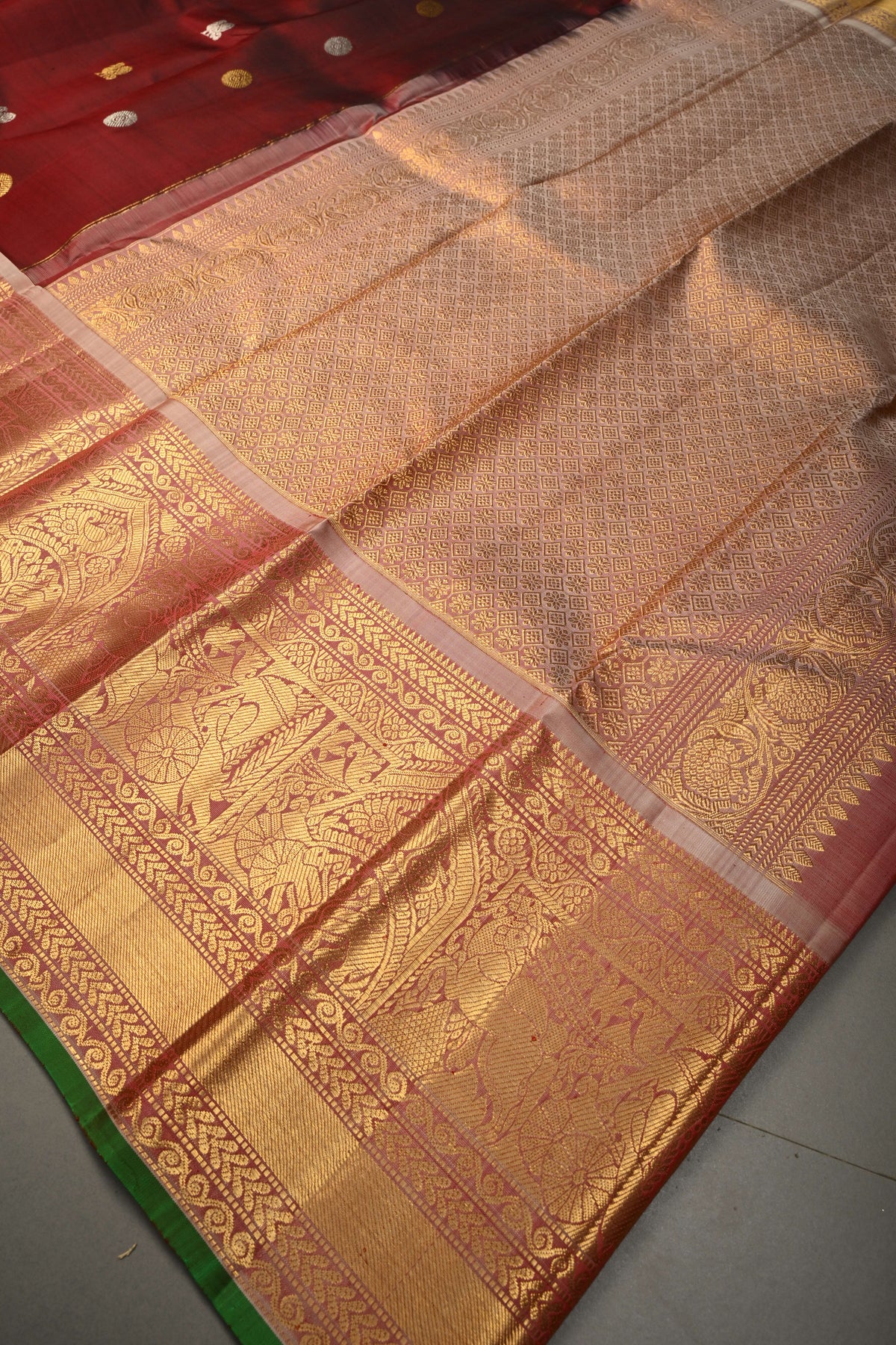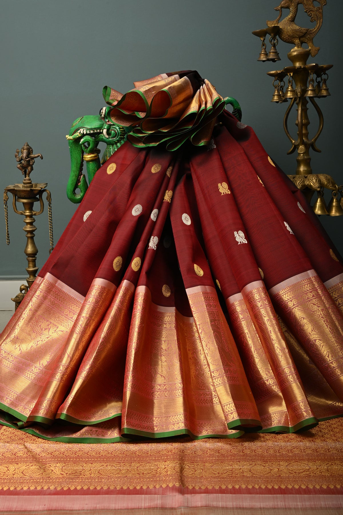 Maroon Gadwal Silk Saree with Gold-Silver Zari Buttas and Contrast Zari Border | SILK MARK CERTIFIED