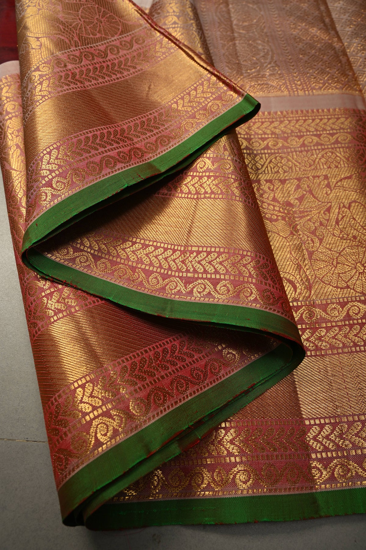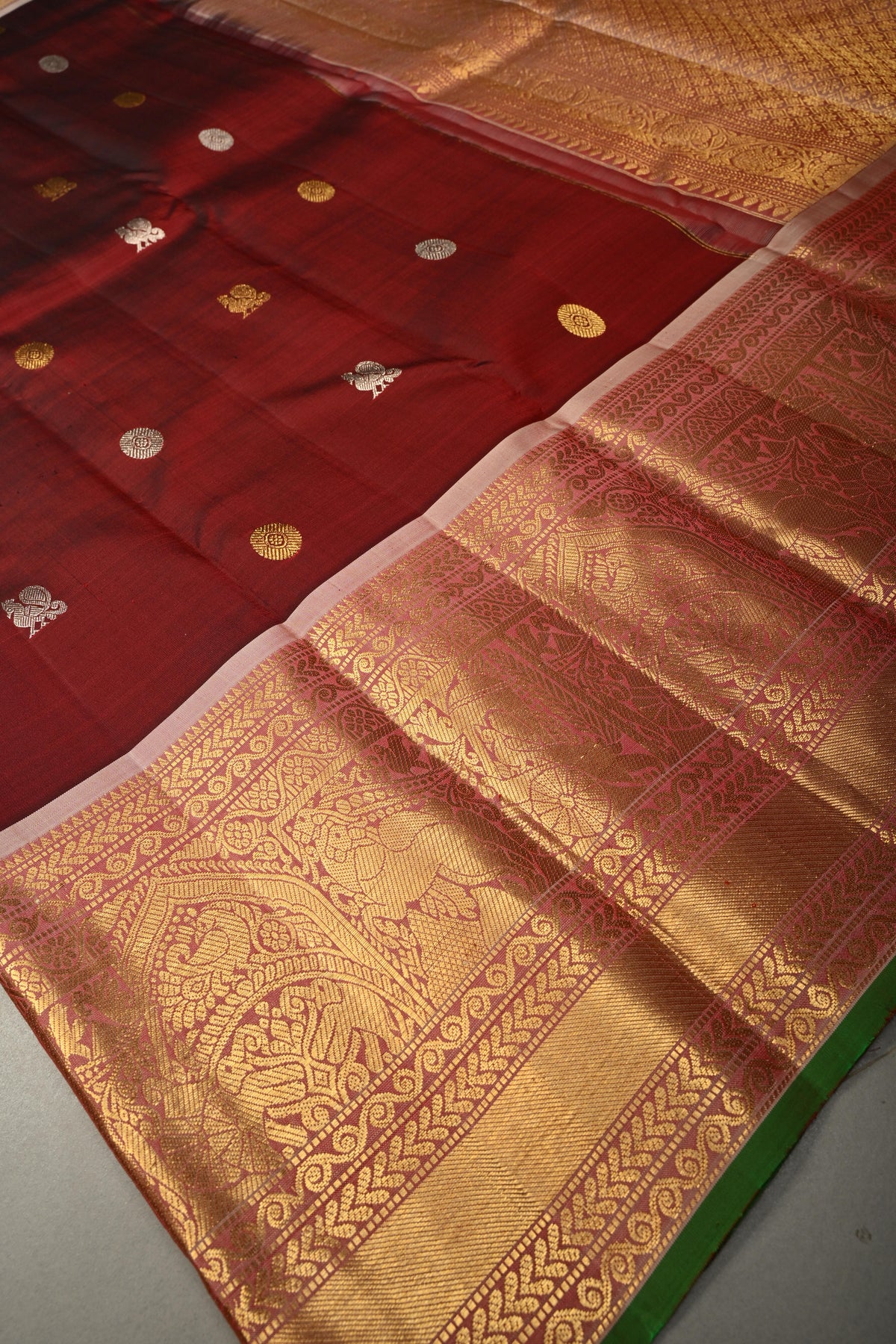 The maroon base is adorned with intricate gold-silver zari buttas, adding a refined shimmer and elegance. The beautifully woven contrast zari border enhances the saree’s grandeur, creating a striking and festive appeal.